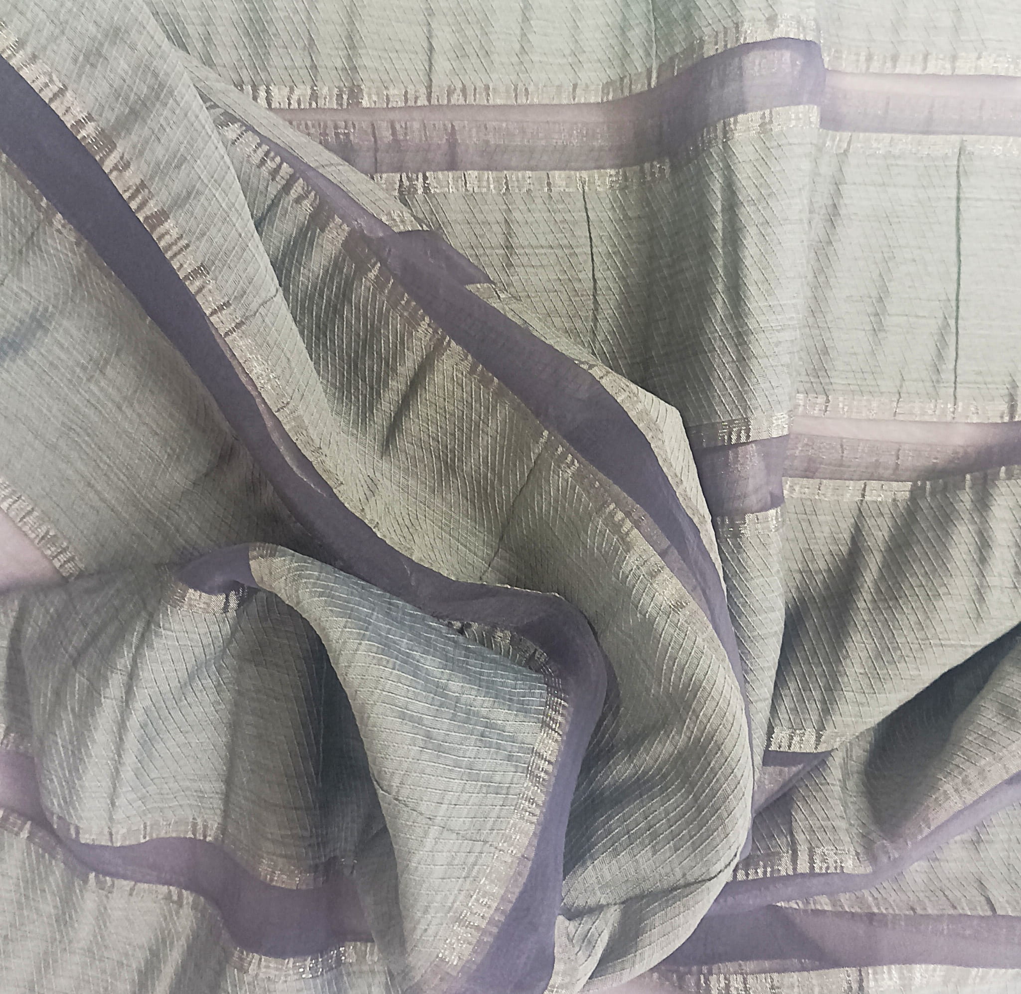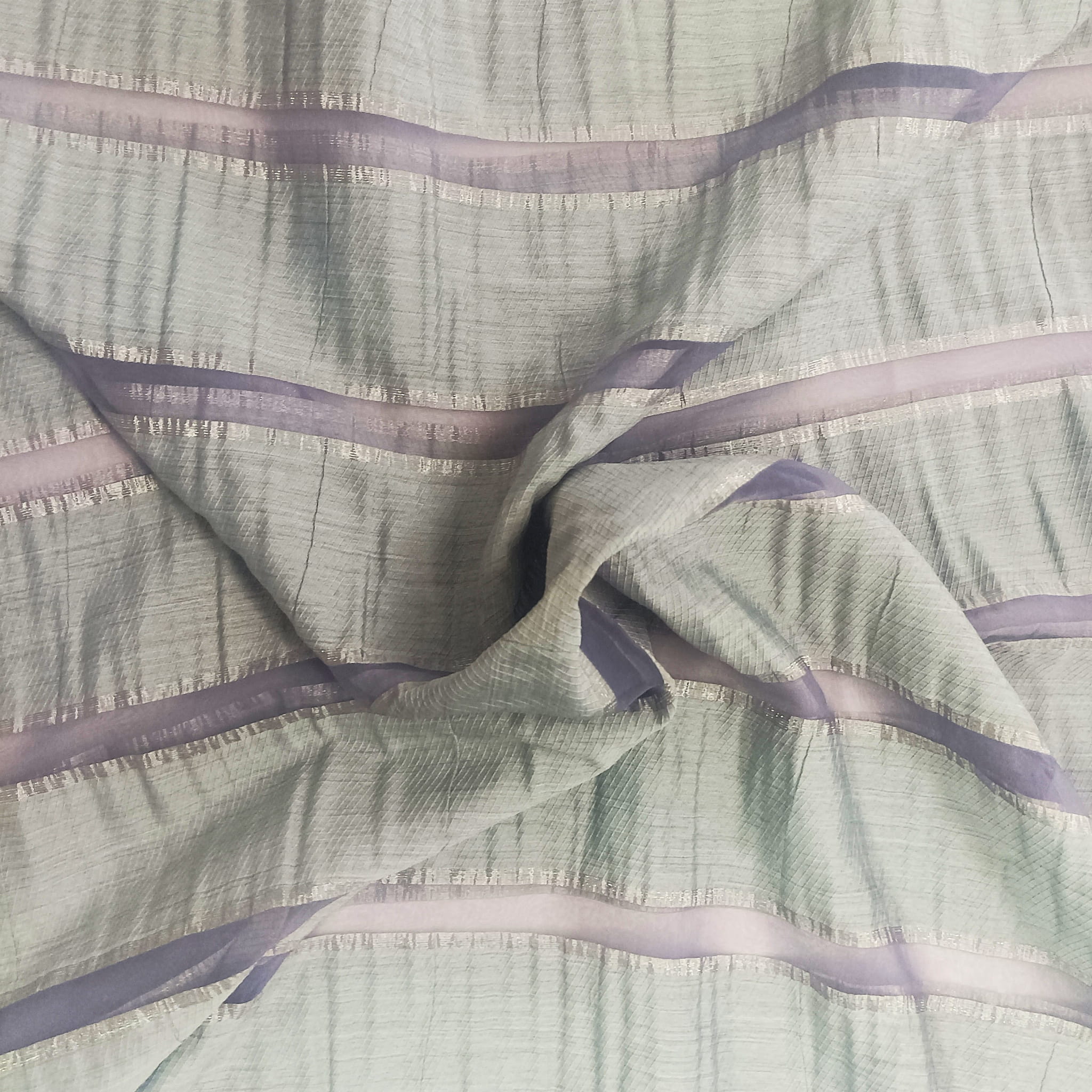 DEKORACYJNA TKANINA ZASŁONOWA MODNY WZÓR SZEROKIE POZIOME PASY W PIĘKNEJ BARWIE SZAREJ Z ELEMENTAMI PRZEZROCZYSTEJ FAKTURY W ODCIENIU BAKŁAŻANA I ZDOBIENIAMI W SREBRNYM KOLORZE SZEROKOŚĆ 180 CM PRODUCENT CHEMEKS PORAJ