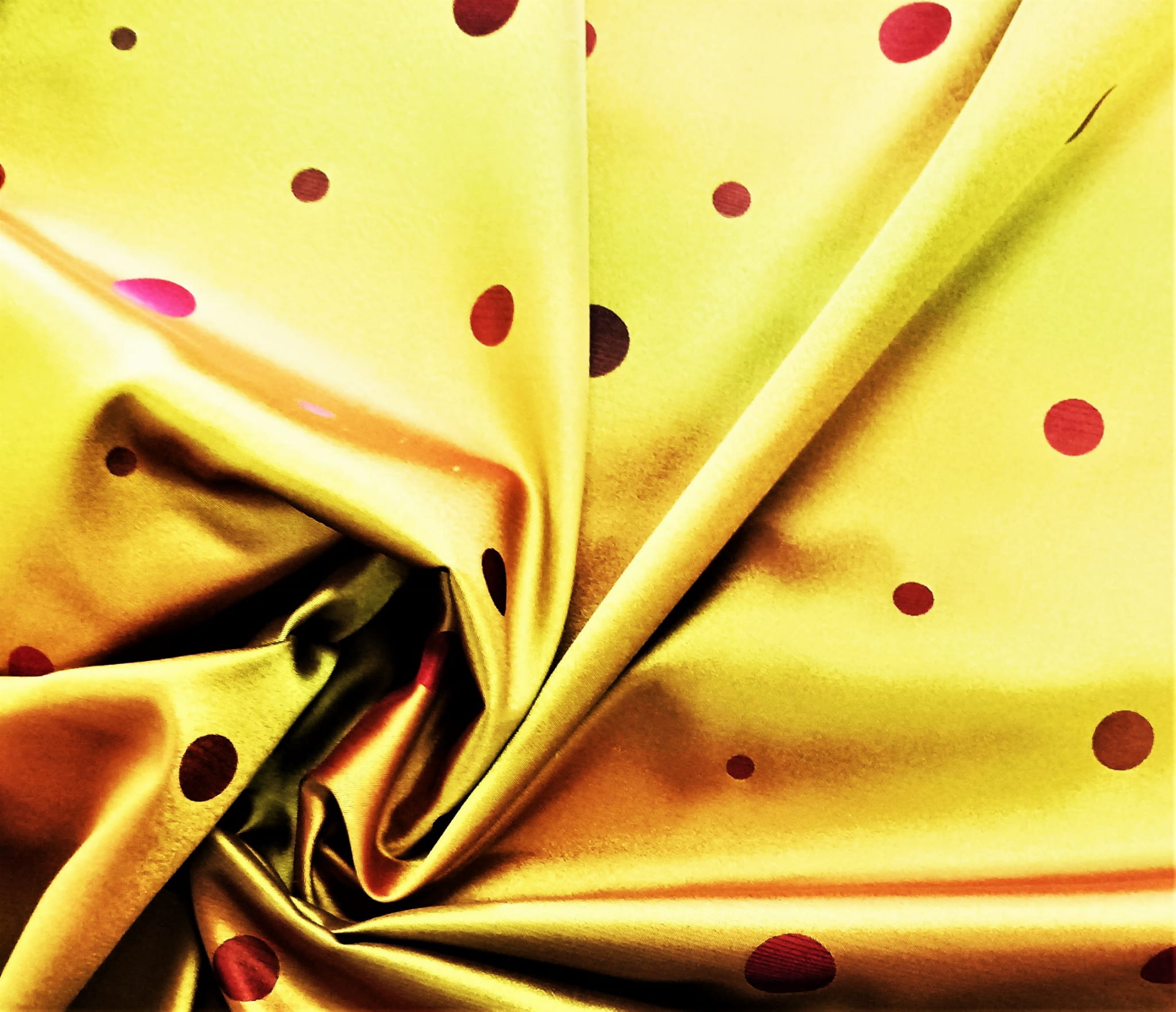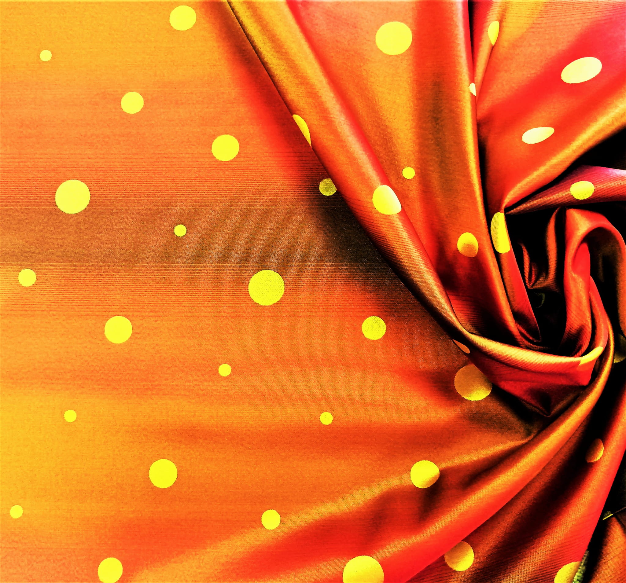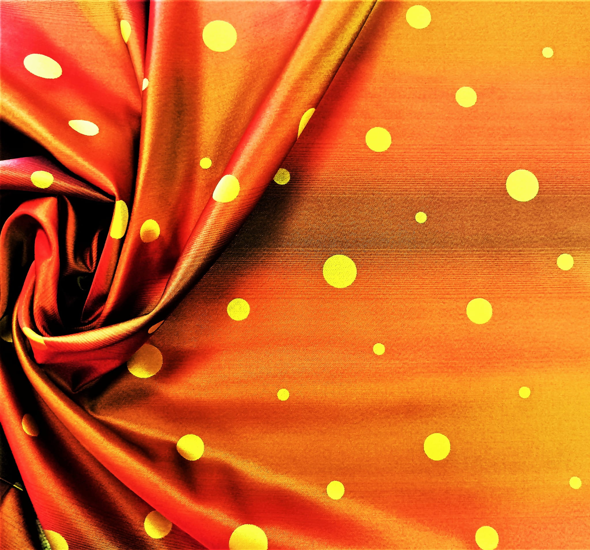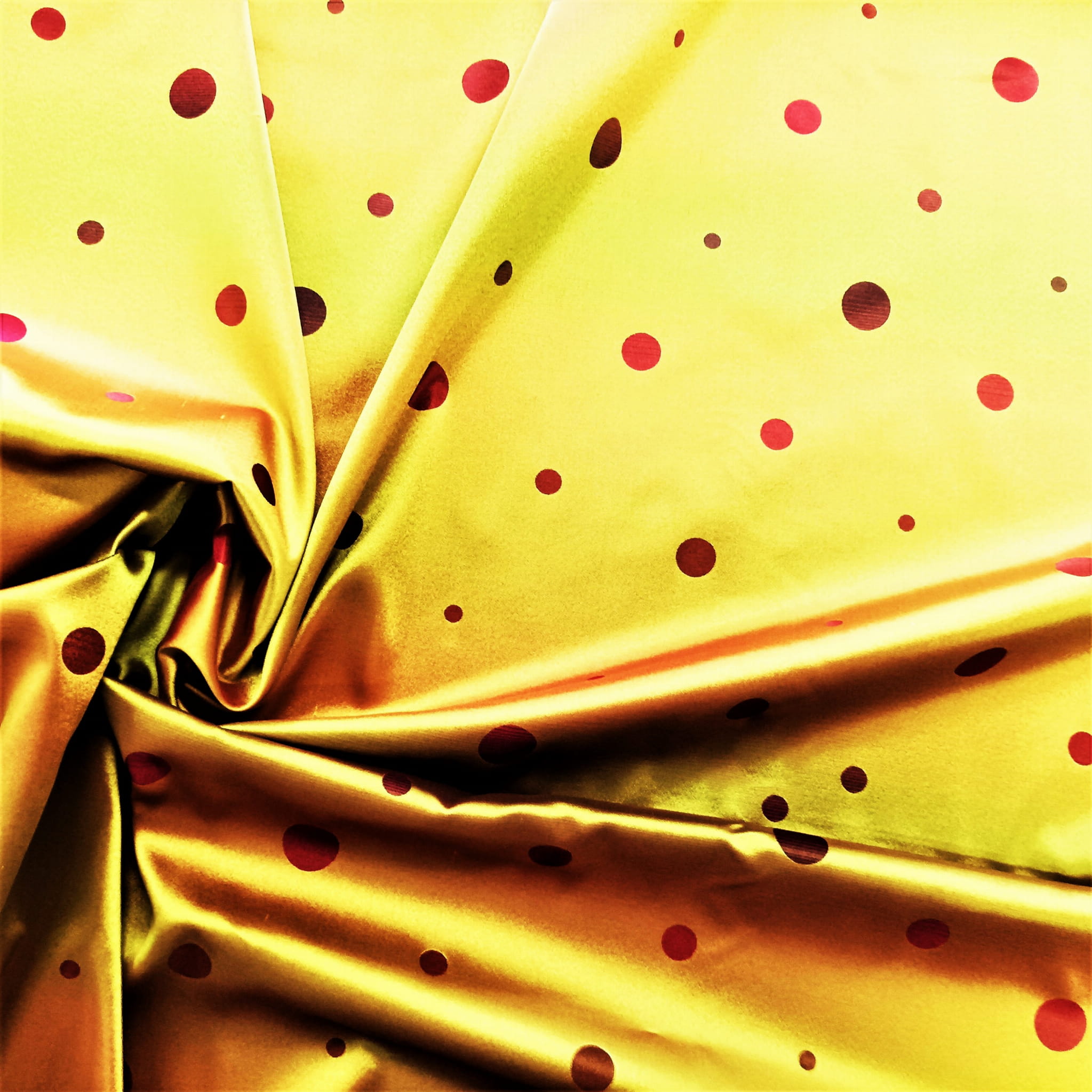 DWUSTRONNA TKANINA DEKORACYJNA WZÓR ŻÓŁTE KROPKI NA CZERWONYM DELIKATNIE CIENIOWANYM TLE ORAZ CZERWONE KROPKI NA ŻÓŁTEJ SUBTELNIE CIENIOWANEJ POWIERZCHNI ZE STONOWANYM POŁYSKIEM W STYLU GLAMOUR SZEROKOŚĆ 140 CM PRODUCENT POLONTEX CZĘSTOCHOWA