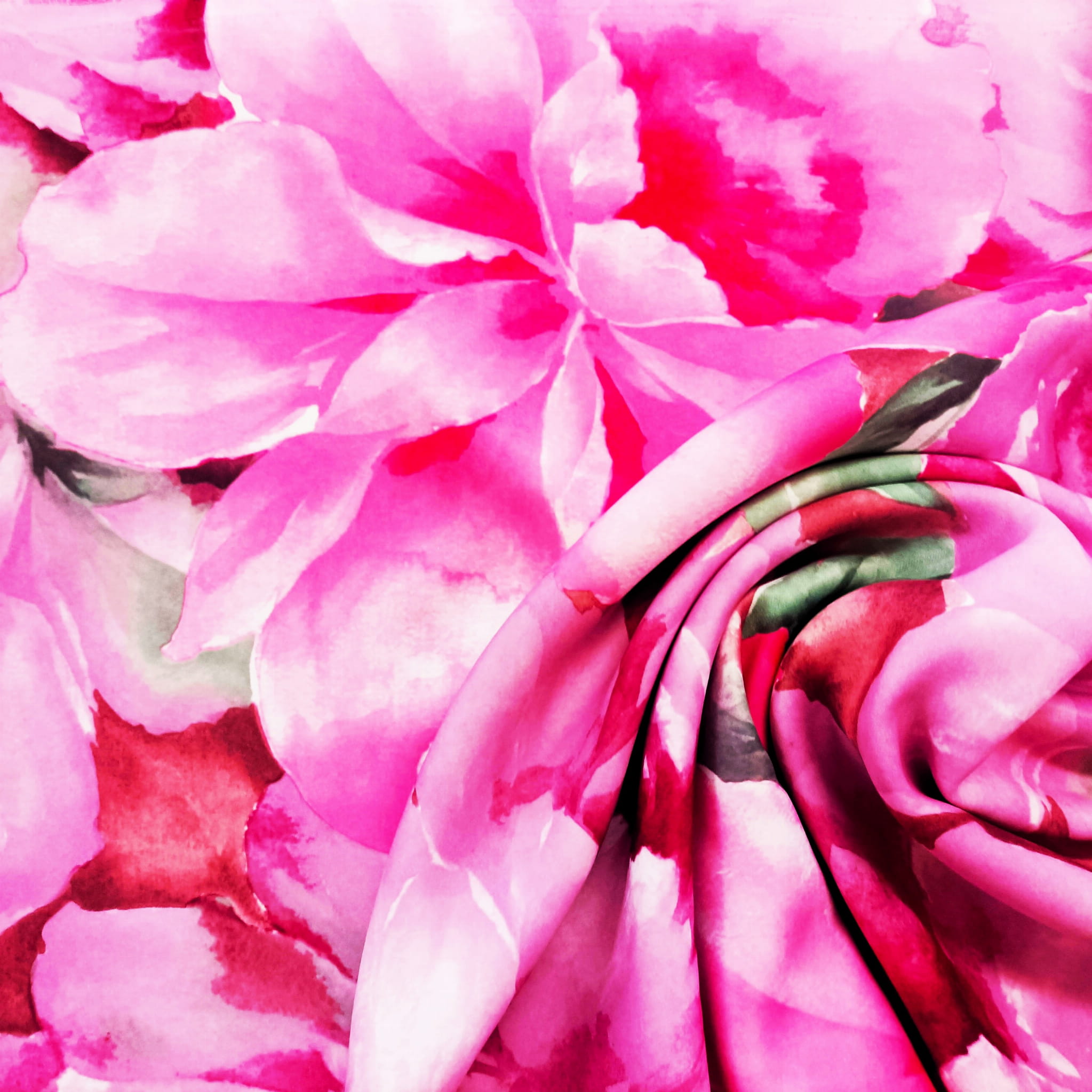EFEKTOWNA TKANINA ZASŁONOWA WZÓR FLORYSTYCZNY W POSTACI DUŻYCH KWIATÓW W PIĘKNYCH ODCIENIACH BARWY RÓŻOWEJ O ATŁASOWEJ STRUKTURZE Z POŁYSKIEM GLAMOUR SZEROKOŚĆ 140 CM PRODUCENT MDM FIRANY