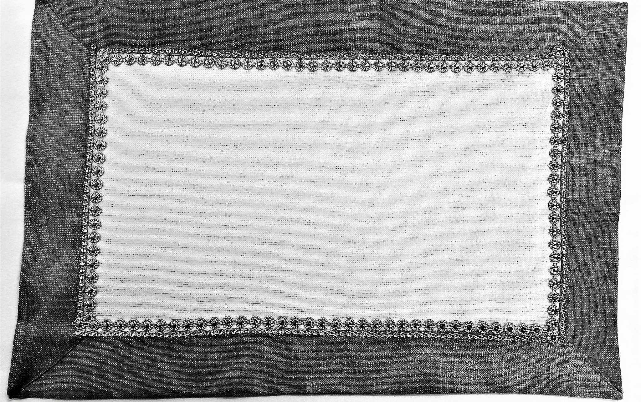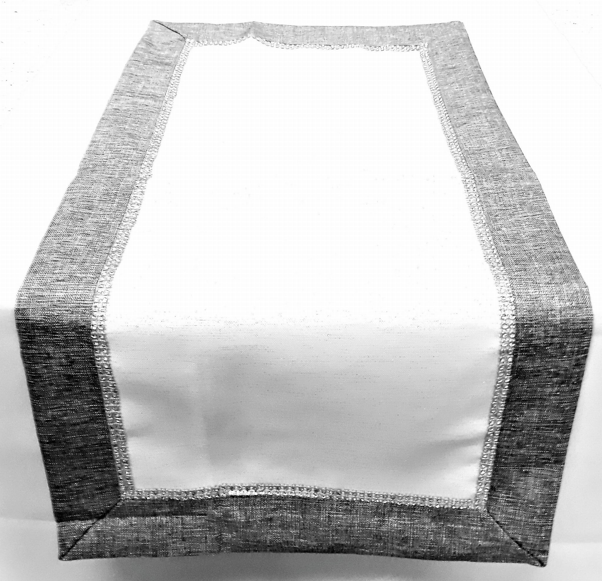 EFEKTOWNY BIEŻNIK GLAMOUR KOLOR BIAŁY ZE SREBRNĄ NITKĄ DELIKATNY BŁYSK Z SZEROKĄ MANSZETĄ W BARWIE MODNEJ SZAROŚCI OZDOBIONY ORYGINALNĄ APLIKACJĄ CYRKONIOWĄ W SREBRNEJ TONACJI TO ELEGANCKA I JEDNOCZEŚNIE STYLOWA OZDOBA STOŁU. KLASYCZNA W SWOJEJ FORMIE, GUSTOWNA APLIKACJA Z CYRKONIAMI STANOWI PEŁNĄ FINEZJI DEKORACJĘ I NADAJE WNĘTRZU WYSZUKANEGO KLIMATU. ELEGANCJA DESIGNU ORAZ PERFEKCYJNE WYKONANIE STANOWIĄ O WYJĄTKOWYM CHARAKTERZE STOŁOWEJ ARANŻACJI.