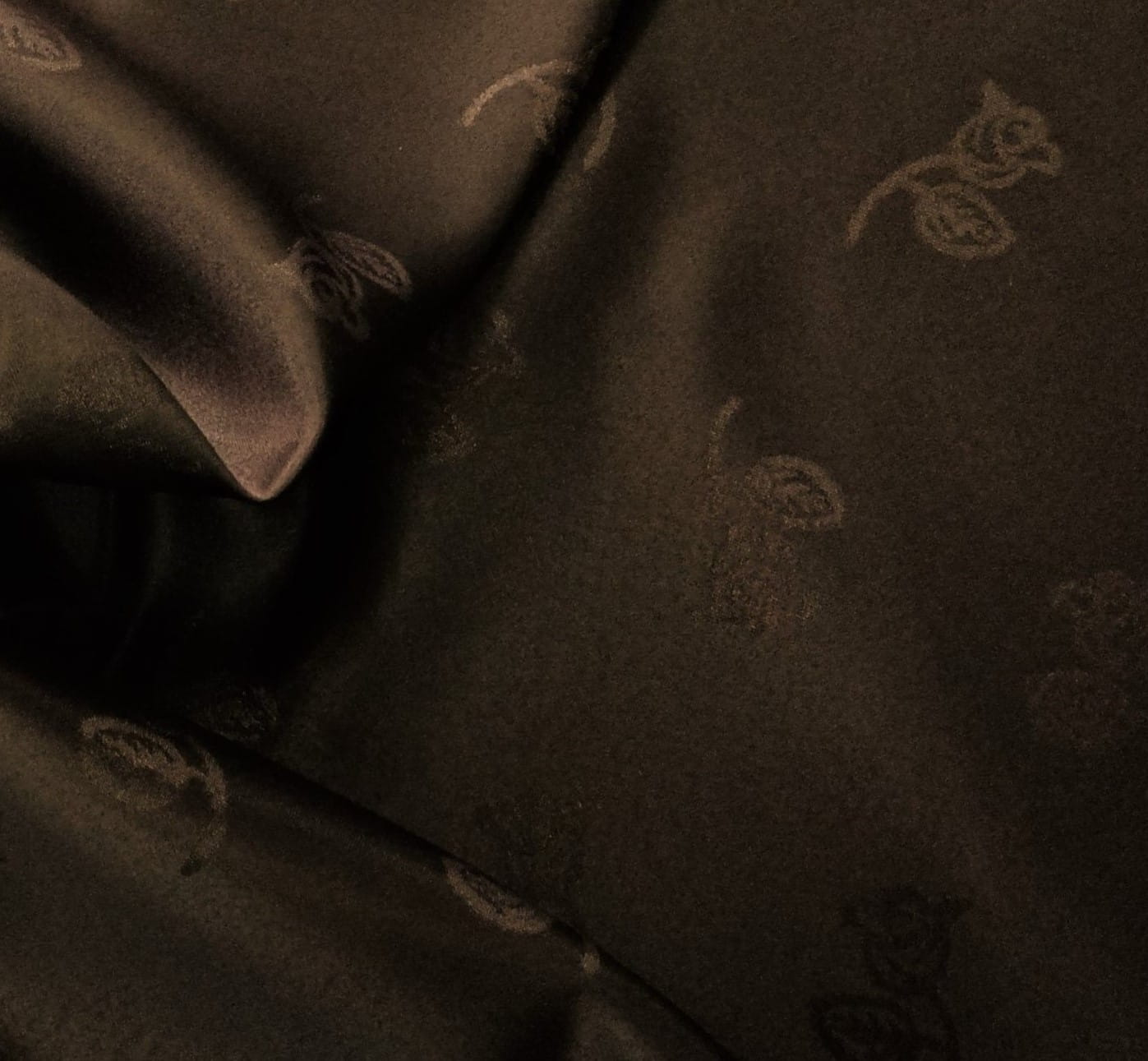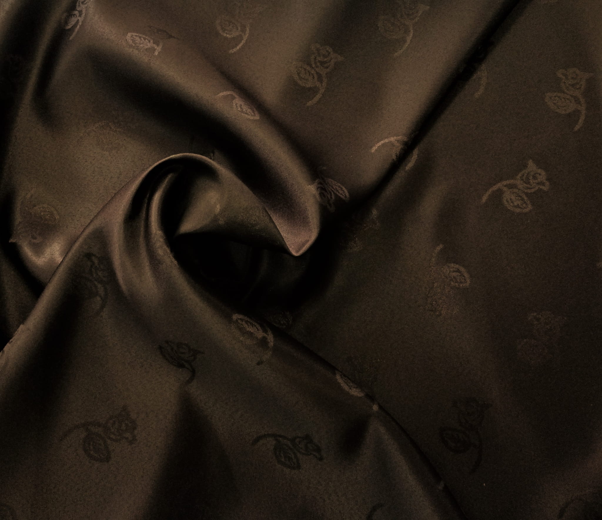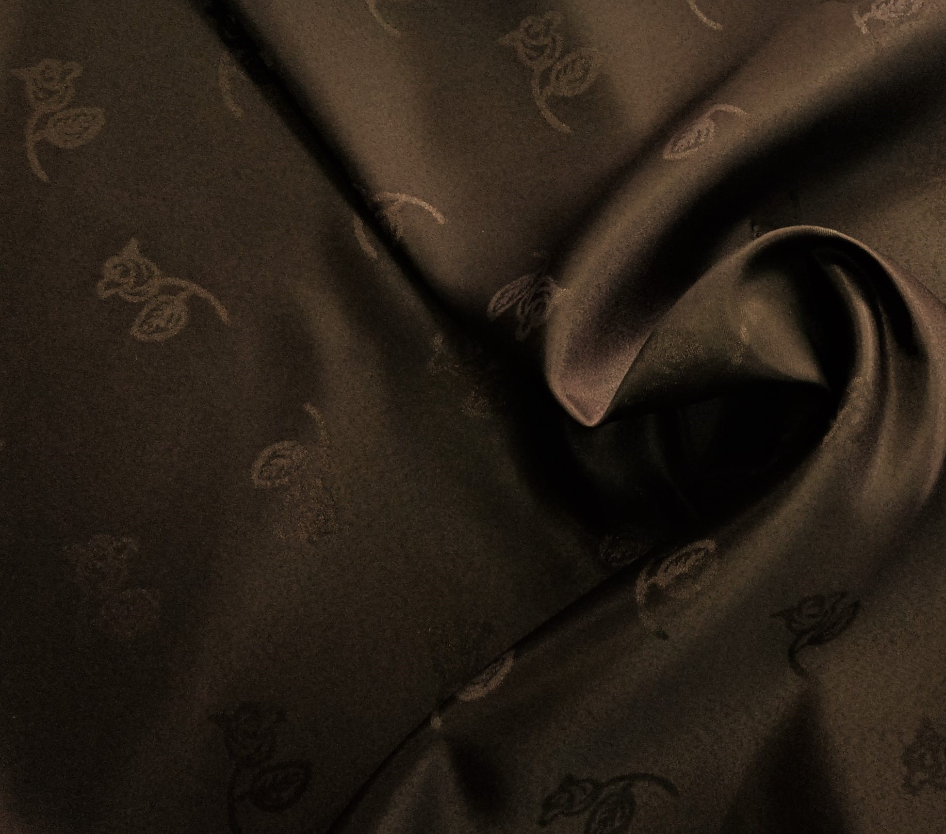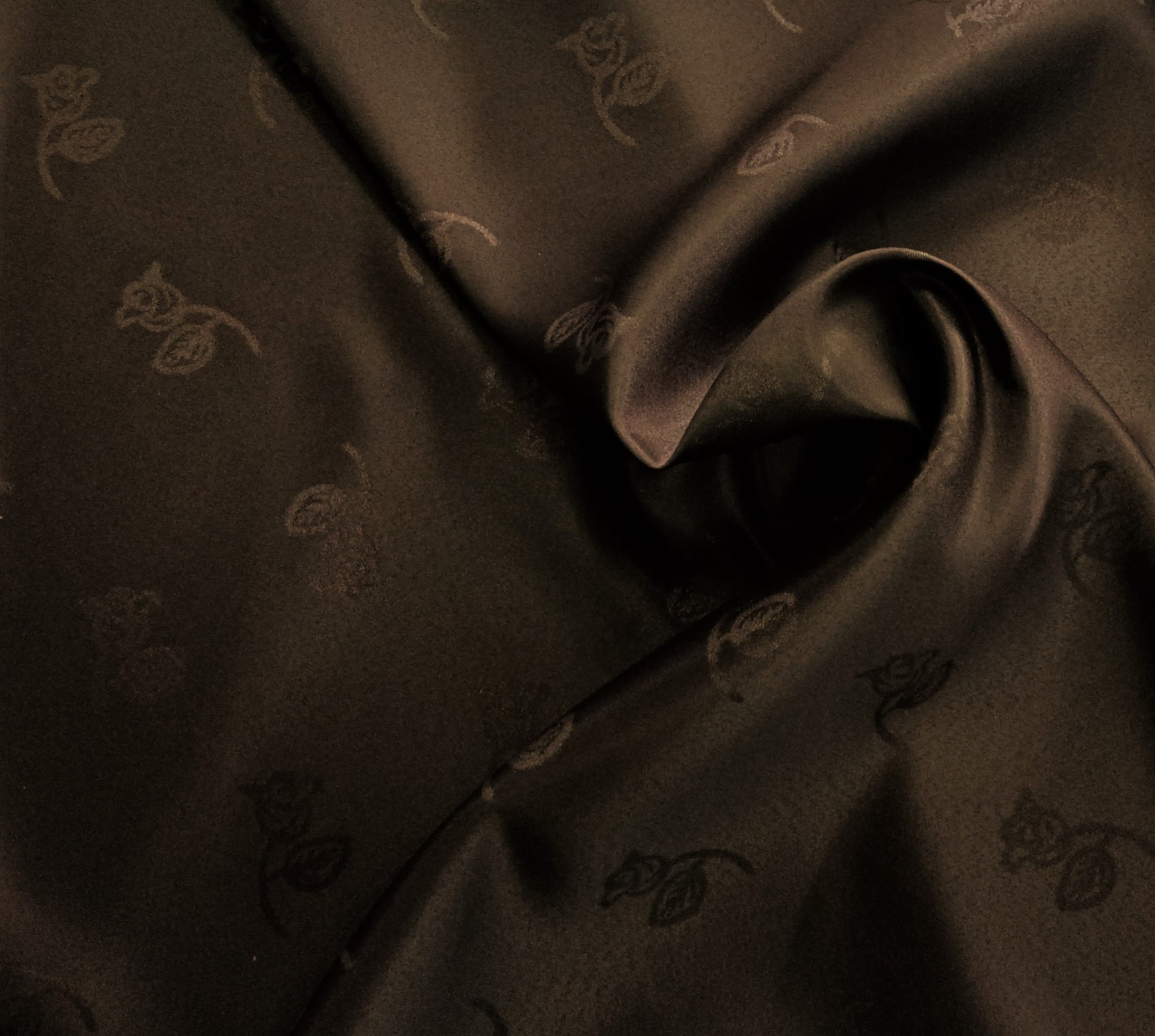 ELEGANCKA DWUSTRONNA TKANINA ZASŁONOWA W PIĘKNEJ BARWIE GORZKIEJ CZEKOLADY Z ORYGINALNYM SUBTELNIE WIDOCZNYM WZOREM W POSTACI MISTERNYCH KWIATUSZKÓW DELIKATNY POŁYSK GLAMOUR SZEROKOŚĆ 170 CM PRODUCENT POLONTEX CZĘSTOCHOWA