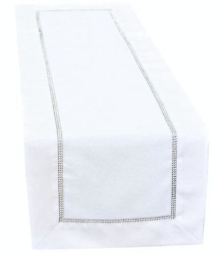 ELEGANCKI BIEŻNIK Z IMPREGNACJĄ PLAMOODPORNĄ KOLOR BIAŁY Z SUBTELNYM POŁYSKIEM GLAMOUR ZDOBIONY SREBRNĄ NITKĄ I FINEZYJNĄ APLIKACJĄ CYRKONIOWĄ W SREBRNEJ TONACJI