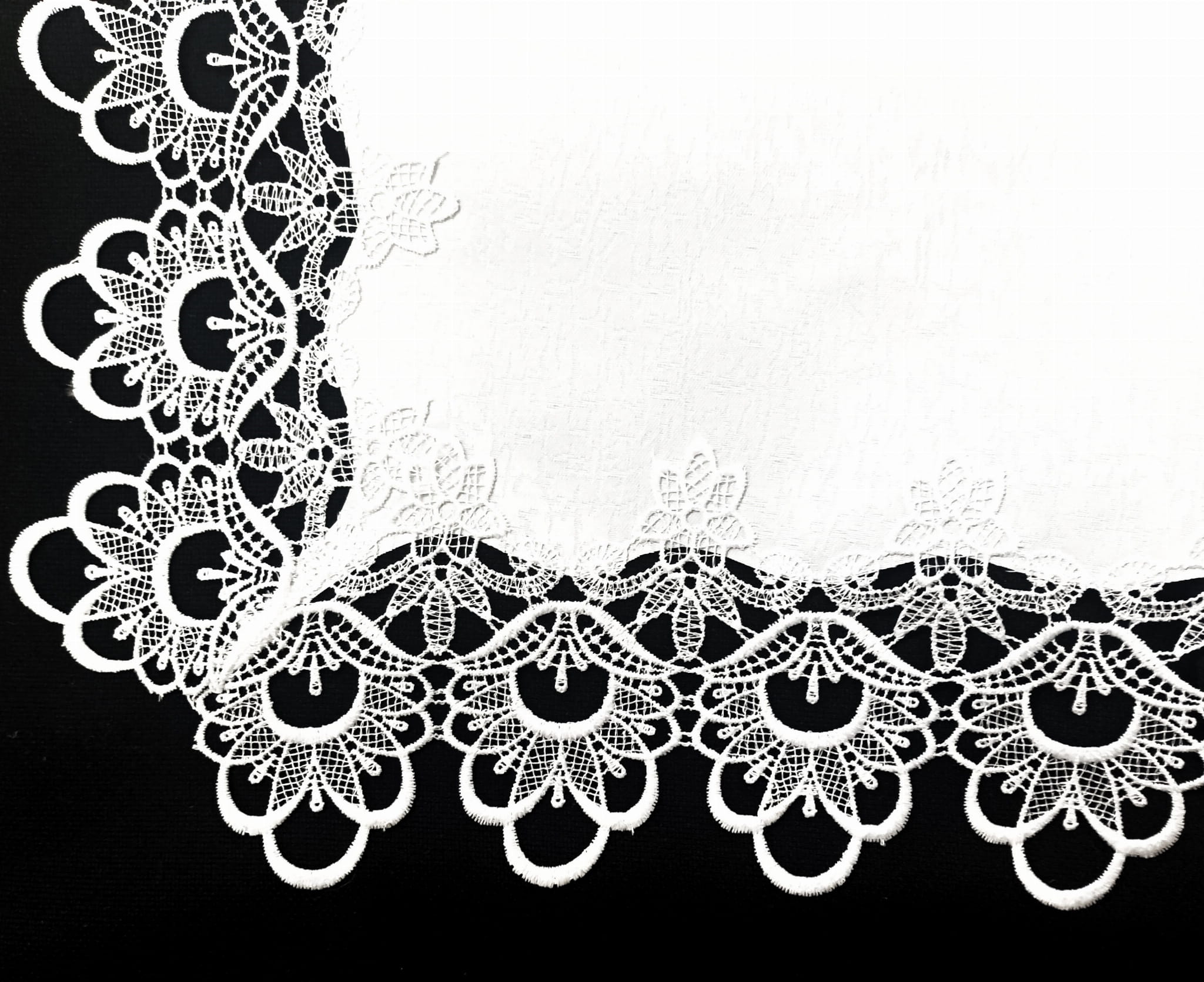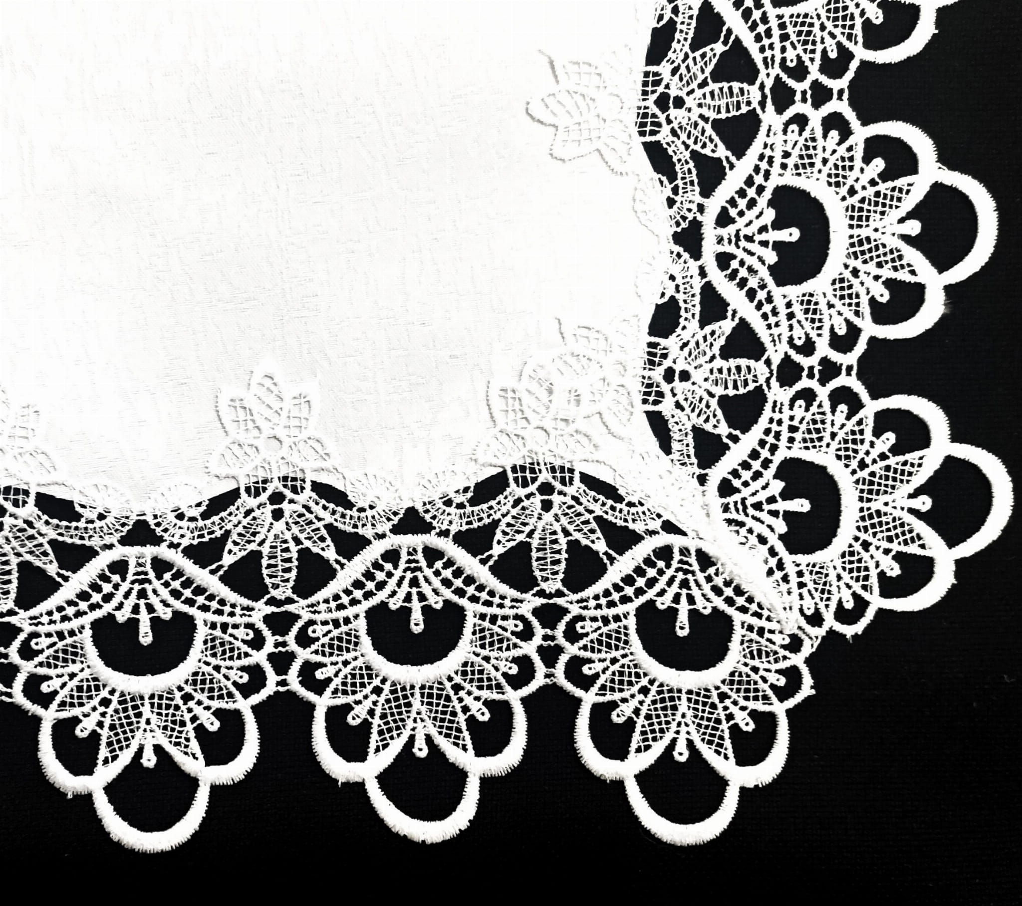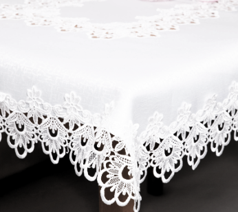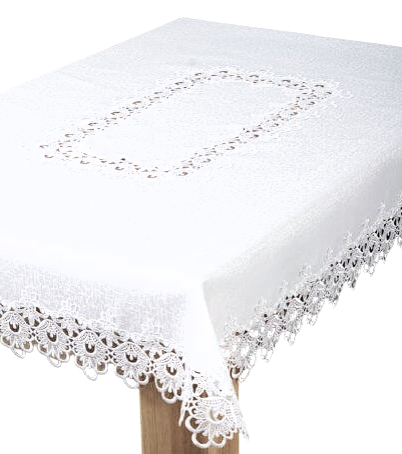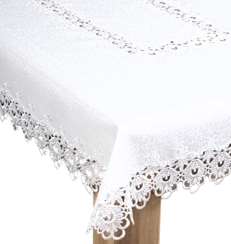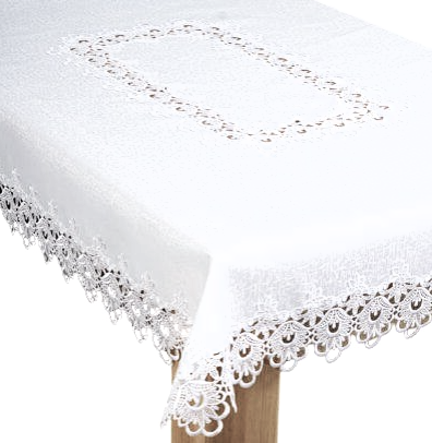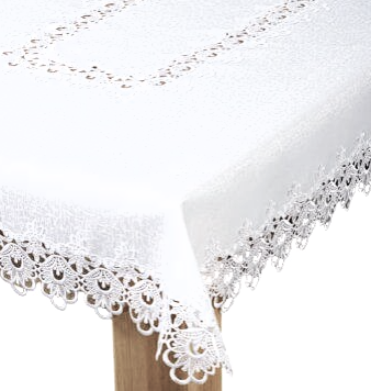 ELEGANCKI OBRUS W KOLORZE BIAŁYM WYKONANY Z WYSOKIEJ KLASY TKANINY PLAMOODPORNEJ Z OBSZYCIAMI Z EFEKTOWNEJ GIPIURY ORAZ ZDOBIENIAMI GIPIUROWYMI NA ŚRODKU