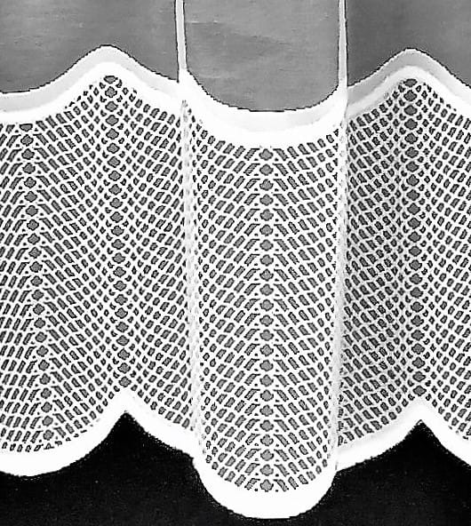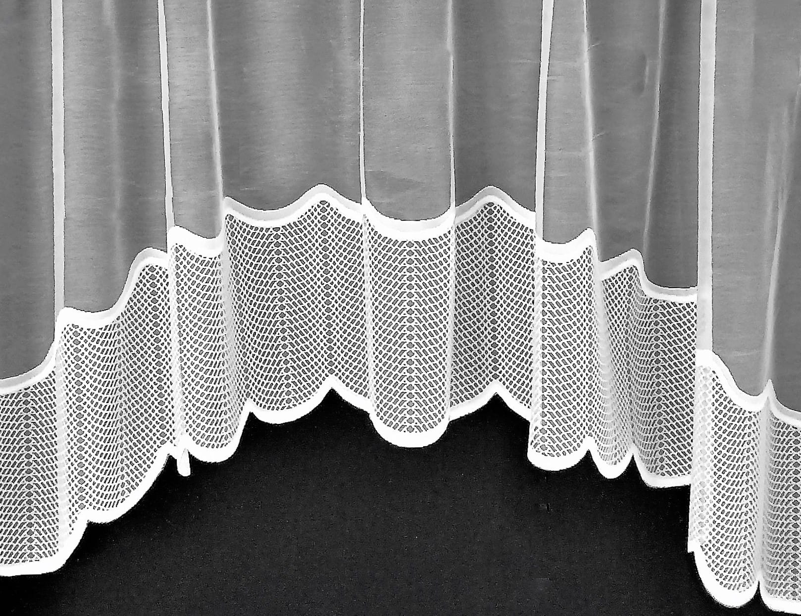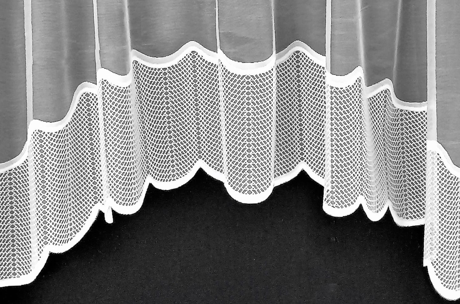 GOTOWA FIRANA Z ŻAKARDU W BIAŁYM KOLORZE Z PIĘKNIE WYCIĘTYM DOŁEM ORAZ DWOMA SZEROKIMI SZLAKAMI O STRUKTURZE SUBTELNEJ SIATECZKI Z EFEKTEM DELIKATNEJ FALI WYSOKOŚĆ 160 CM SZEROKOŚĆ 320 CM