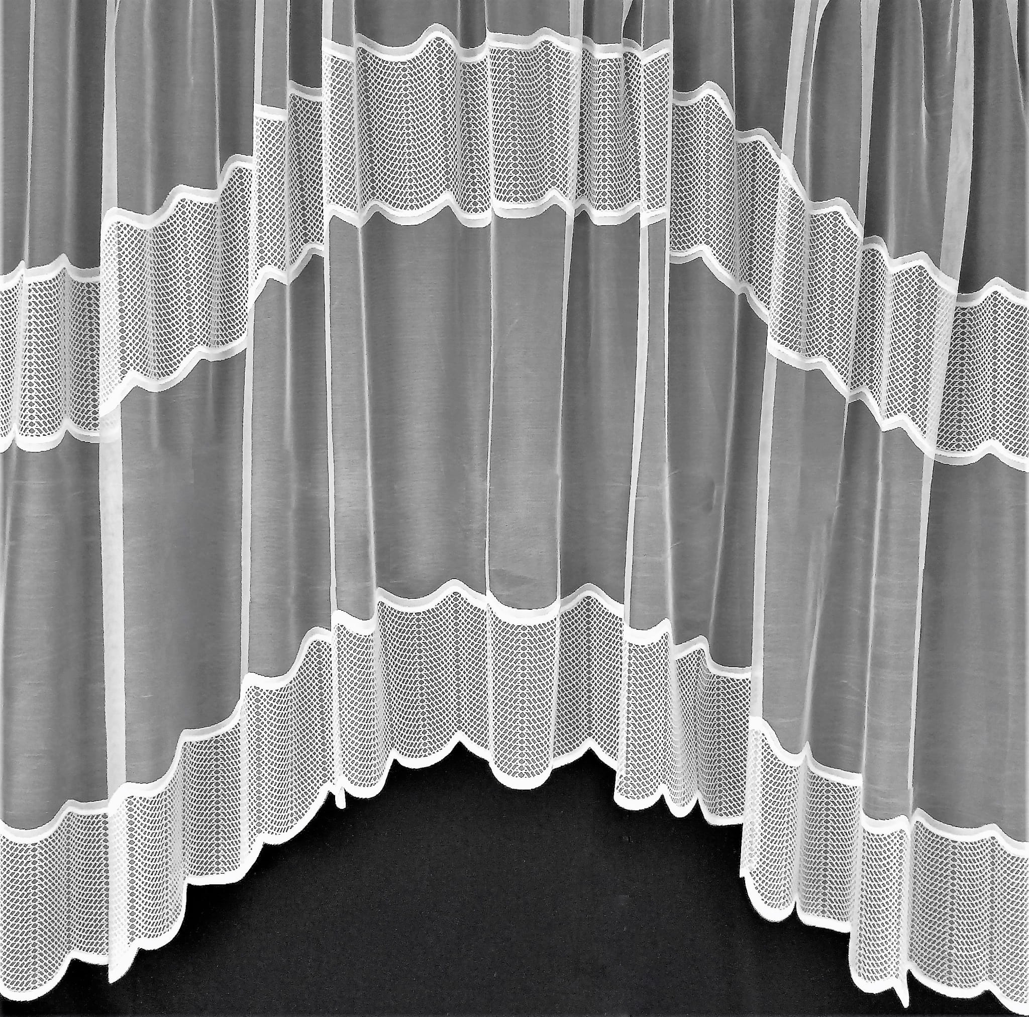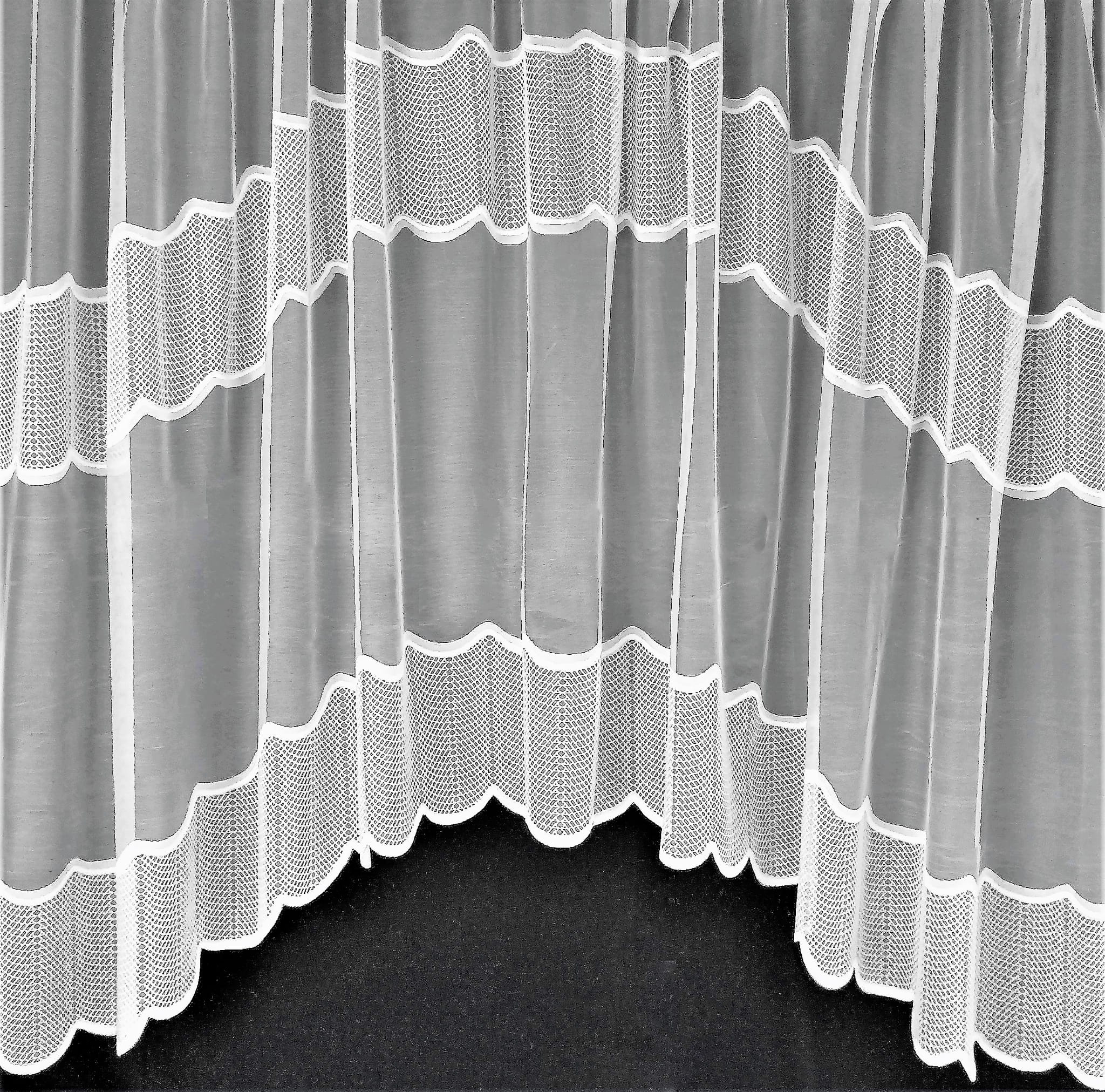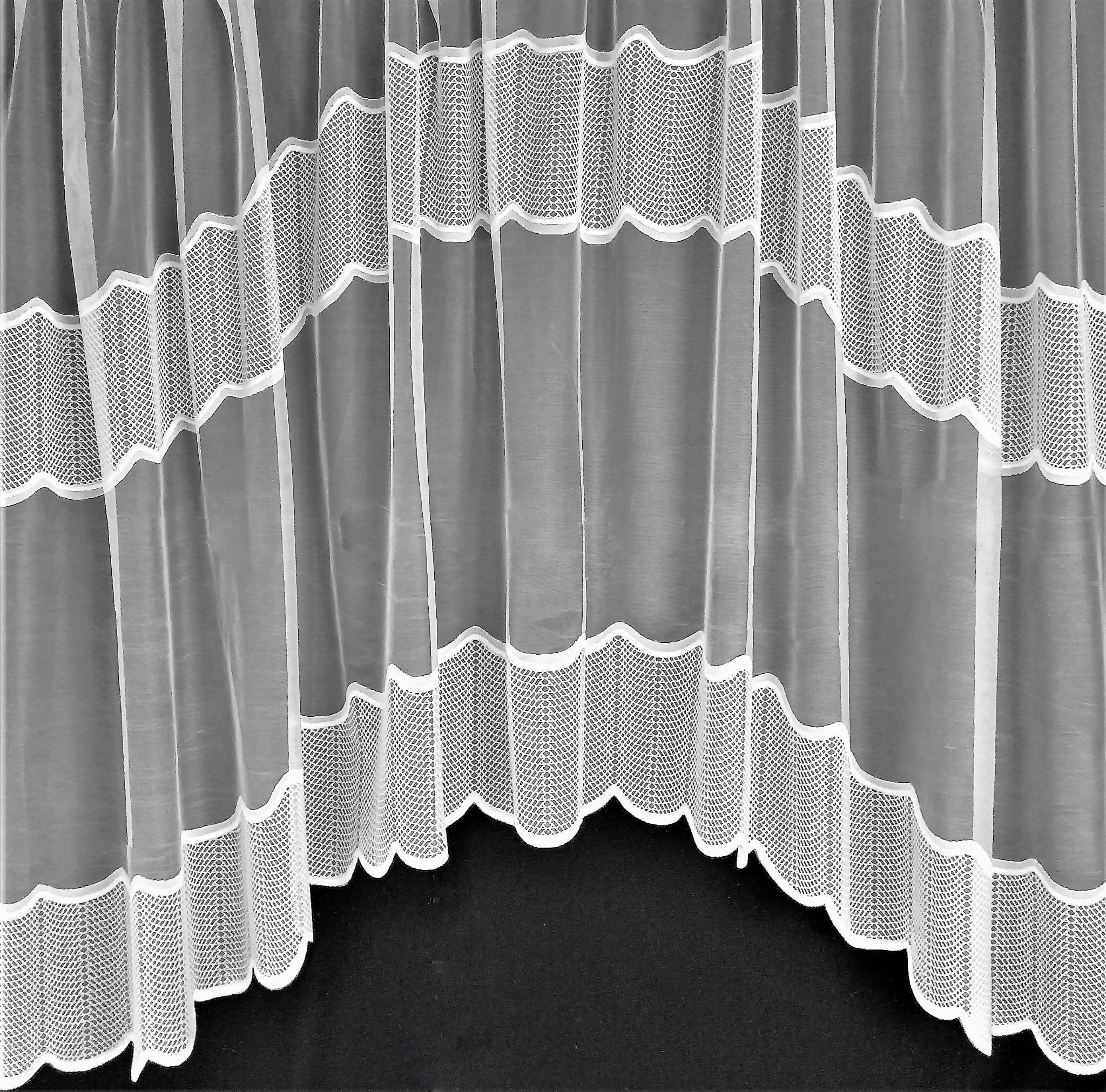 GOTOWA FIRANA Z ŻAKARDU W BIAŁYM KOLORZE Z PIĘKNIE WYCIĘTYM DOŁEM ORAZ DWOMA SZEROKIMI SZLAKAMI O STRUKTURZE SUBTELNEJ SIATECZKI Z EFEKTEM DELIKATNEJ FALI WYSOKOŚĆ 160 CM SZEROKOŚĆ 320 CM