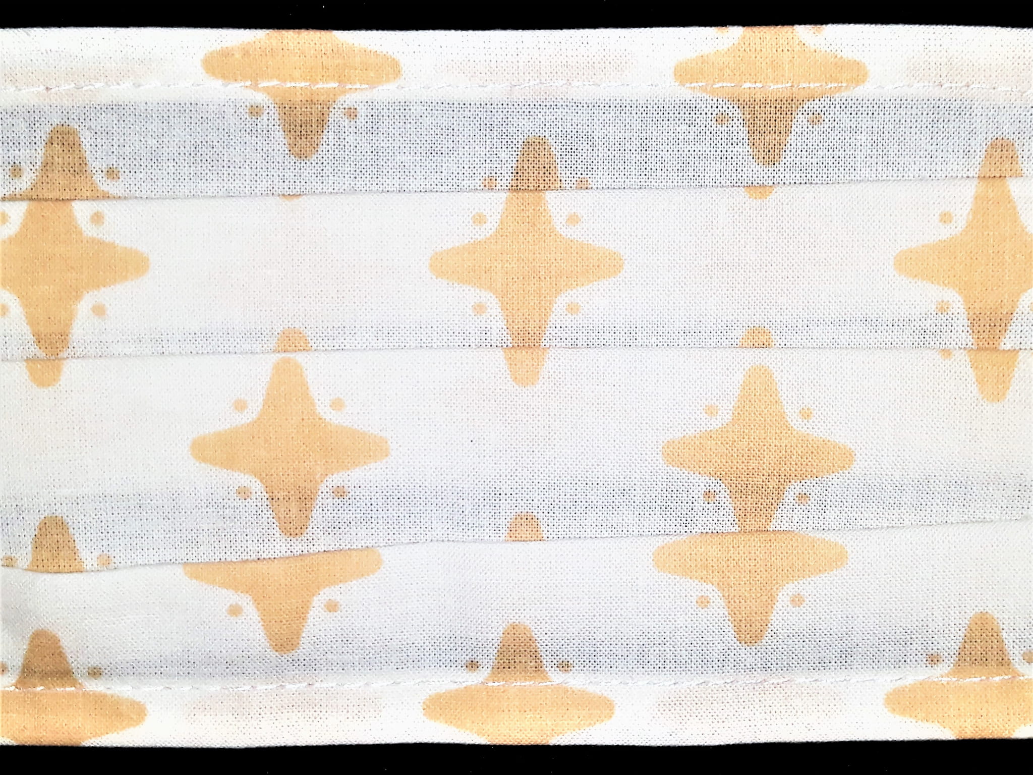 MASECZKA OCHRONNA WZÓR GWIAZDKI W KOLORZE ZŁOTO - ŻÓŁTYM NA BIAŁYM TLE WIELOKROTNEGO UŻYTKU Z BAWEŁNY 100 %. PO BOCZNYCH STRONACH MASECZKI WSZYTA JEST CIENKA BIAŁA GUMKA. WYSOKIEJ JAKOŚCI BAWEŁNA NIE PODRAŻNIA SKÓRY I NIE POWODUJE KŁOPOTÓW Z ODDYCHANIEM.