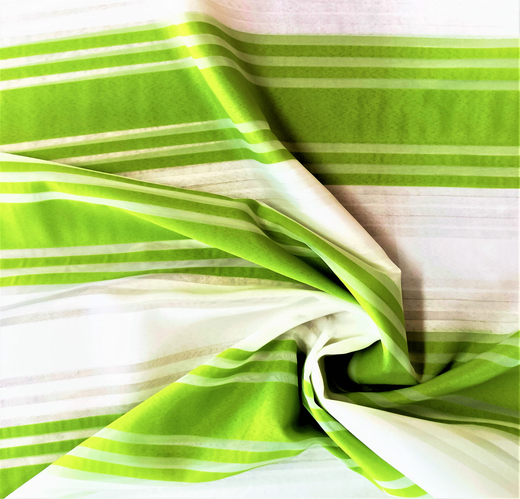 MODNA TKANINA ZASŁONOWA W SZEROKIE POZIOMO UŁOŻONE PASY W PIĘKNYM KOLORZE JASNEJ ZIELENI NA BIAŁYM TLE SZEROKOŚC 170 CM PRODUCENT CHEMEKS PORAJ