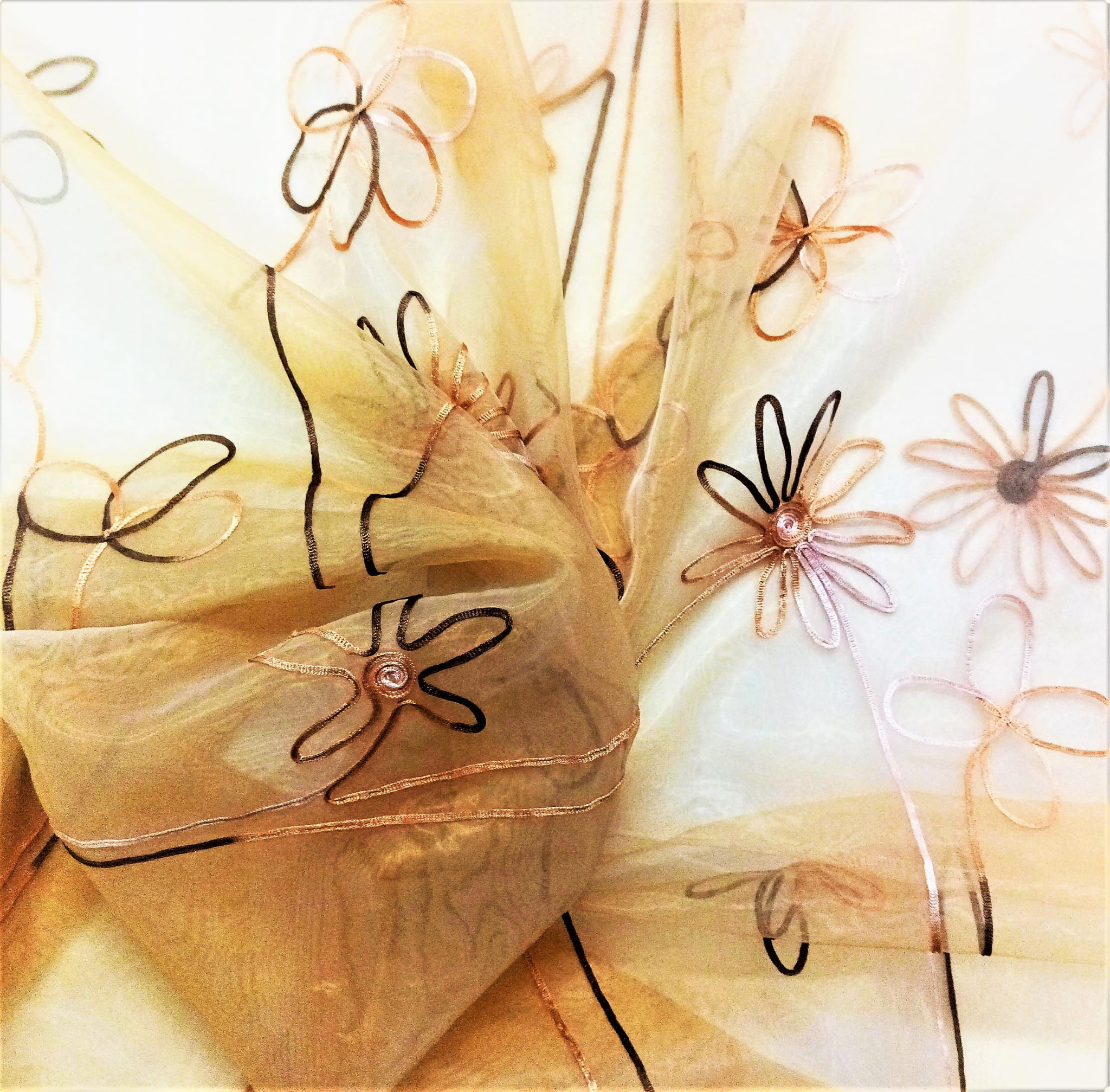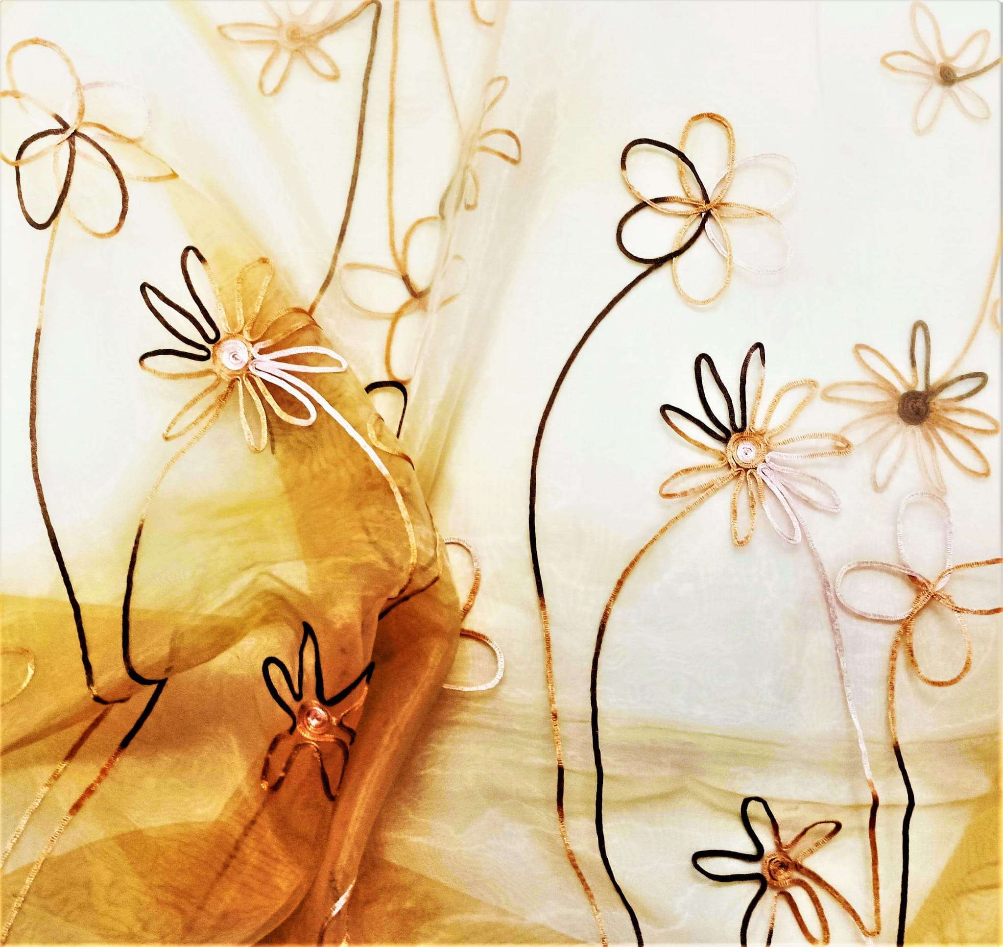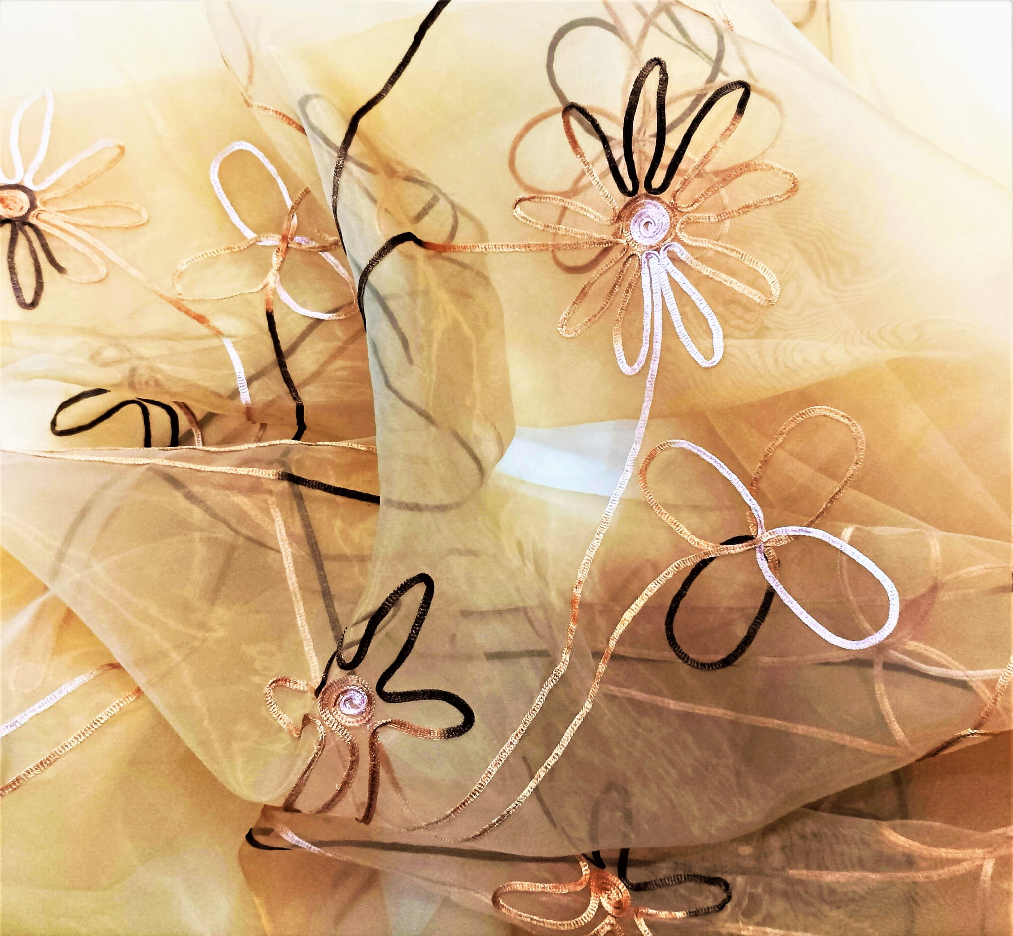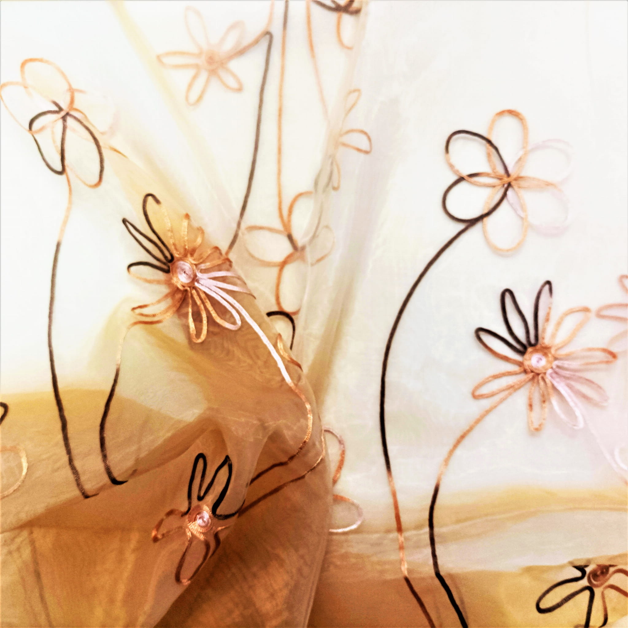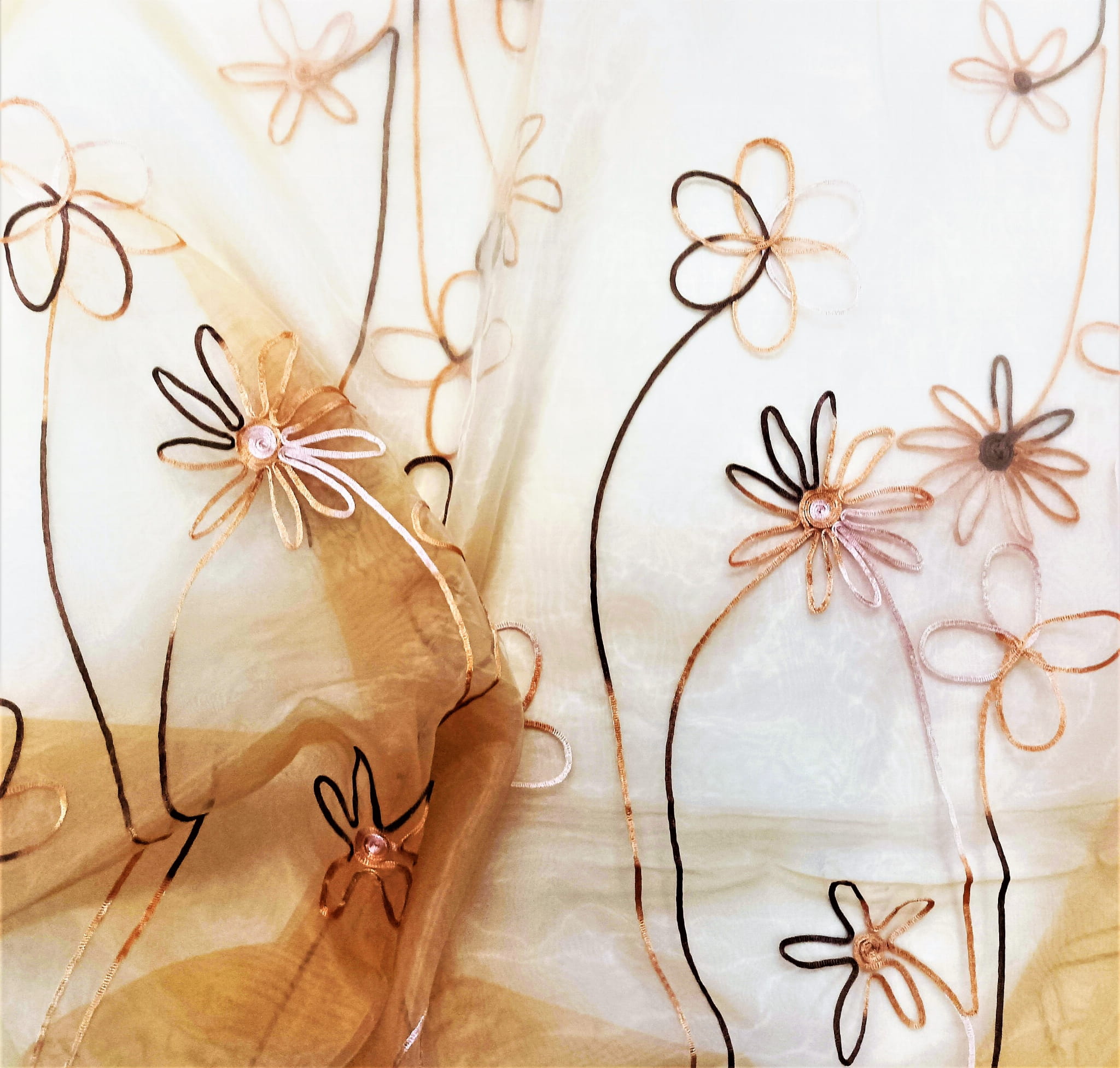 NIEZWYKLE EFEKTOWNA ORGANTYNA PREMIUM W KOLORZE CIEPŁEGO BEŻU Z DUŻYM, HAFTOWANYM WZOREM FLORYSTYCZNYM W POSTACI PIĘKNYCH, PIONOWO UŁOŻONYCH KWIATÓW W RÓŻNYCH ODCIENIACH BRĄZU TO ELEGANCKA DEKORACJA W KLIMACIE BOHO, RETRO, VINTAGE, ETNO ORAZ GLAMOUR. WYGLĄDA ŚWIETNIE ZARÓWNO JAKO ORYGINALNA FIRANA ORAZ JAKO OZDOBNA ZASŁONA. ORGANTYNA POSIADA DELIKATNĄ I ZWIEWNĄ STRUKTURĘ, BARDZO DOBRZE ROZPRASZA PROMIENIE SŁONECZNE, ROZJAŚNIA I ROZŚWIETLA WNĘTRZE. IDEALNIE DOBRANE POŁĄCZENIE KOLORYSTYCZNE W POŁĄCZENIU Z PERFEKCYJNIE HAFTOWANYM, KWIATOWYM PRINTEM TWORZY SPEKTAKULARNY EFEKT WIZUALNY ARANŻACJI OKNA.