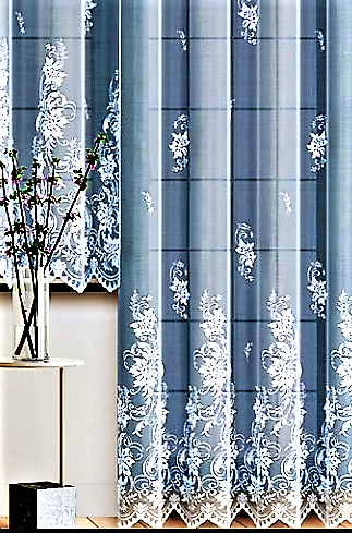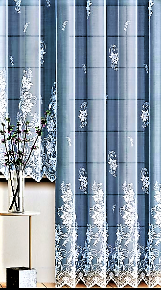 NIEZWYKLE STYLOWA FIRANKA Z BIAŁEGO ŻAKARDU Z PIĘKNYM WZOREM FLORYSTYCZNYM NA CAŁEJ POWIERZCHNI I BOGATO OZDOBIONYM DOŁEM WYSOKOŚĆ 250 CM 300 CM PRODUCENT HAFT KALISZ