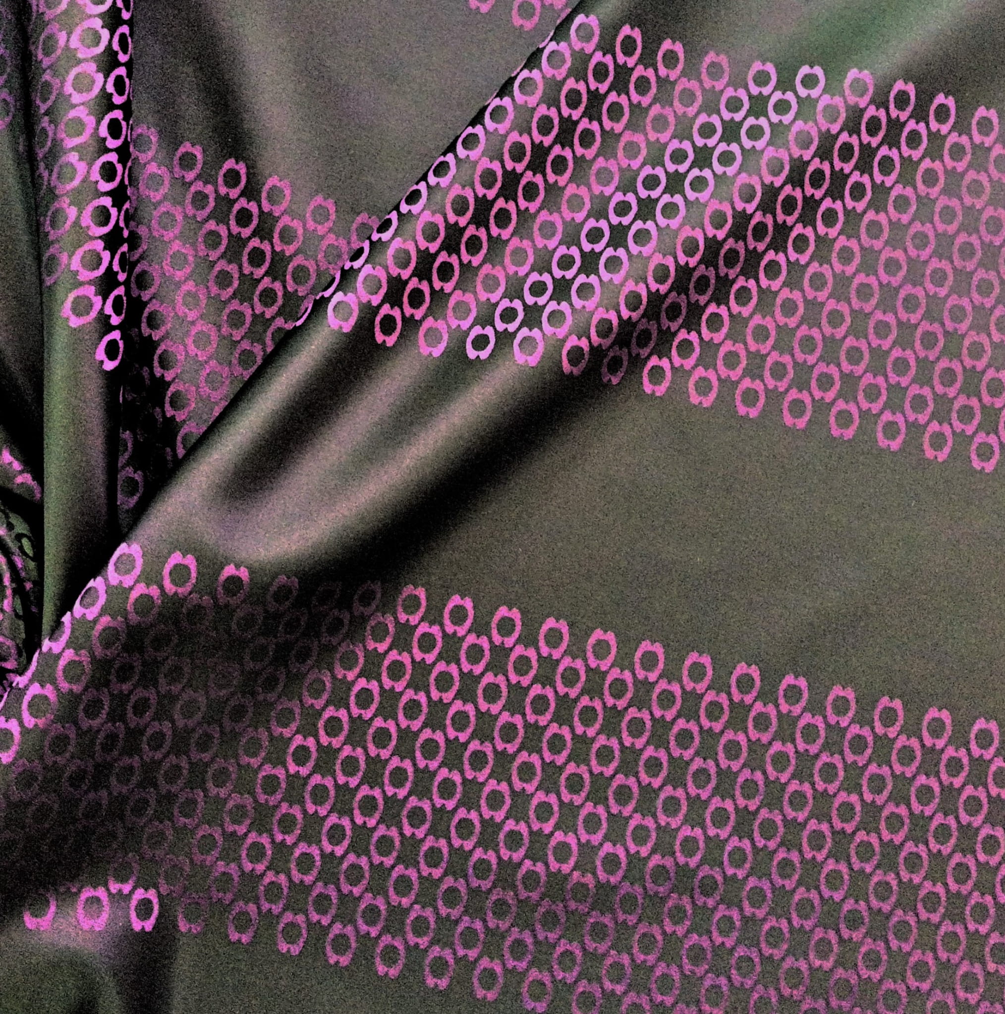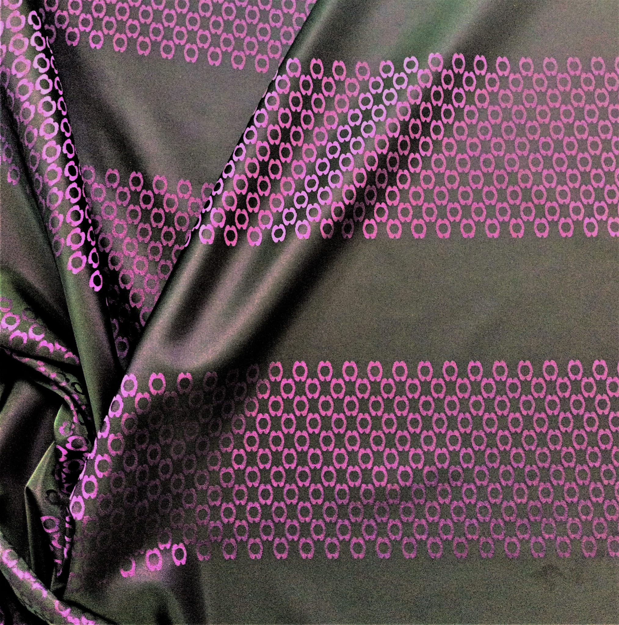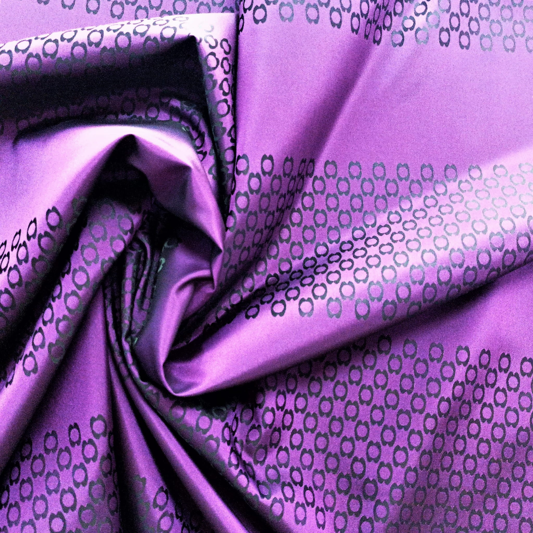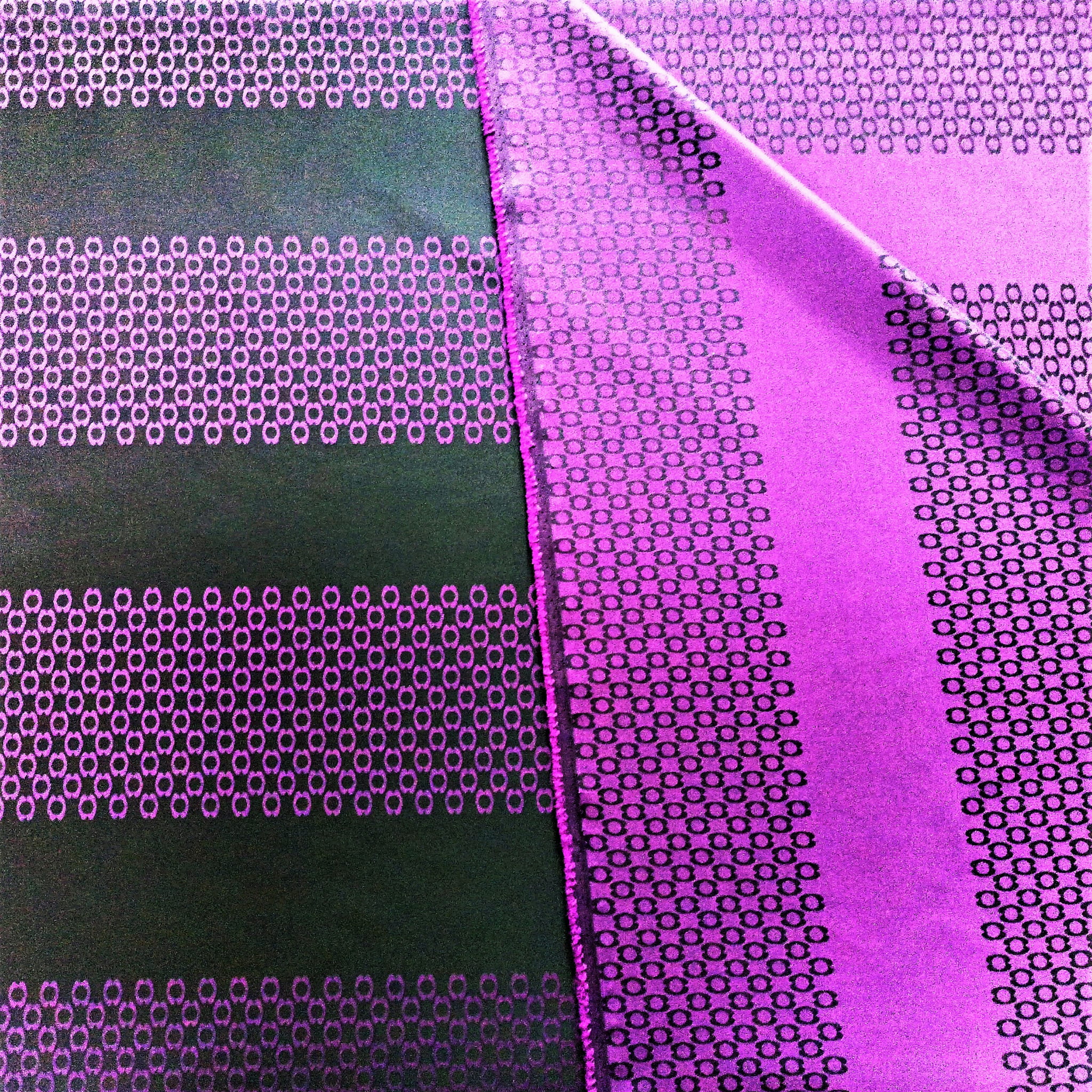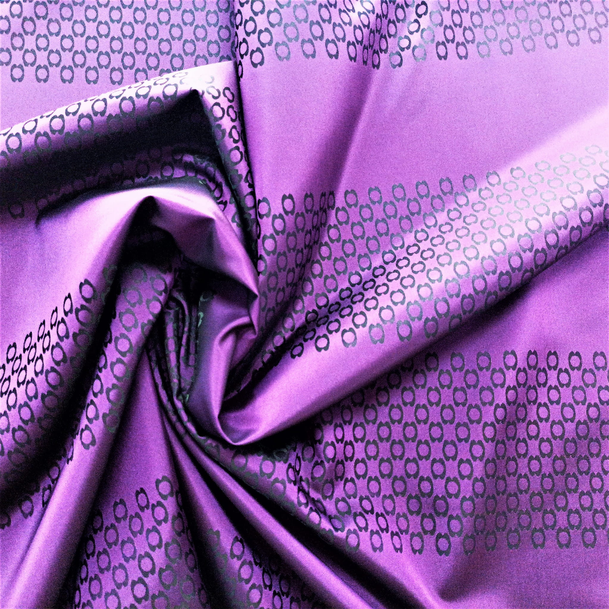 TKANINA JEST DWUSTRONNA - JEDNA STRONA TO FIOLETOWE PASY NA CZARNYM TLE, NATOMIAST DRUGA STRONA TO CZARNE PASY NA FIOLETOWYM TLE. NIE PRZEPUSZCZA PROMIENI SŁONECZNYCH, JEST KRYJĄCA O GŁADKIEJ I ŚLISKIEJ FAKTURZE.