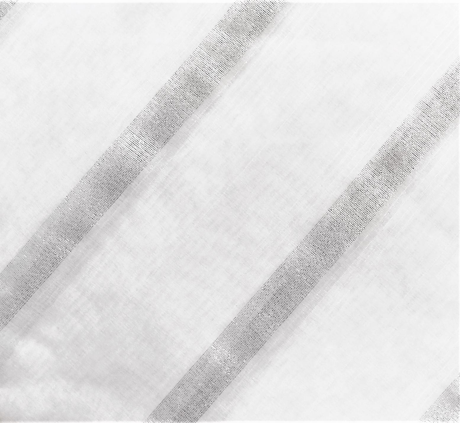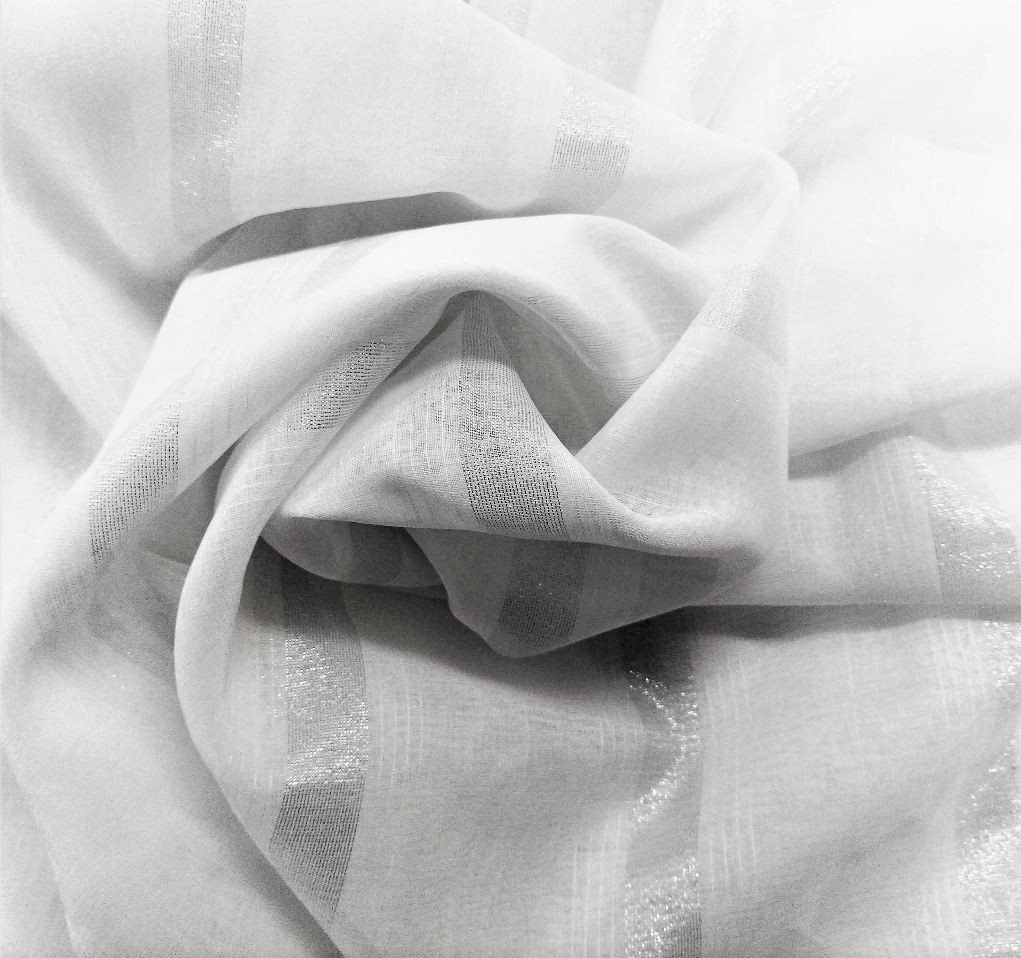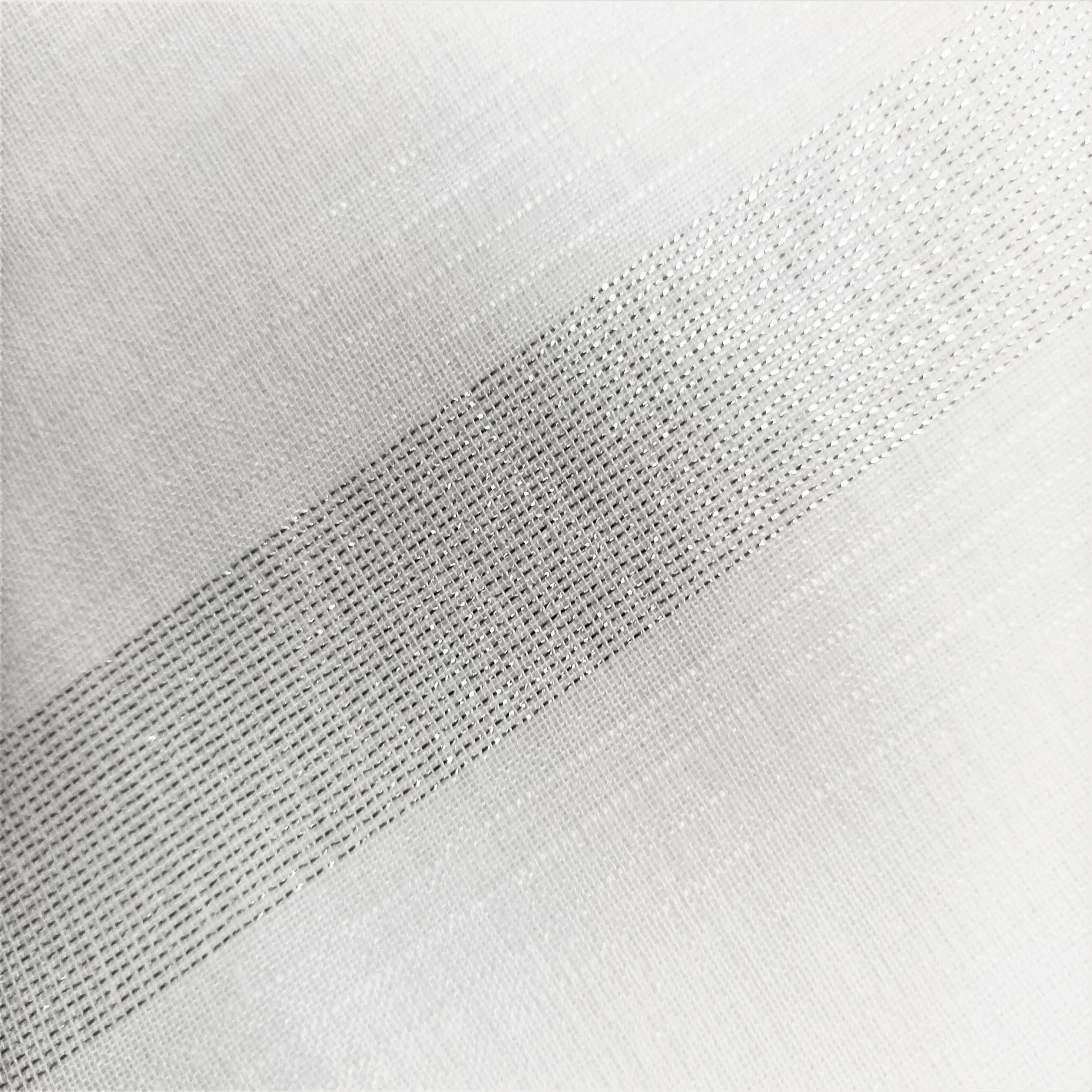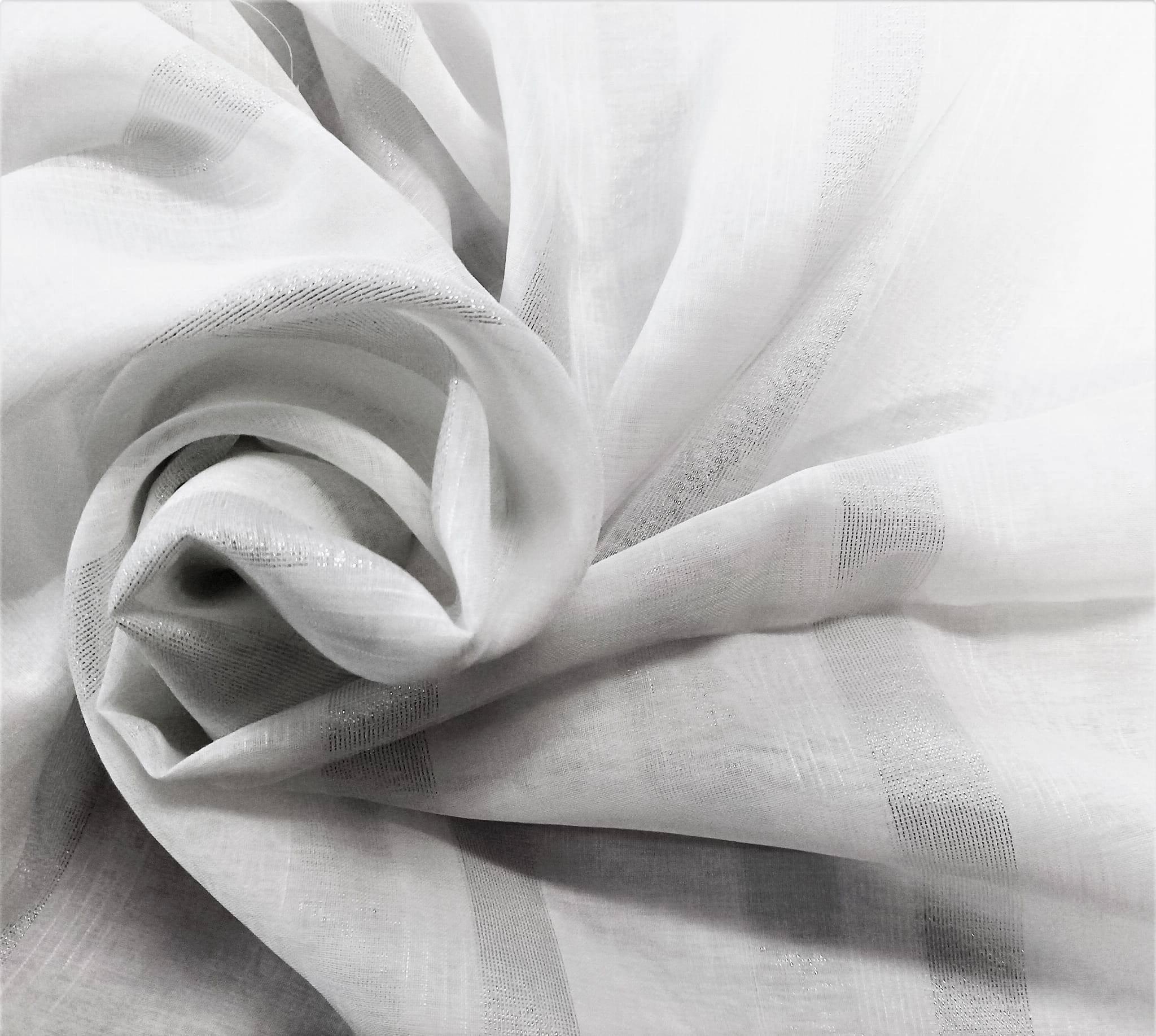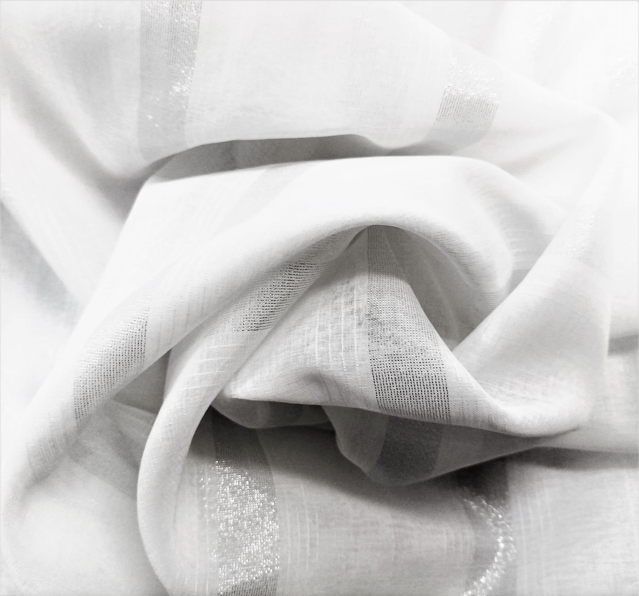 ORYGINALNA FIRANA BIAŁA ETAMINA ZDOBIONA NA CAŁEJ POWIERZCHNI PIONOWO UŁOŻONYMI PASAMI W KOLORZE SREBRNYM TO ŚWIETNA ARANŻACJA OKNA W NOWOCZESNYM WNĘTRZU. DELIKATNA ETAMINA SUBTELNIE PRZEPUSZCZA NATURALNE ŚWIATŁO, A PIONOWE, SREBRZYSTE PASY Z LEKKIM BŁYSKIEM W STYLU GLAMOUR NADAJĄ PRZESTRZENI UNIKALNEGO KLIMATU. REFLEKSY ŚWIETLNE NA STRUKTURZE FIRANKI TWORZĄ NIEZWYKŁY EFEKT GLAMOUR, HARMONIJNIE POŁĄCZONY Z KLASYCZNĄ ELEGANCJĄ. FIRANA WPROWADZA DO POMIESZCZENIA ELEMENT ŚWIEŻOŚCI, ZWIEWNOŚCI I BLASKU.