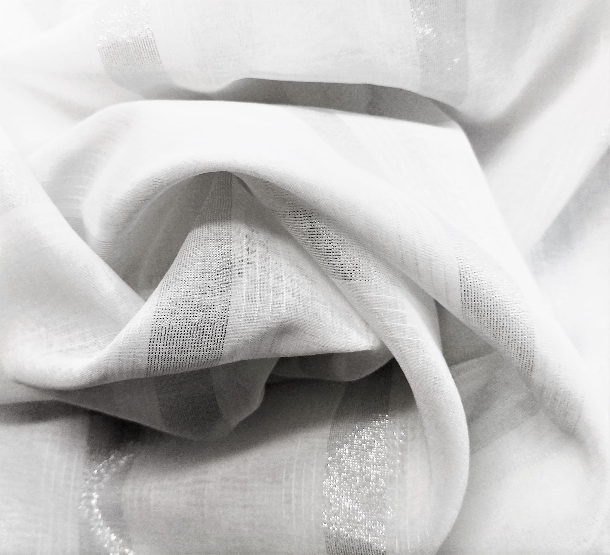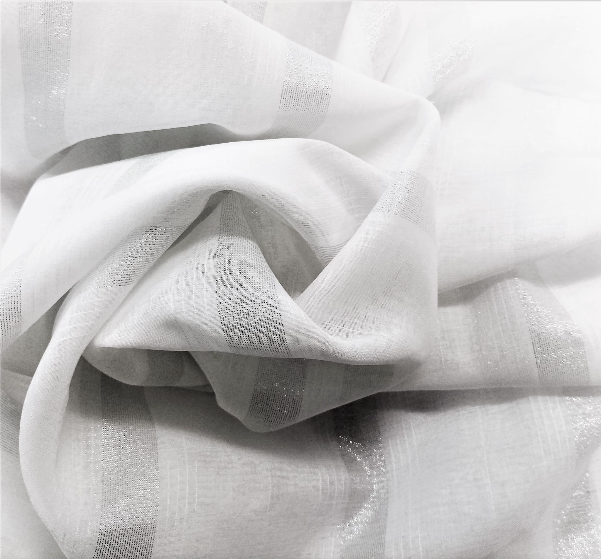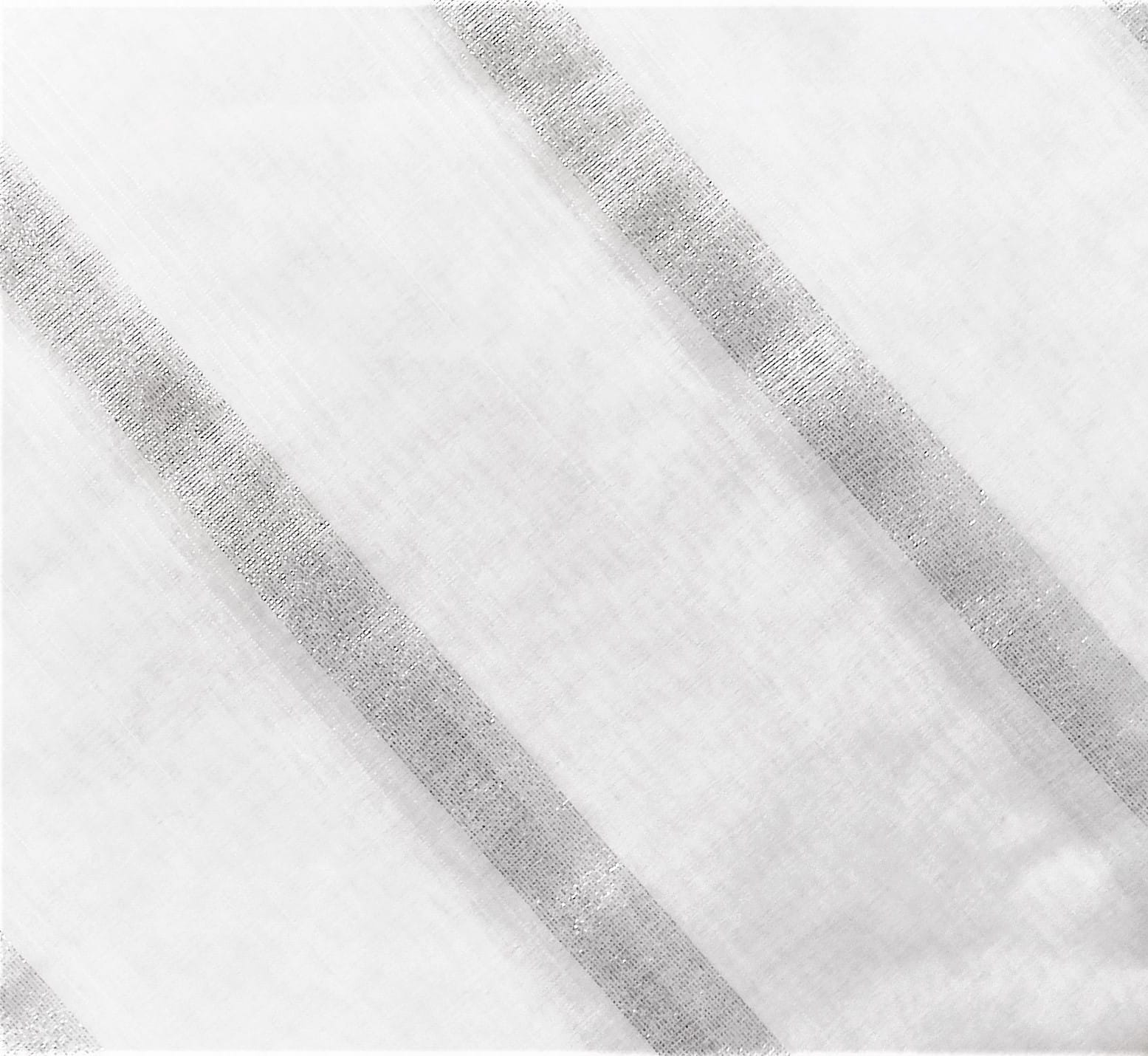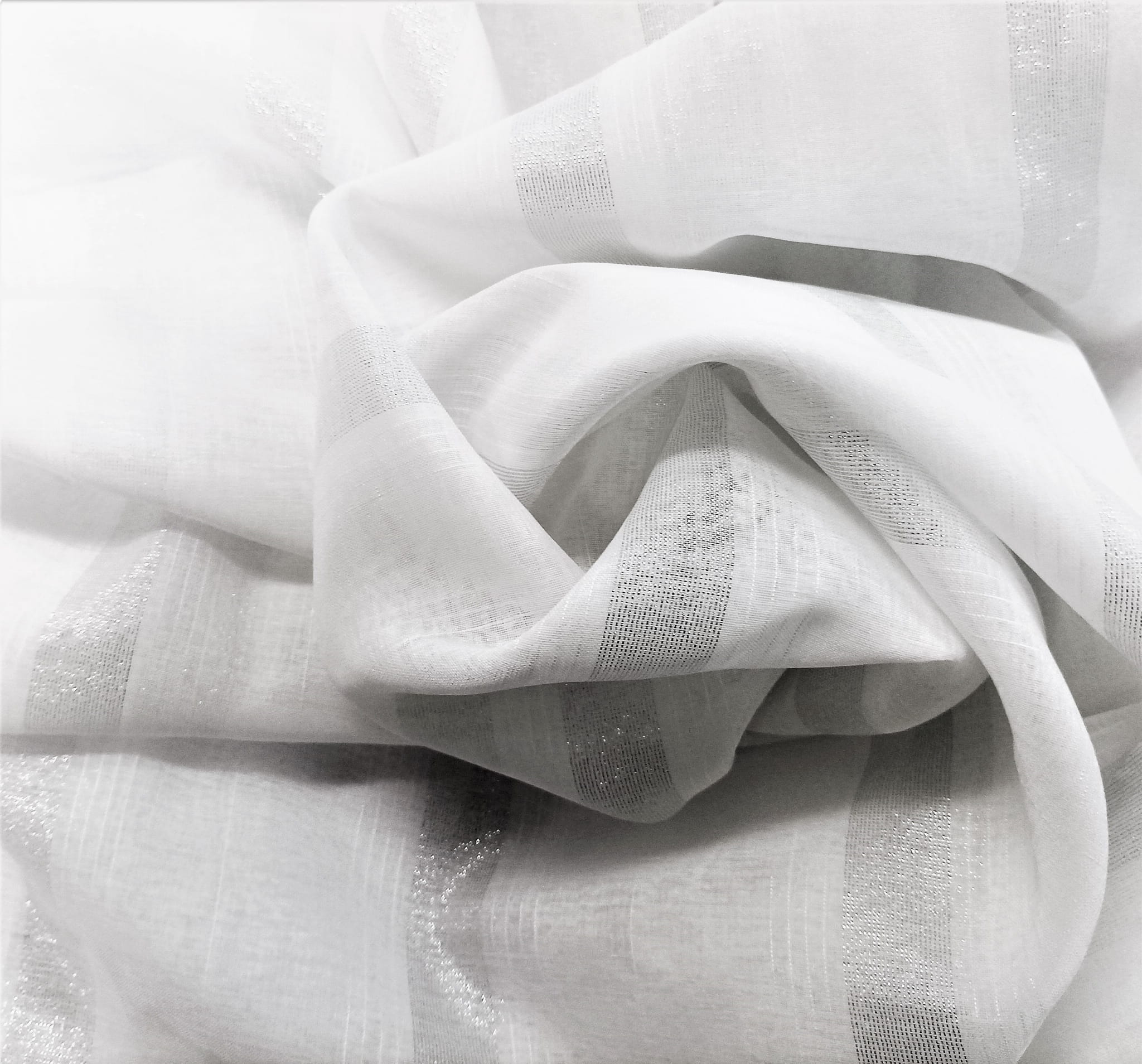 ORYGINALNA FIRANA BIAŁA ETAMINA ZDOBIONA NA CAŁEJ POWIERZCHNI PIONOWO UŁOŻONYMI PASAMI W KOLORZE SREBRNYM TO ŚWIETNA ARANŻACJA OKNA W NOWOCZESNYM WNĘTRZU. DELIKATNA ETAMINA SUBTELNIE PRZEPUSZCZA NATURALNE ŚWIATŁO, A PIONOWE, SREBRZYSTE PASY Z LEKKIM BŁYSKIEM W STYLU GLAMOUR NADAJĄ PRZESTRZENI UNIKALNEGO KLIMATU. REFLEKSY ŚWIETLNE NA STRUKTURZE FIRANKI TWORZĄ NIEZWYKŁY EFEKT GLAMOUR, HARMONIJNIE POŁĄCZONY Z KLASYCZNĄ ELEGANCJĄ. FIRANA WPROWADZA DO POMIESZCZENIA ELEMENT ŚWIEŻOŚCI, ZWIEWNOŚCI I BLASKU.