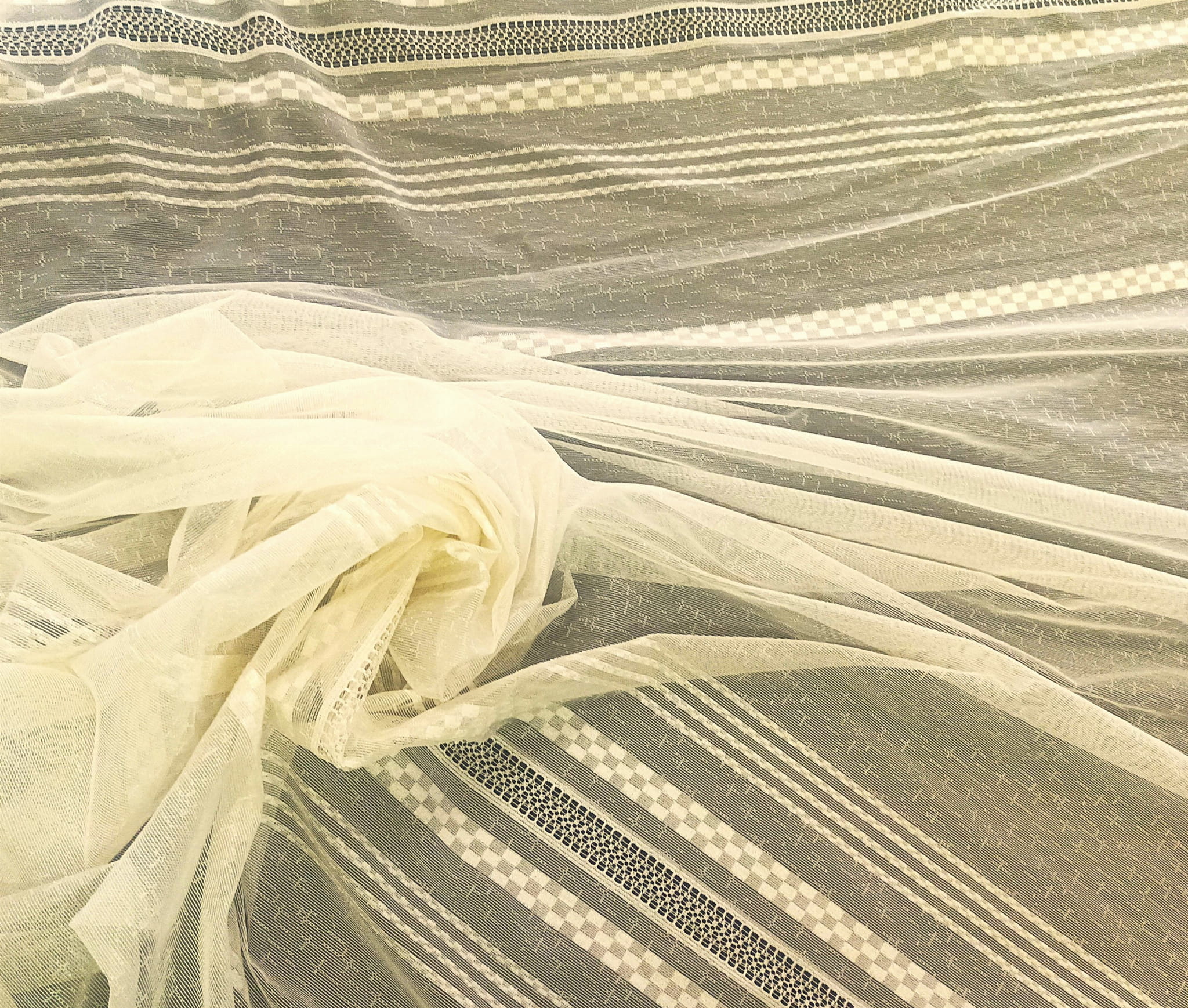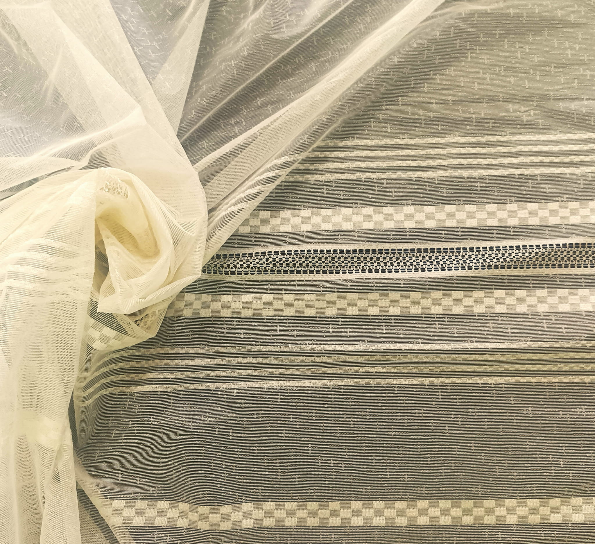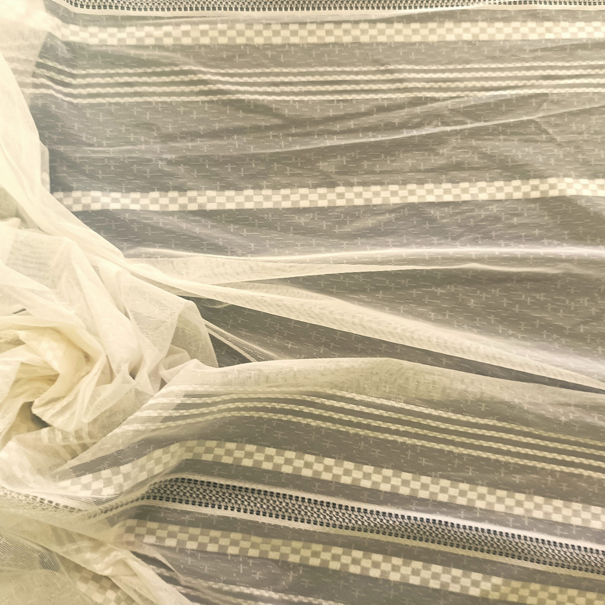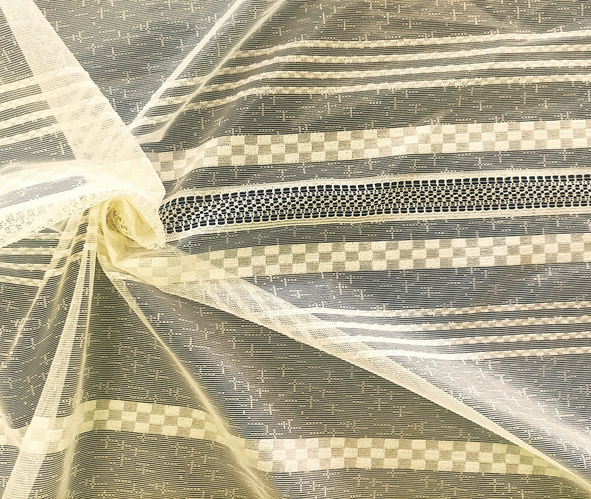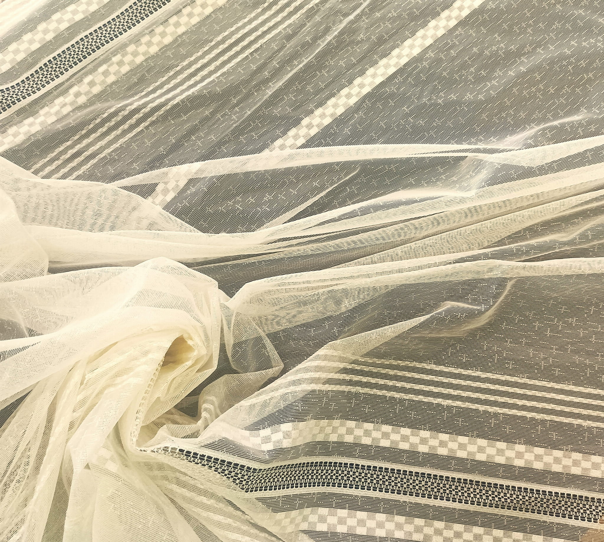 ORYGINALNA FIRANKA ŻAKARD W SUBTELNYM KOLORZE ECRU Z DWOMA SZLAKAMI W POSTACI OZDOBNYCH POZIOMO UŁOŻONYCH PASÓW WYSOKOŚĆ 250 CM PRODUCENT HAFT KALISZ