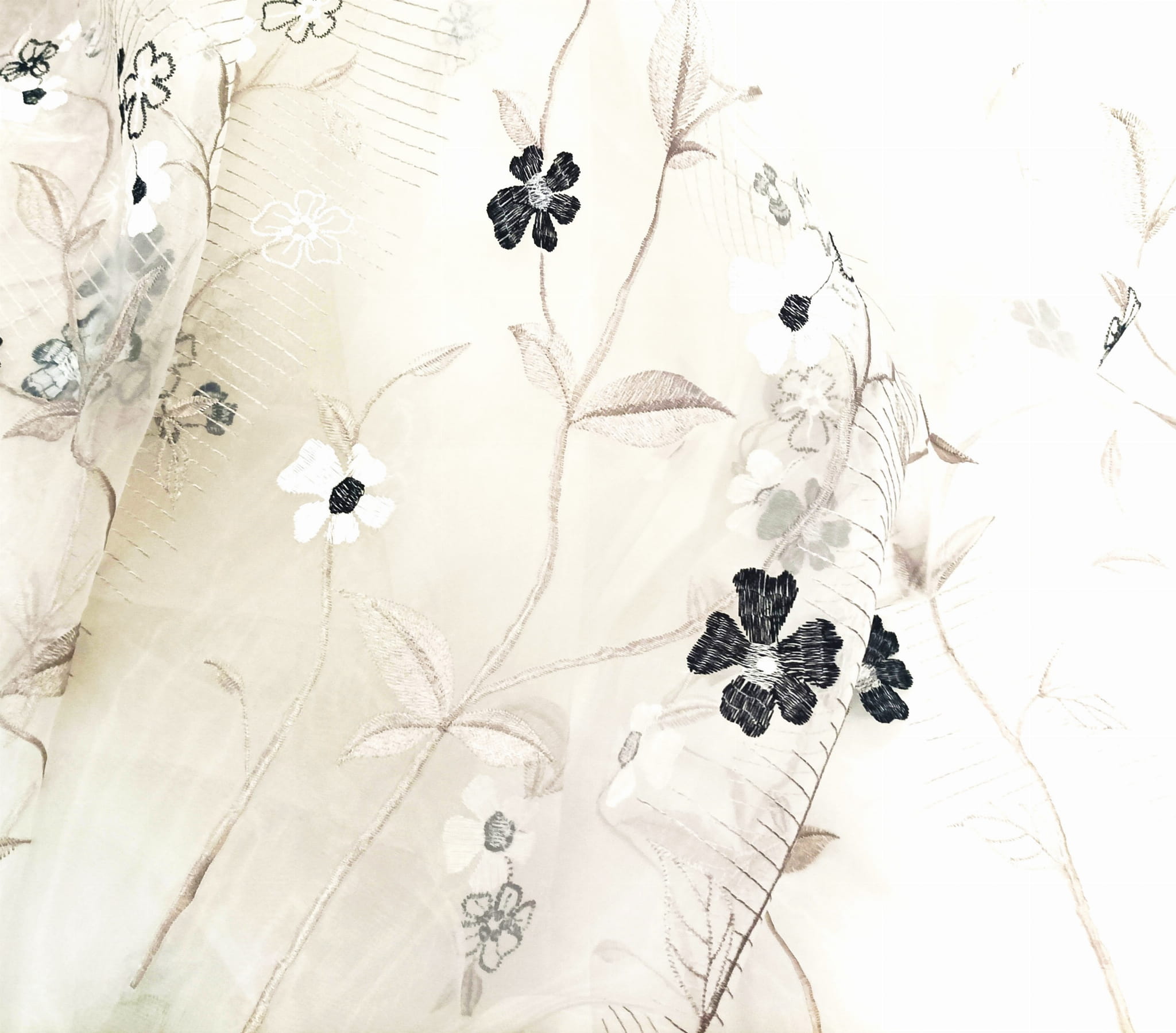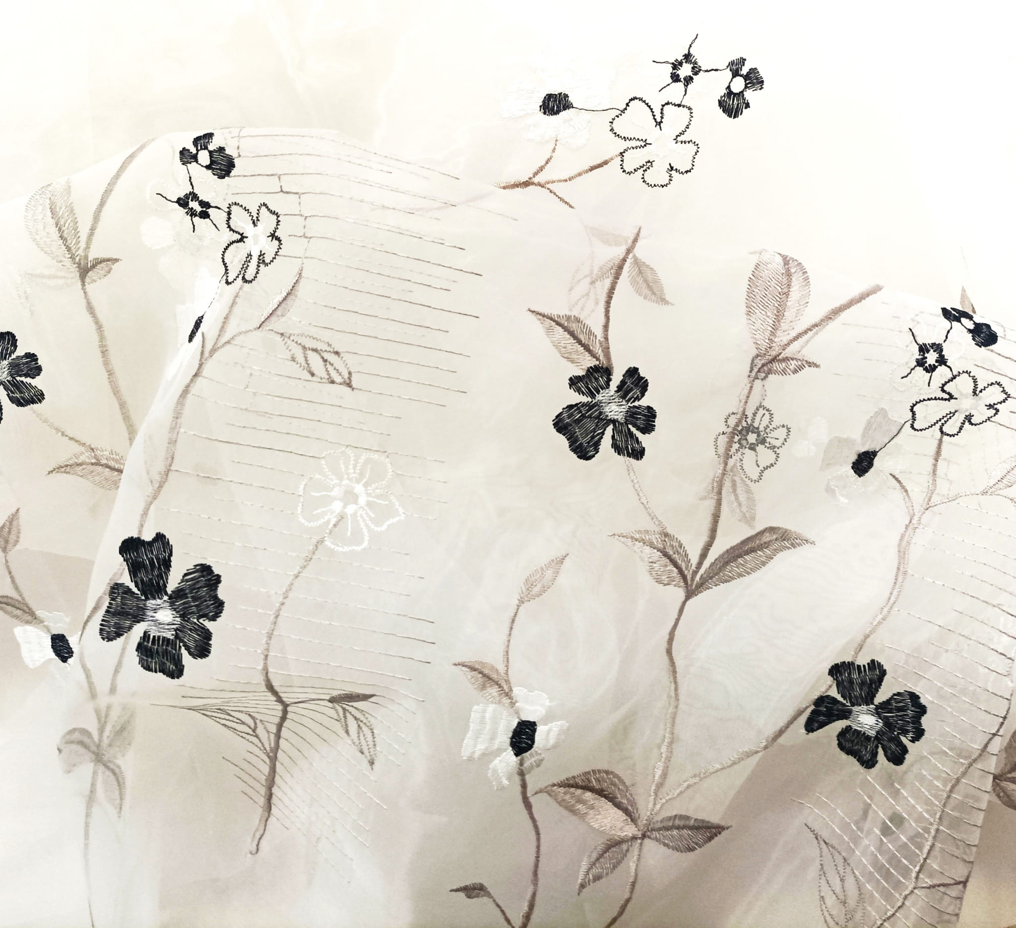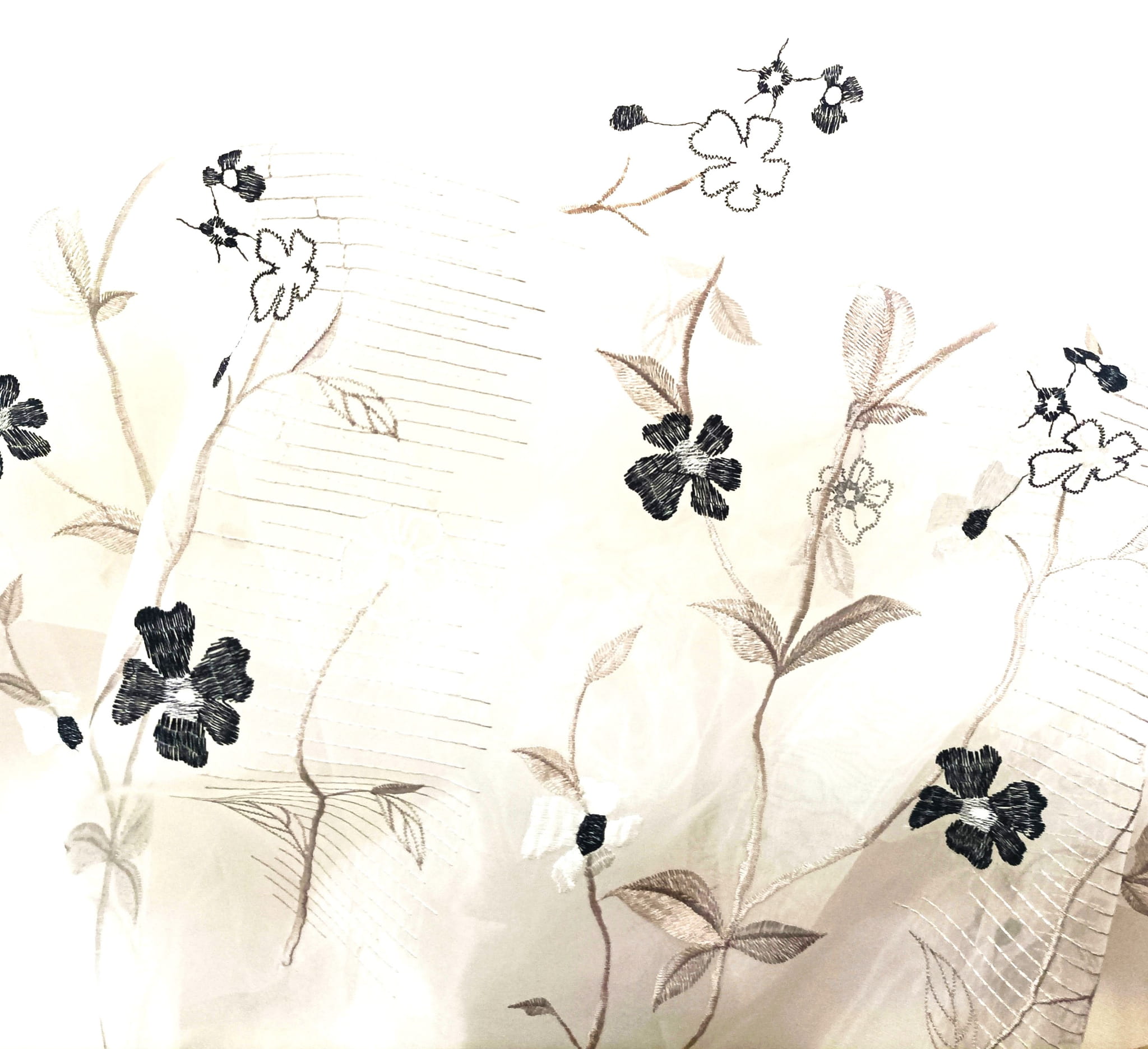 ORYGINALNA ORGANTYNA PREMIUM Z HAFTOWANYM WZOREM FLORYSTYCZNYM W POSTACI DUŻYCH KWIATÓW W PIĘKNYM POŁĄCZENIU KOLORYSTYCZNYM BEŻU BIELI ORAZ CZERNI NA BIAŁYM TLE POŁYSK GLAMOUR WYSOKOŚĆ 280 CM PRODUCENT CHEMEKS PORAJ