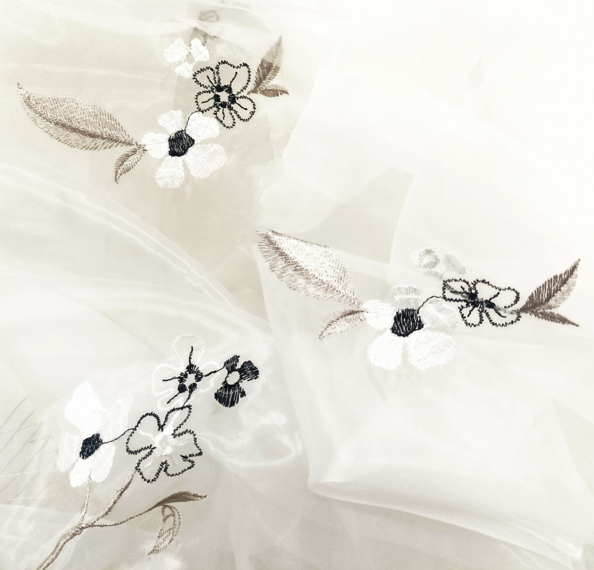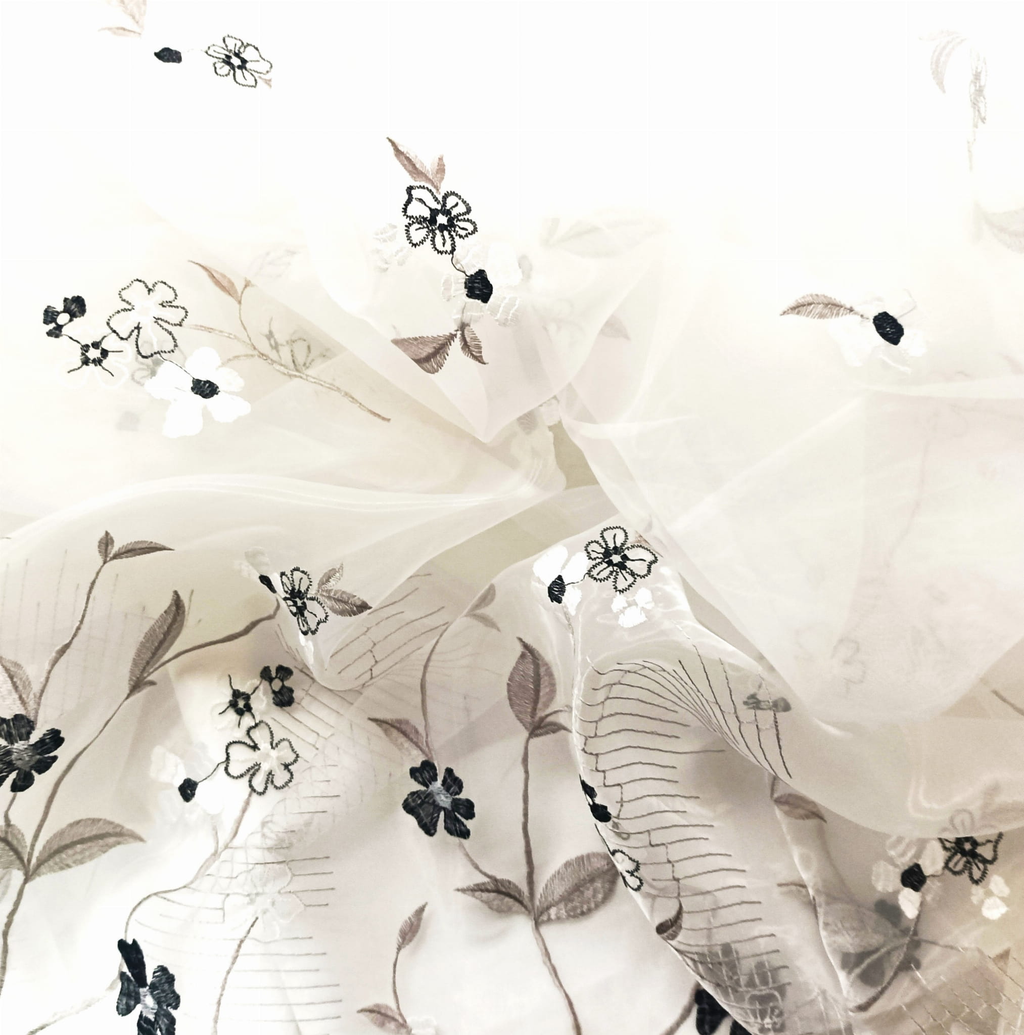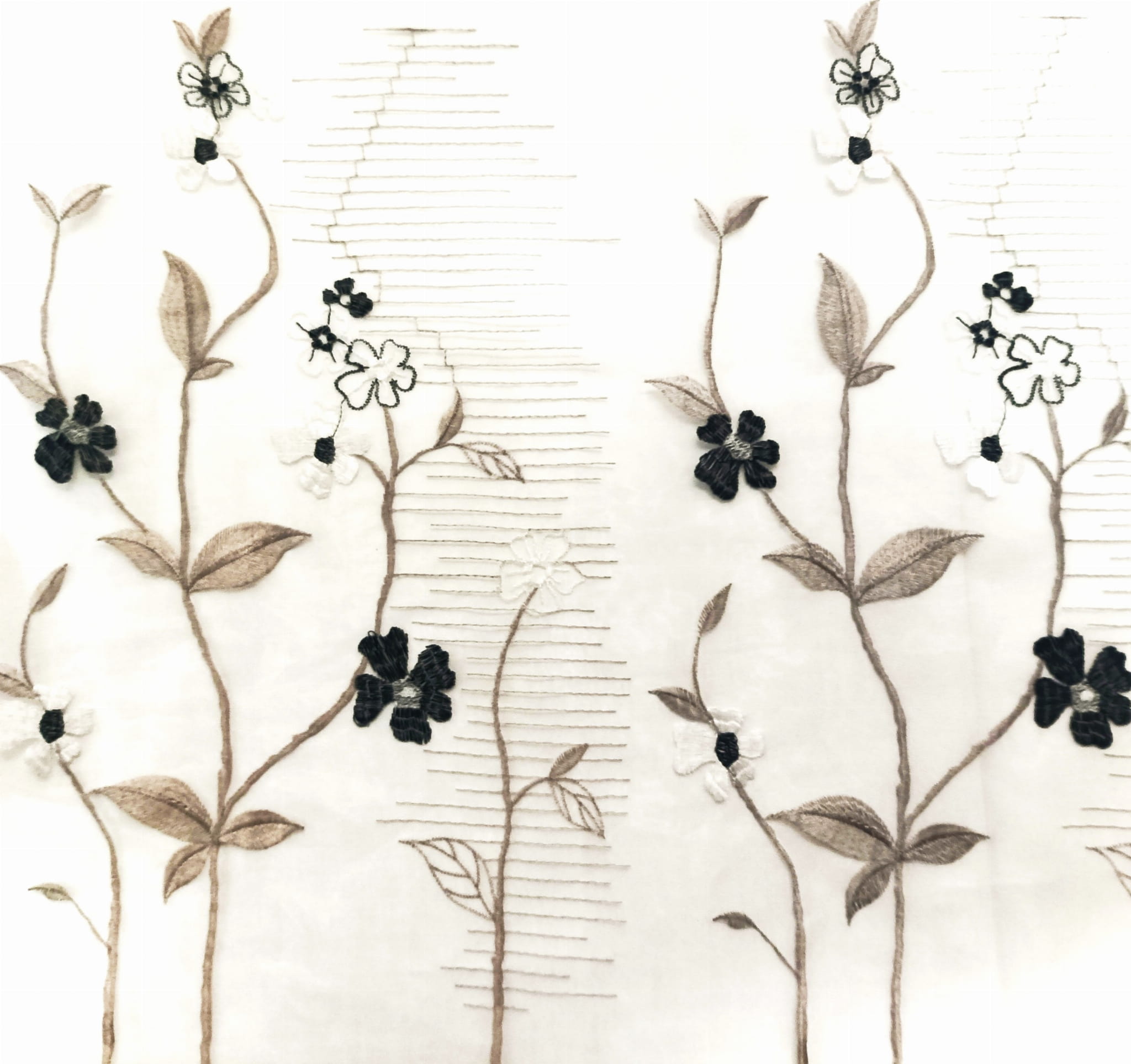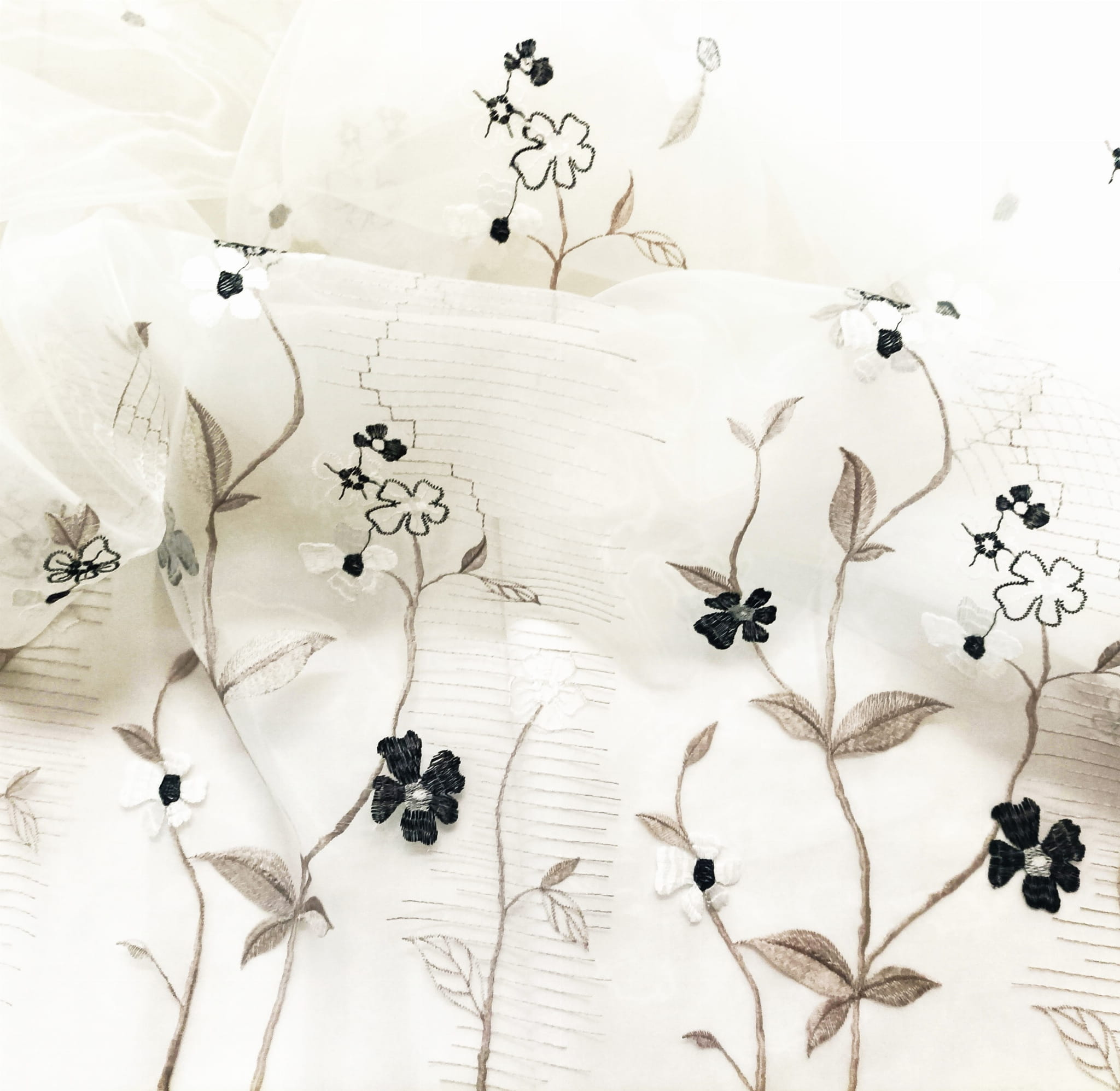 ORYGINALNA ORGANTYNA PREMIUM Z HAFTOWANYM WZOREM FLORYSTYCZNYM W POSTACI DUŻYCH KWIATÓW W PIĘKNYM POŁĄCZENIU KOLORYSTYCZNYM BEŻU BIELI ORAZ CZERNI NA BIAŁYM TLE POŁYSK GLAMOUR WYSOKOŚĆ 280 CM PRODUCENT CHEMEKS PORAJ