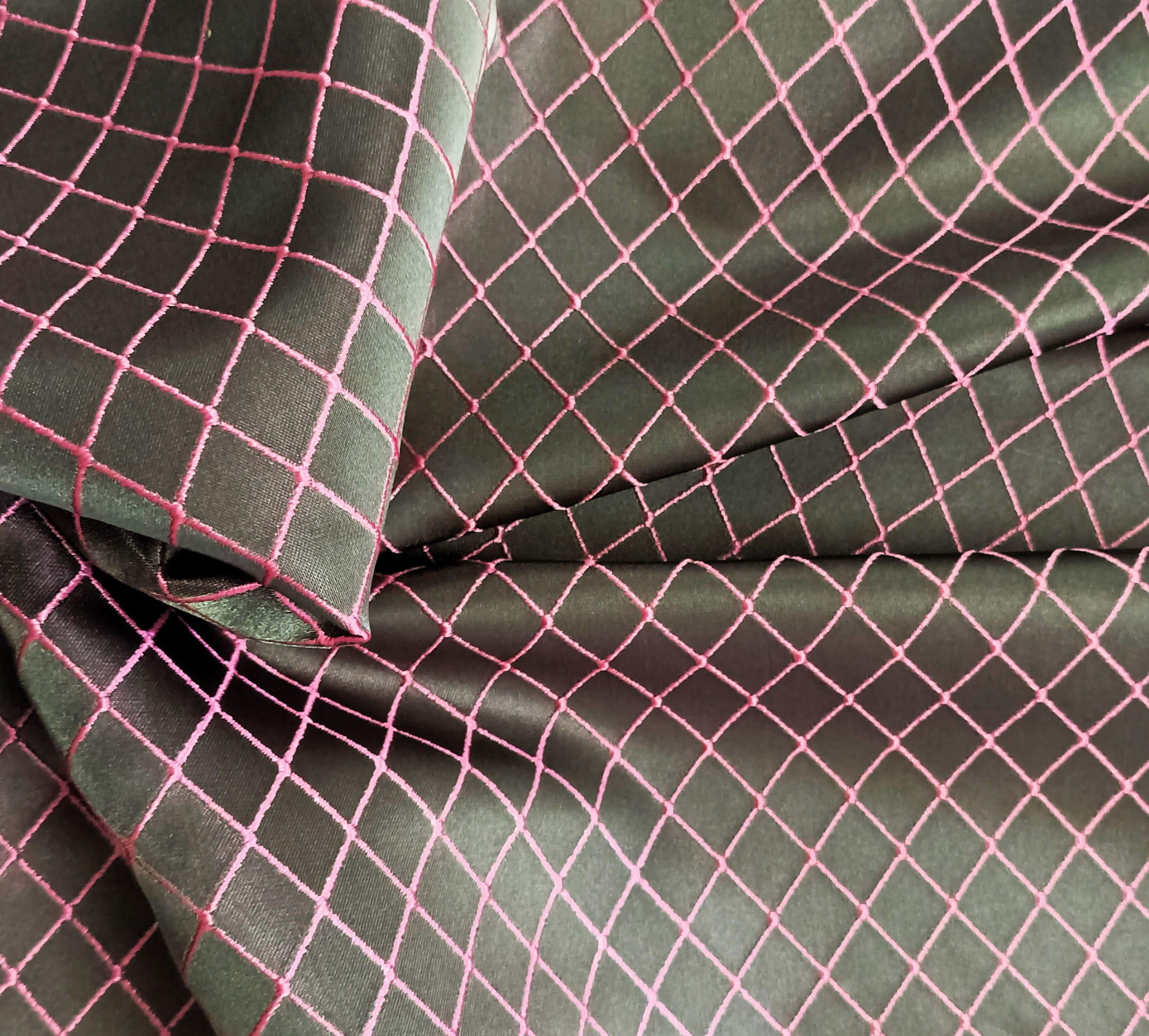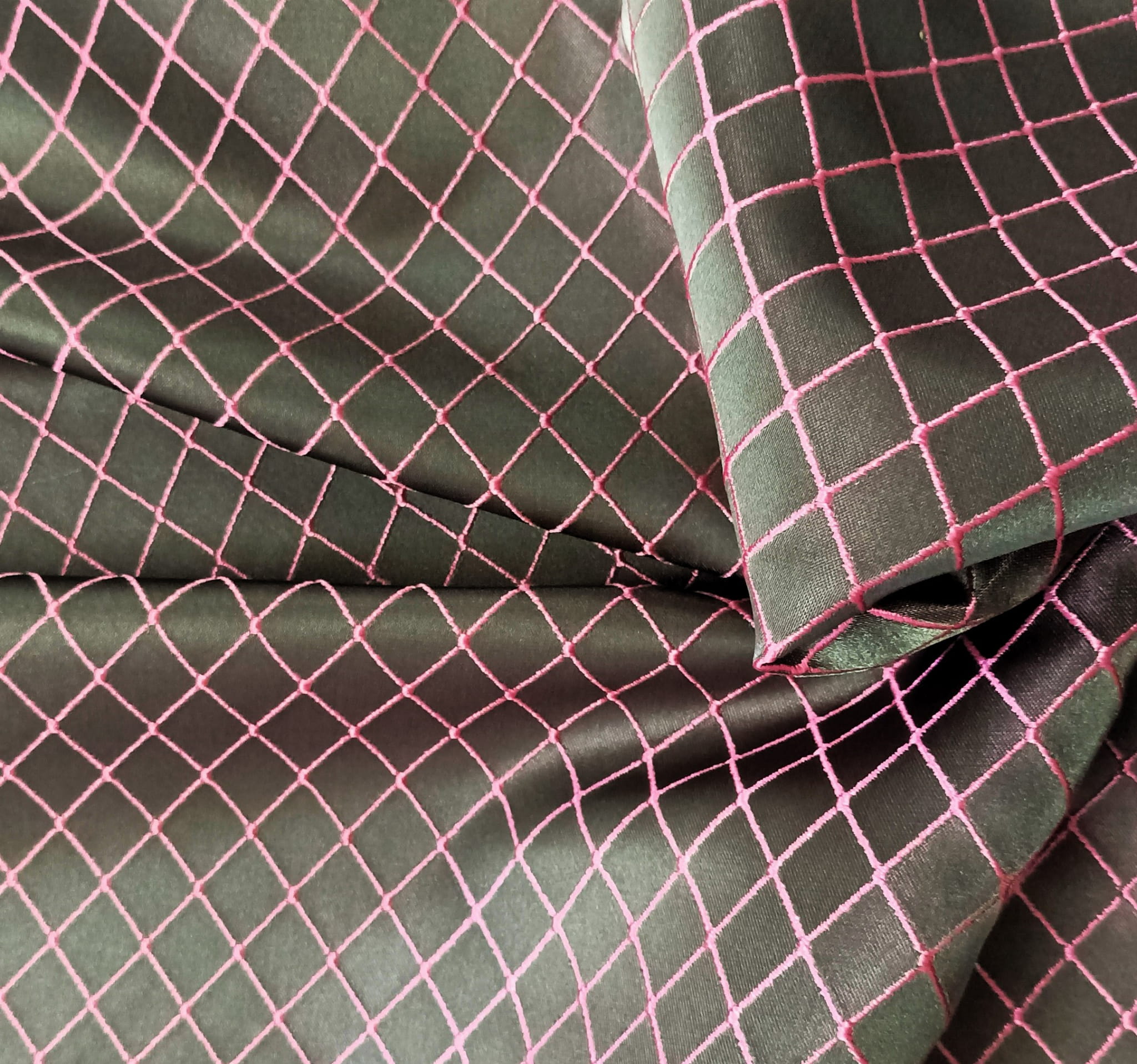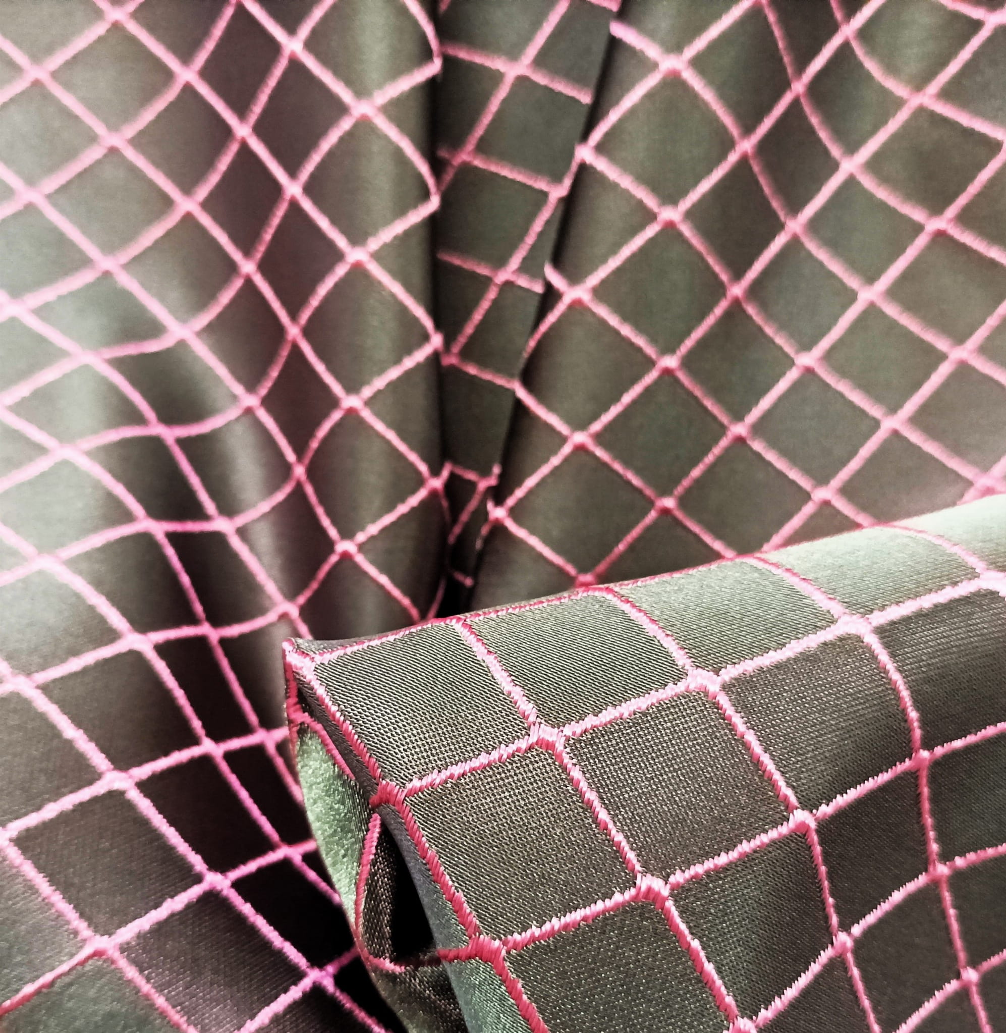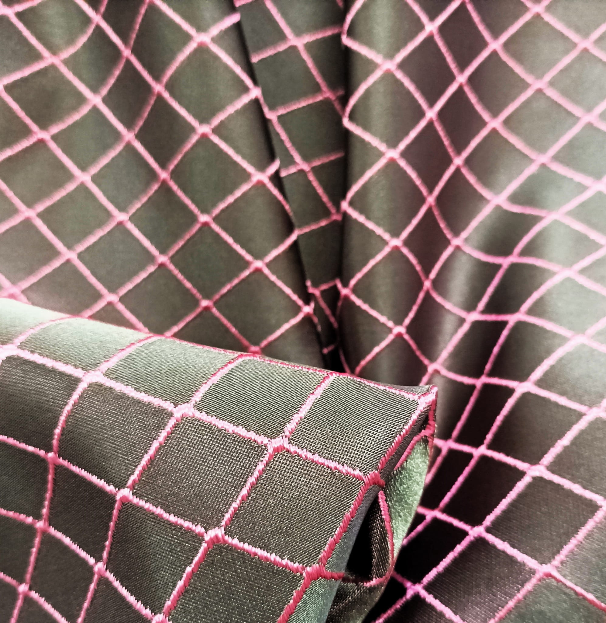 ORYGINALNA TKANINA ZASŁONOWA MODNY WZÓR GEOMETRYCZNY ROMBY W EFEKTOWNYCH BARWACH NASYCONEJ SZAROŚCI I PUDROWEGO RÓŻU POŁYSK GLAMOUR SZEROKOŚĆ 140 CM PRODUCENT MDM FIRANY