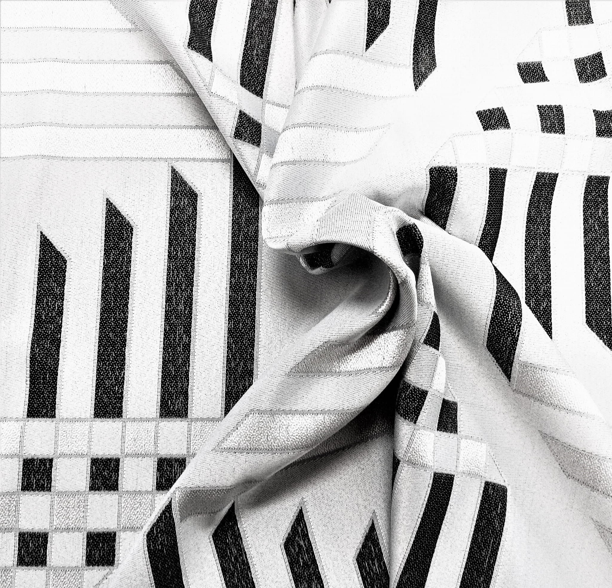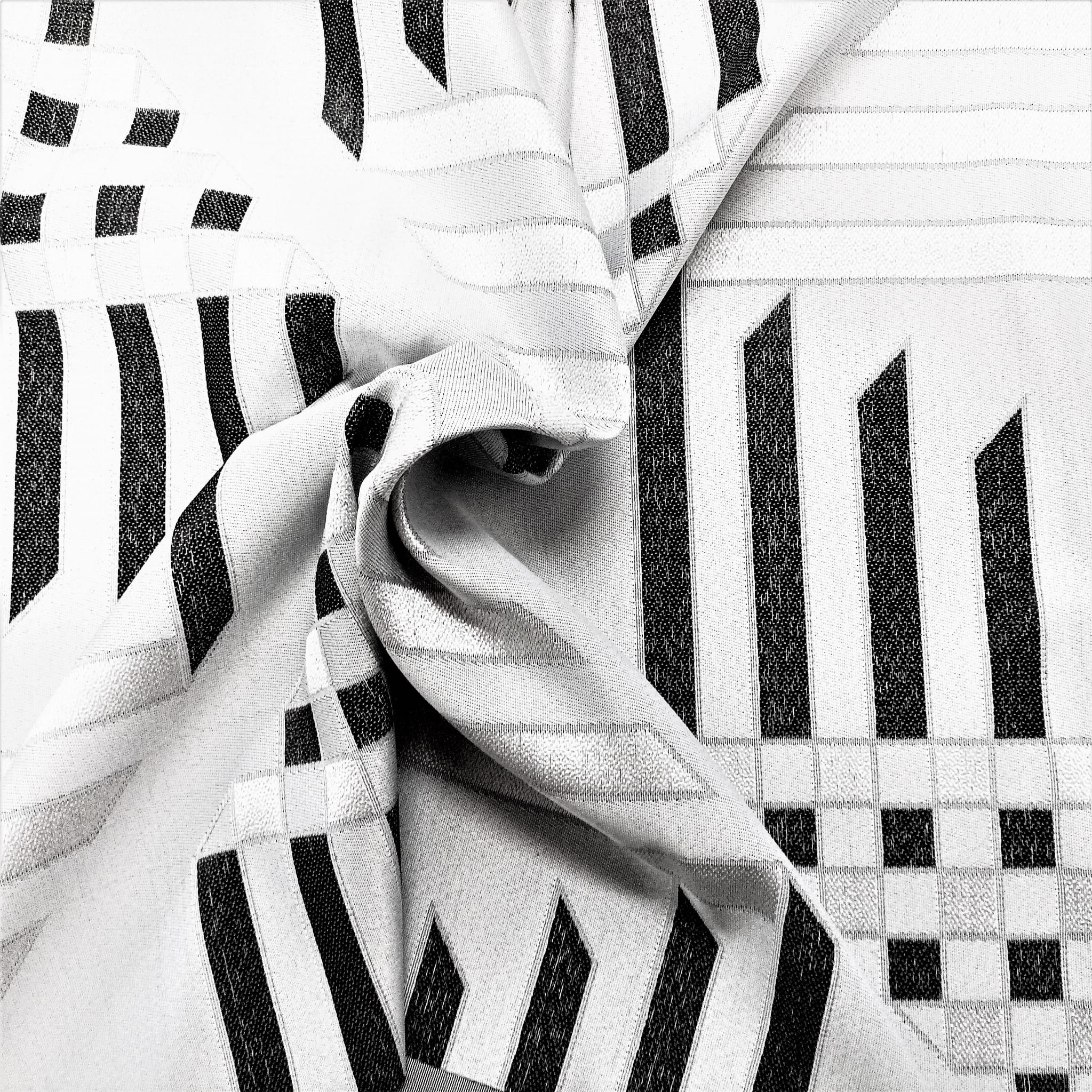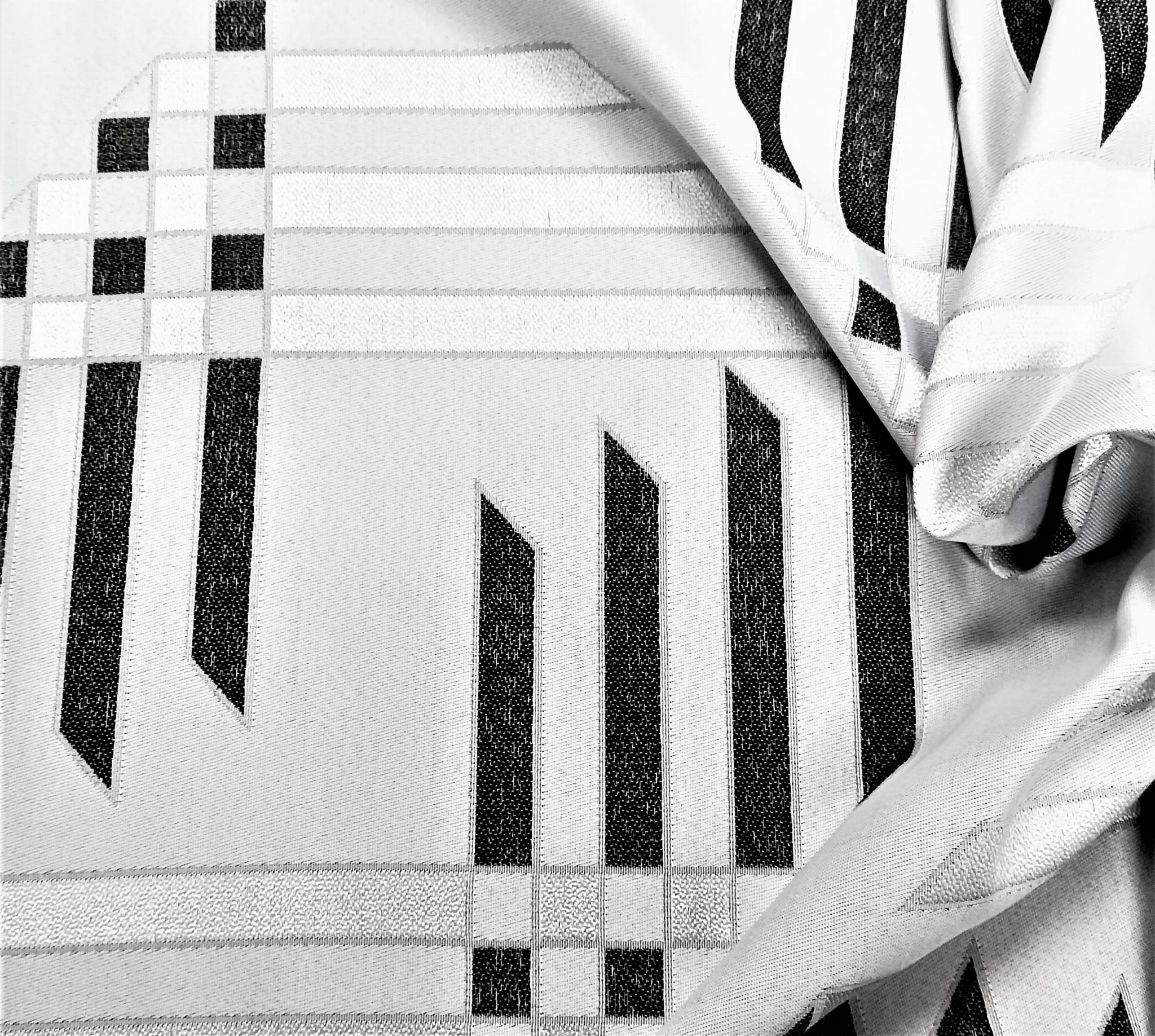 ORYGINALNA TKANINA ZASŁONOWA O CIEKAWYM WZORZE GEOMETRYCZNYM W KLASYCZNYCH BARWACH BIELI CZERNI I SZAROŚCI SZEROKOŚĆ 170 CM PRODUCENT HAFT KALISZ
