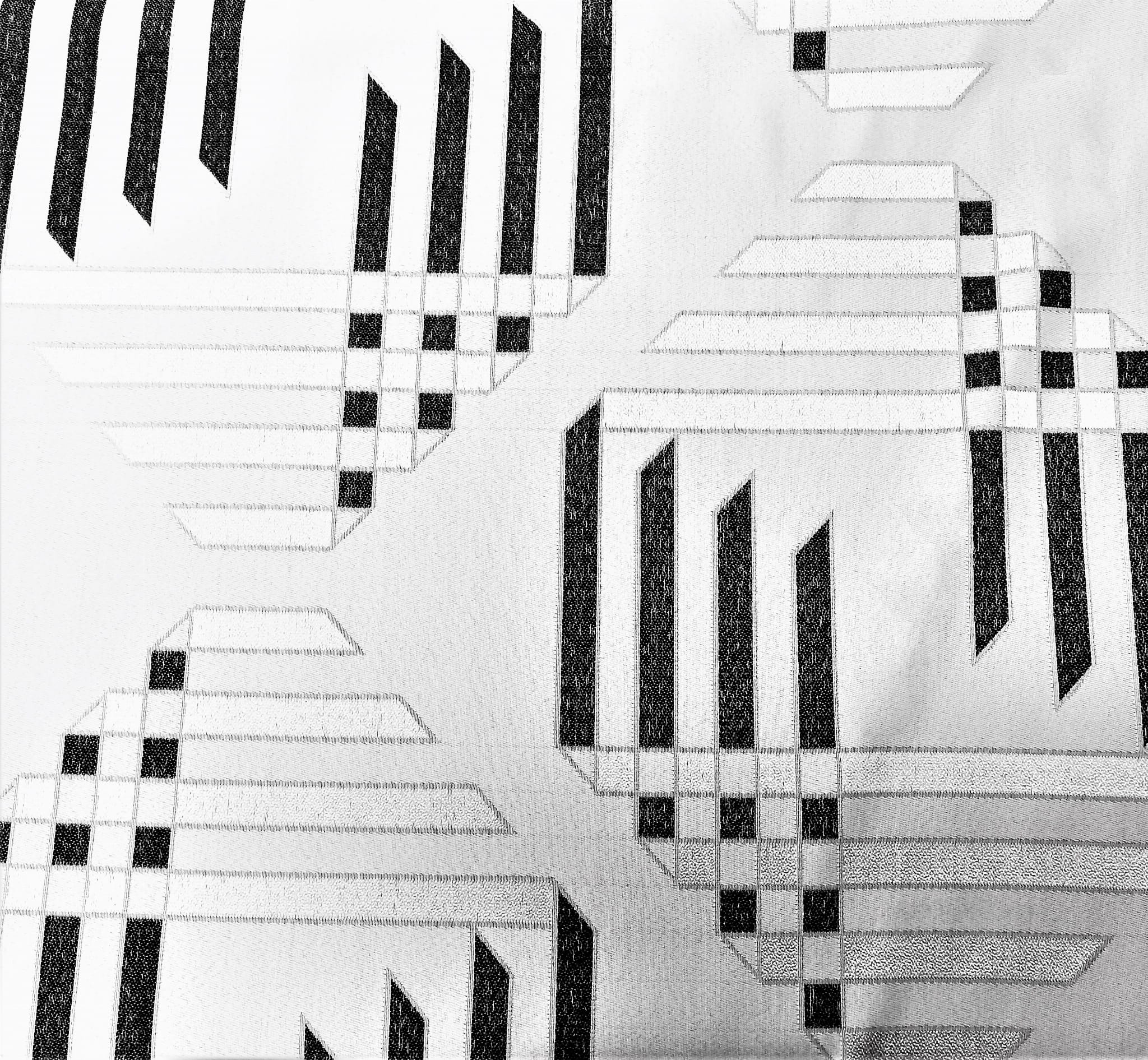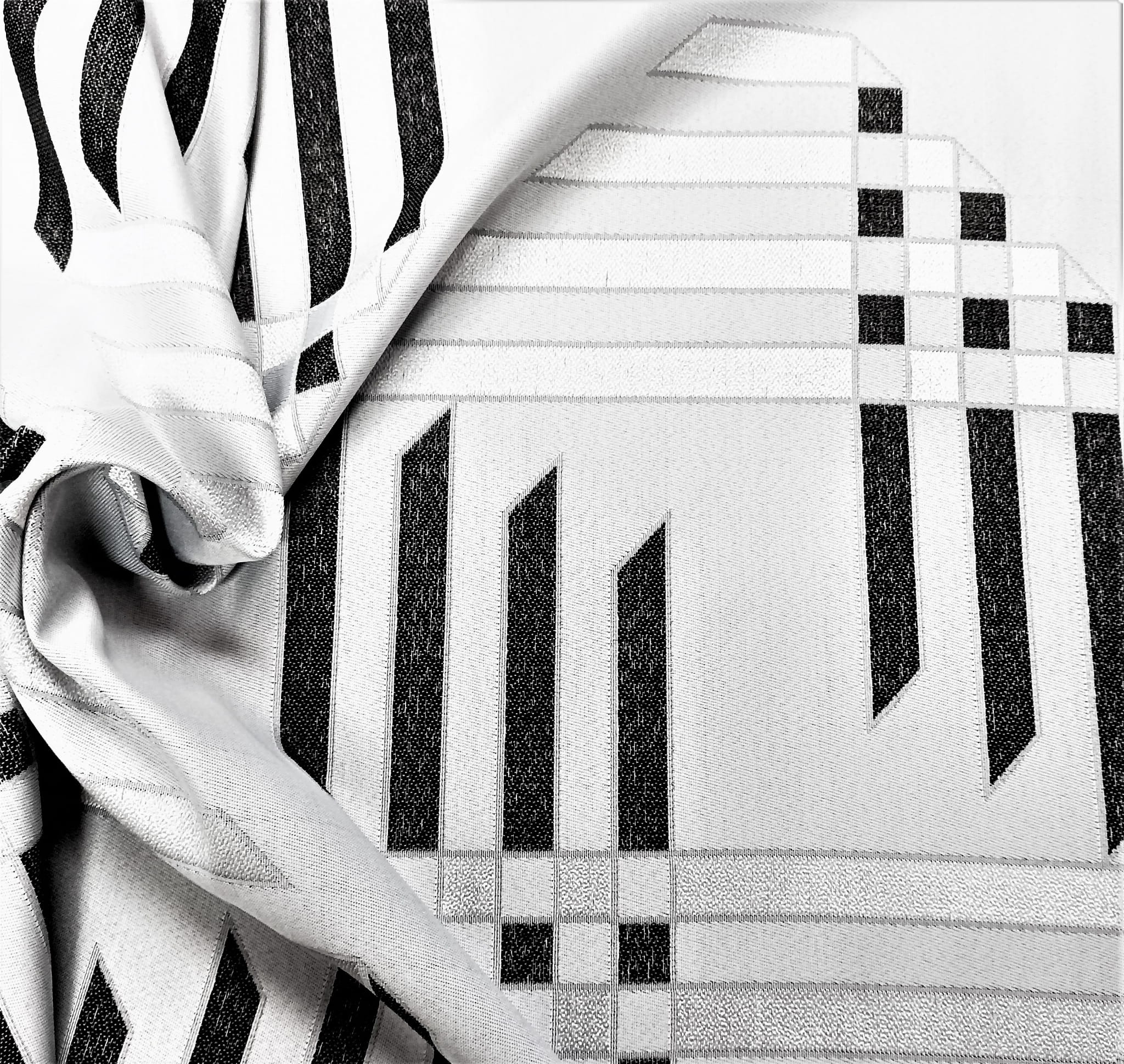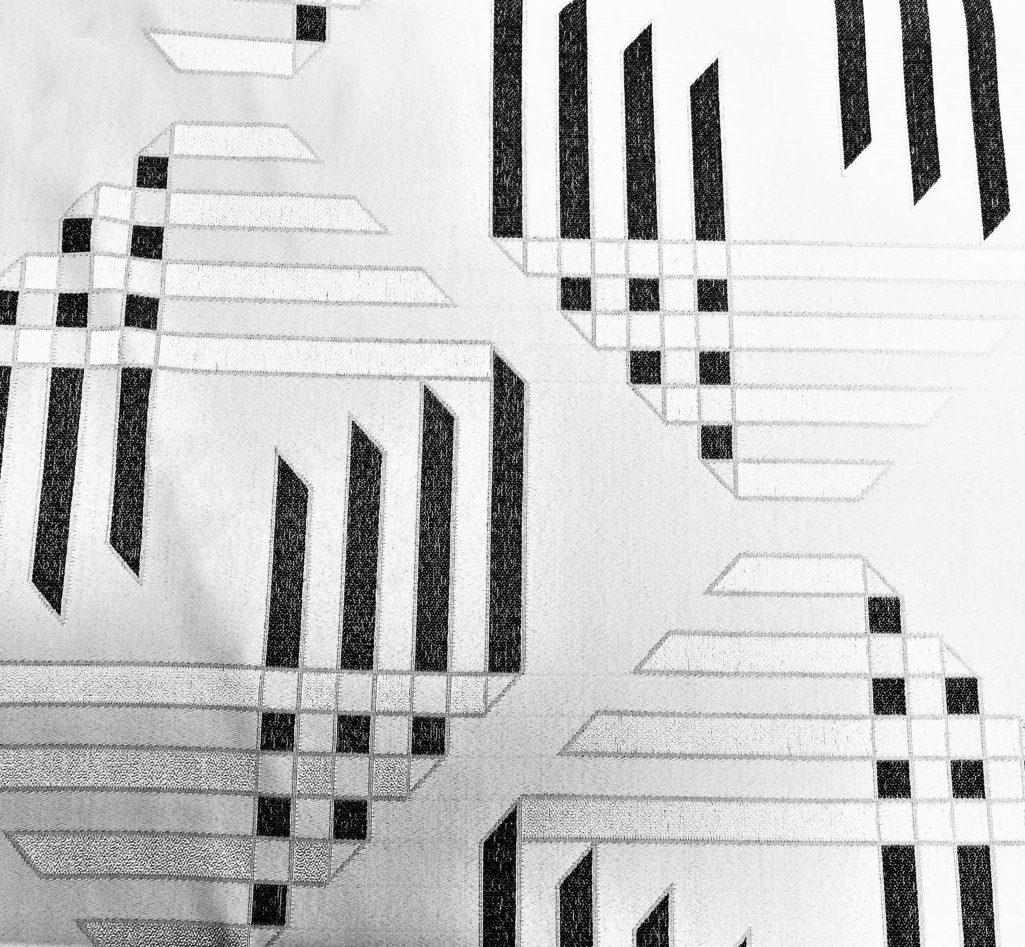 ORYGINALNA TKANINA ZASŁONOWA O CIEKAWYM WZORZE GEOMETRYCZNYM W KLASYCZNYCH BARWACH BIELI CZERNI I SZAROŚCI SZEROKOŚĆ 170 CM PRODUCENT HAFT KALISZ