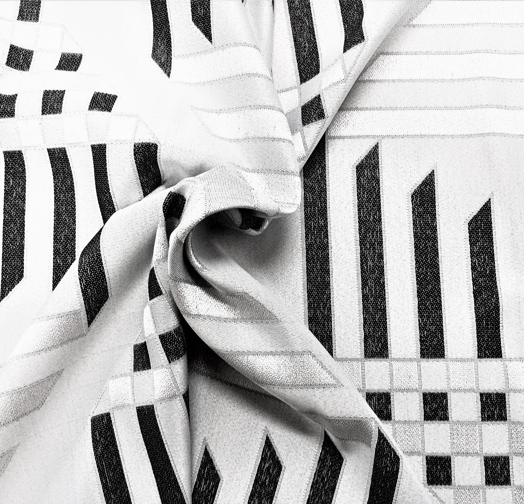 ORYGINALNA TKANINA ZASŁONOWA O CIEKAWYM WZORZE GEOMETRYCZNYM W KLASYCZNYCH BARWACH BIELI, CZERNI I SZAROŚCI DOSKONALE WPISUJE SIĘ W AKTUALNE TRENDY DEKORACYJNE. UNIWERSALNY, GEOMETRYCZNY PRINT CZYNI ARANŻACJĘ NOWOCZESNĄ I NIEZWYKLE ORYGINALNĄ. TKANINA POSIADA WŁAŚCIWOŚCI KRYJĄCE, CHRONI PRZEZ NADMIERNYM ŚWIATŁEM I PIĘKNIE SIĘ UKŁADA. HARMONIJNE POŁĄCZENIE STONOWANEJ SZAROŚCI, KLASYCZNEJ BIELI I PONADCZASOWEJ CZERNI WPROWADZA DO WNĘTRZA SUBTELNĄ ELEGANCJĘ I NADAJE EFEKTOWNEGO SZYKU.