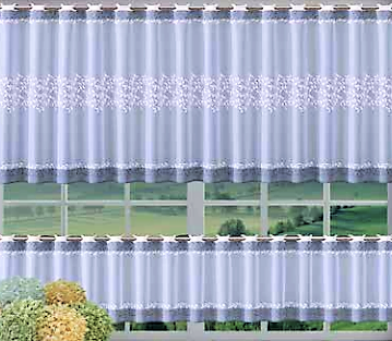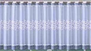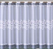 ORYGINALNA ŻAKARDOWA ZAZDROSTKA KUCHENNA W BIAŁYM KOLORZE Z DELIKATNYM ORNAMENTEM I WYKOŃCZENIAMI W KOLORZE PASTELOWEJ SZAROŚCI WYSOKOŚĆ 30 CM 60 CM 90 CM PRODUCENT HAFT KALISZ