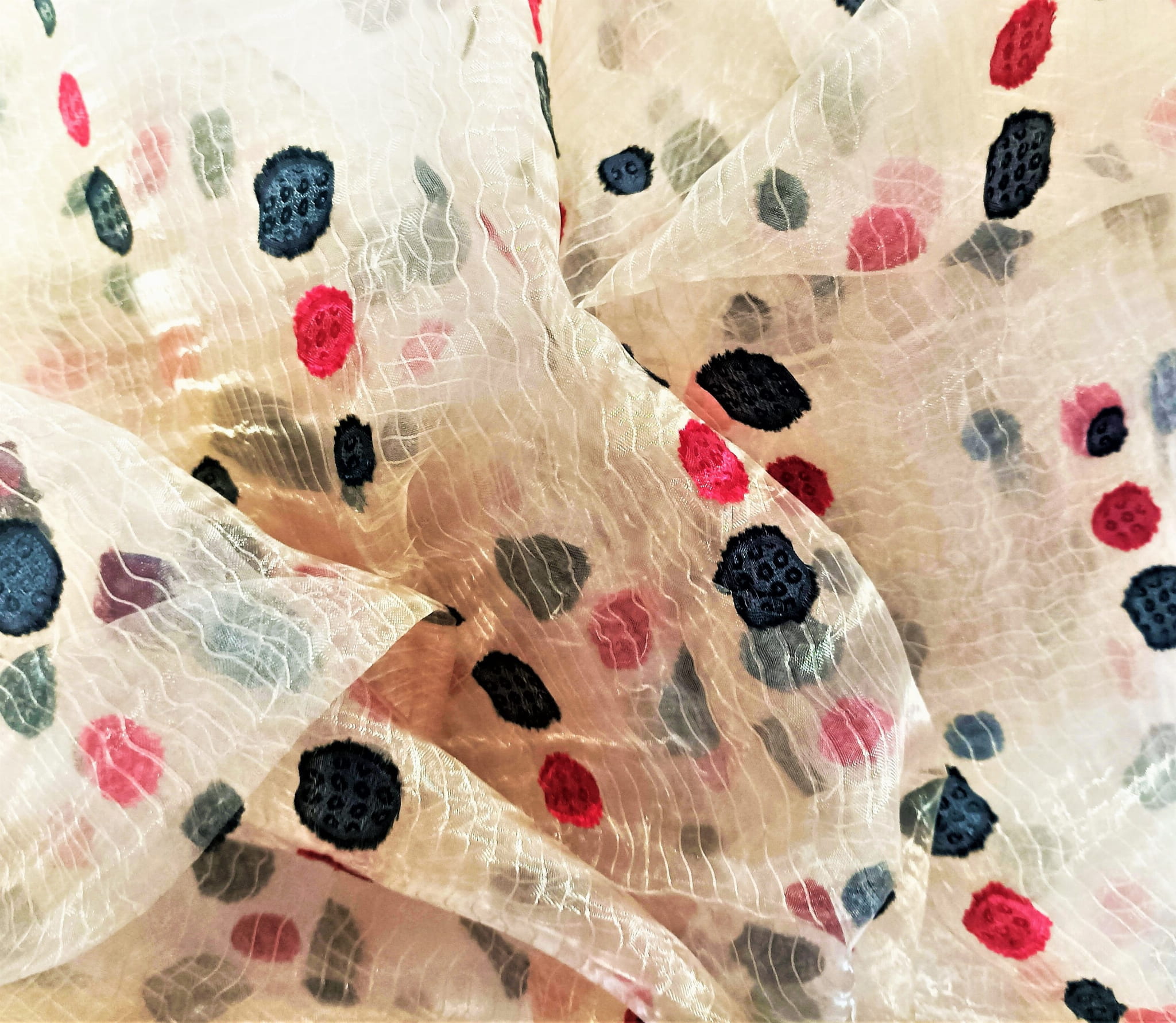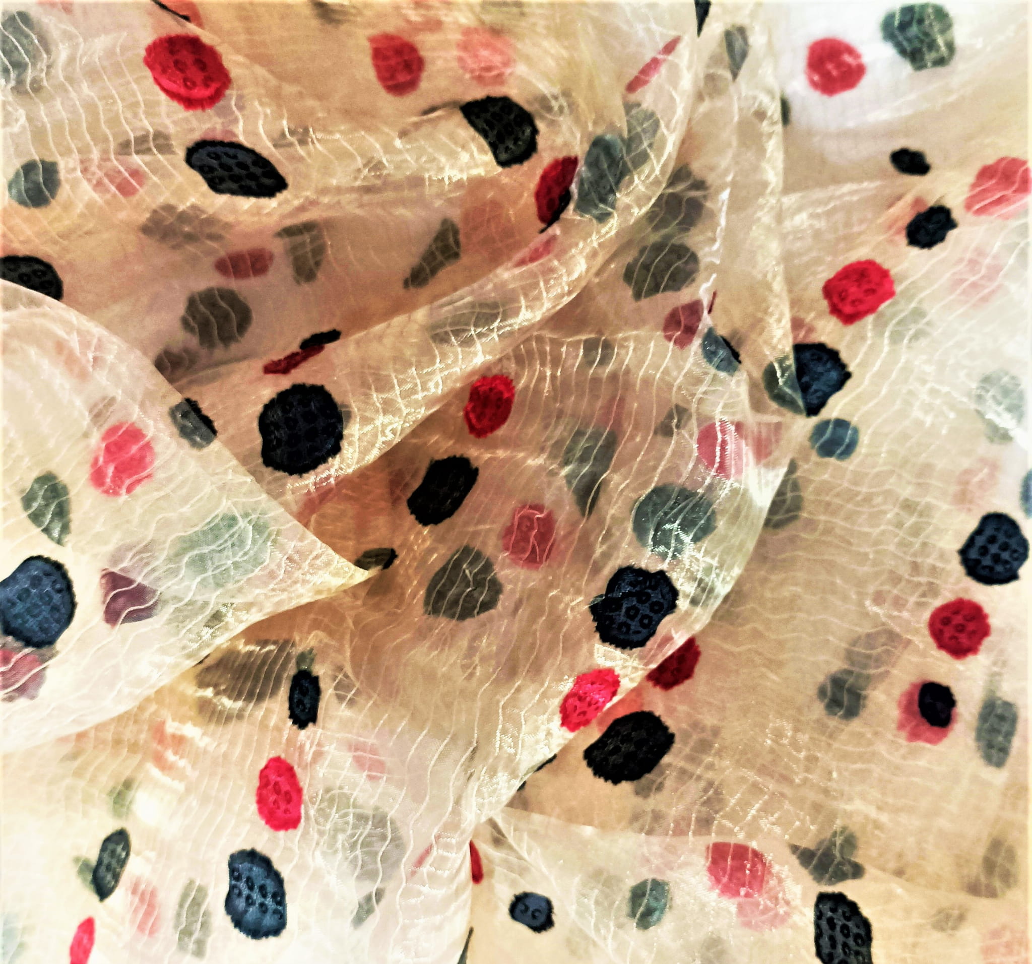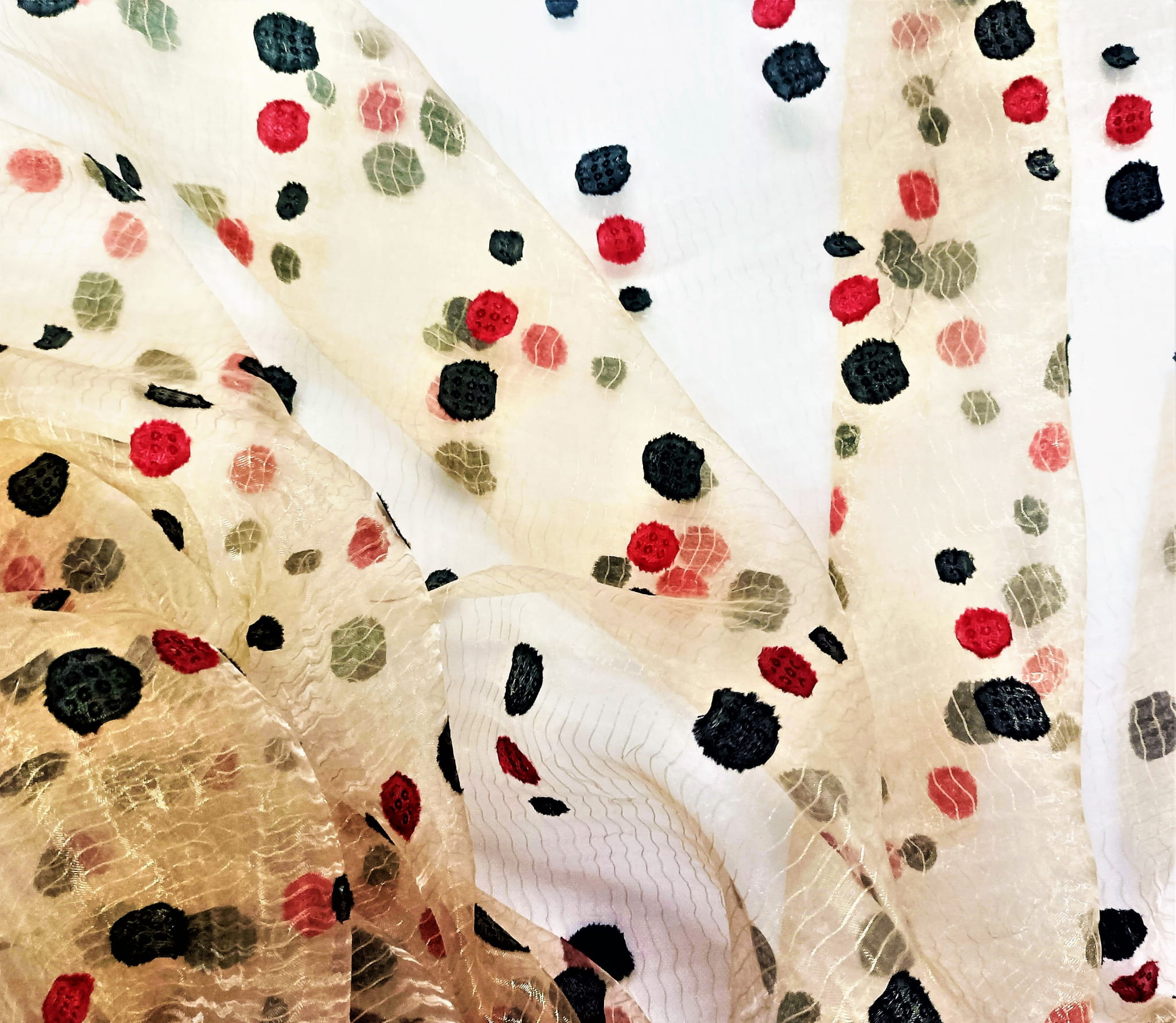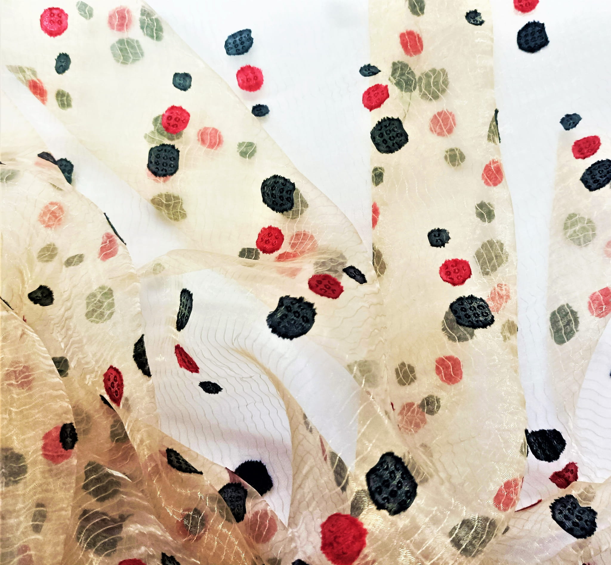 PEŁNA UROKU KRESZOWANA ORGANTYNA PREMIUM W KOLORZE CIEPŁEGO BEŻU Z GEOMETRYCZNYM WZOREM W POSTACI HAFTOWANYCH KROPEK W BARWIE CZERNI I CZERWIENI Z POŁYSKIEM GLAMOUR PREZENTUJE SIĘ DOSKONALE JAKO ORYGINALNA FIRANKA LUB OZDOBNA ZASŁONA. ORYGINALNE ZESTAWIENIE KOLORYSTYCZNE W POŁĄCZENIU Z KRESZOWANĄ STRUKTURĄ ORGANTYNY I EFEKTOWNYM PRINTEM NADAJE WNĘTRZU STYLOWEJ ELEGANCJI I PODKREŚLA NIEBANALNY, PONADCZASOWY KLIMAT ARANŻACJI OKNA.