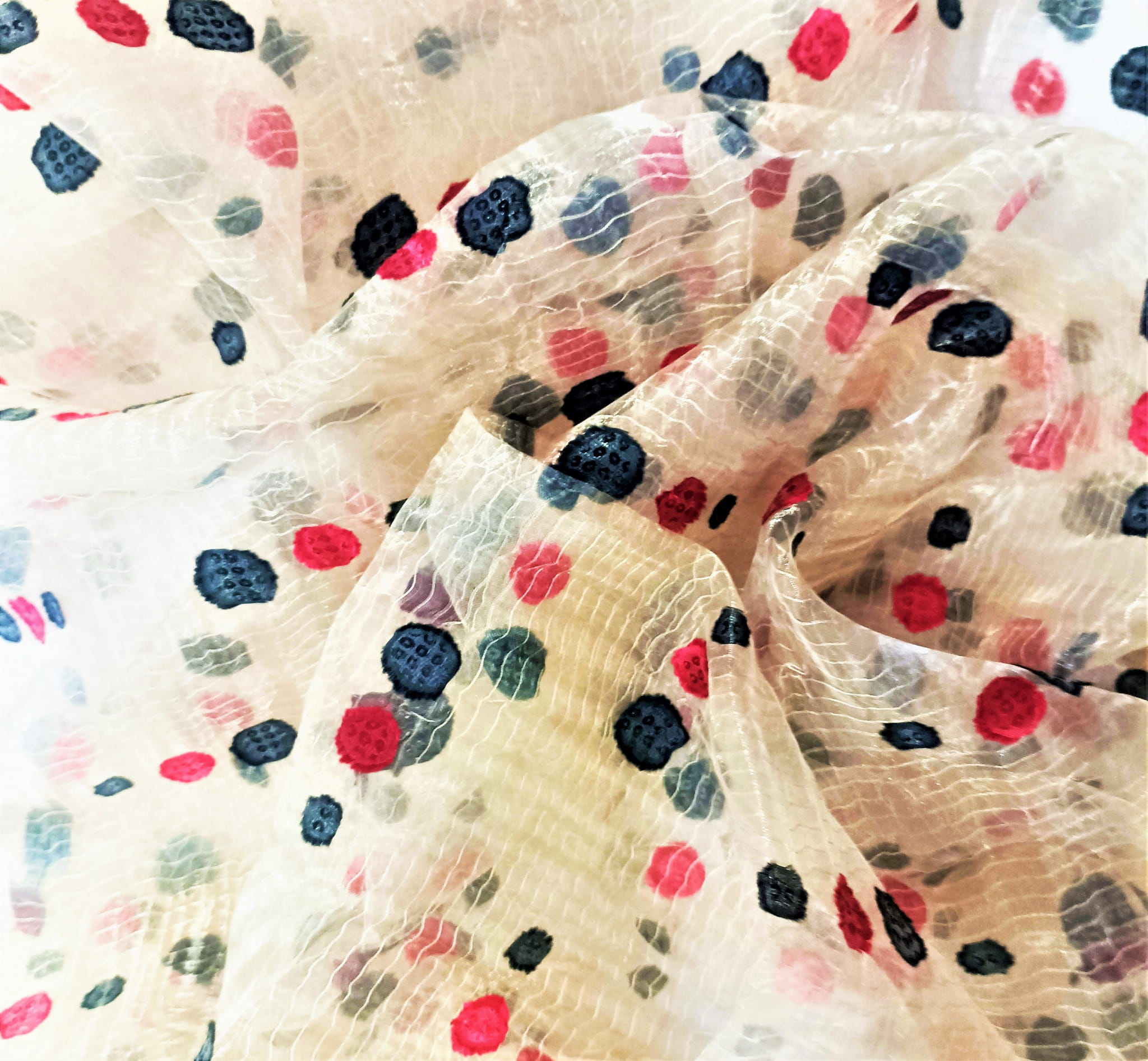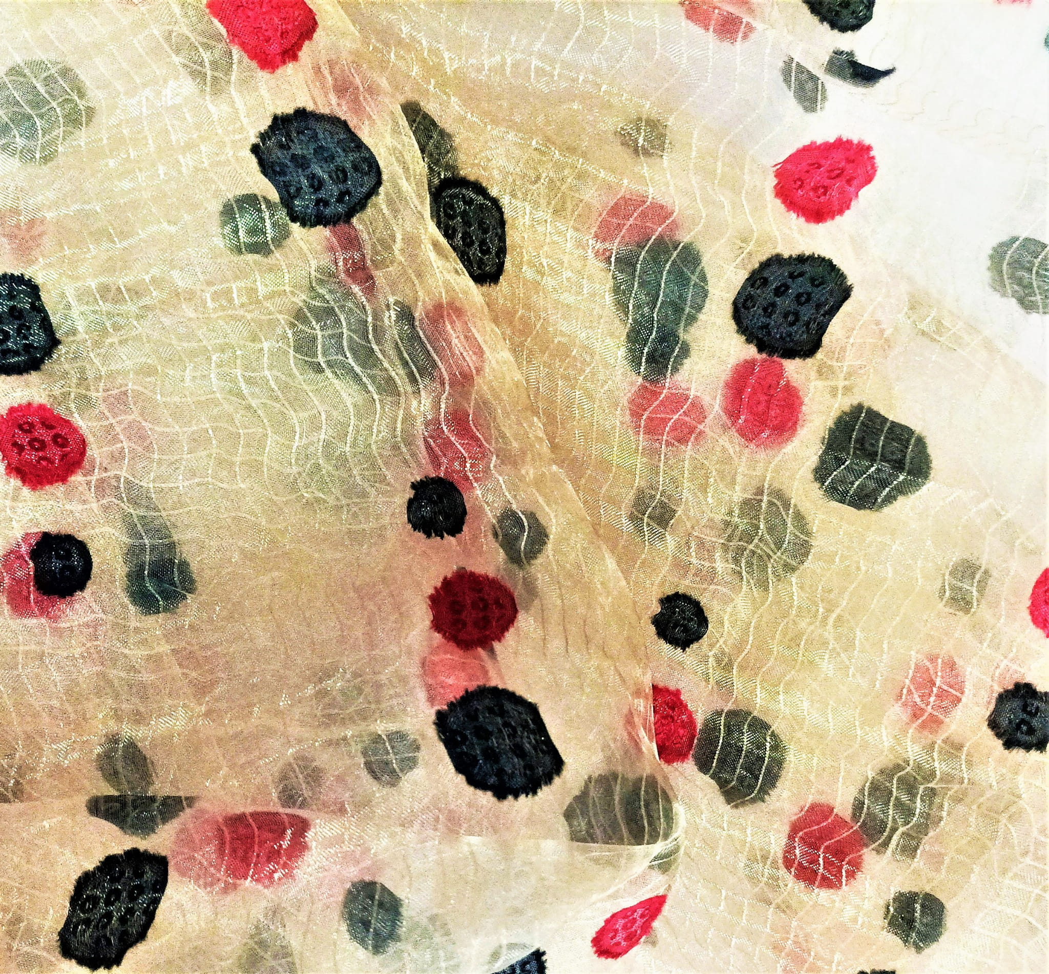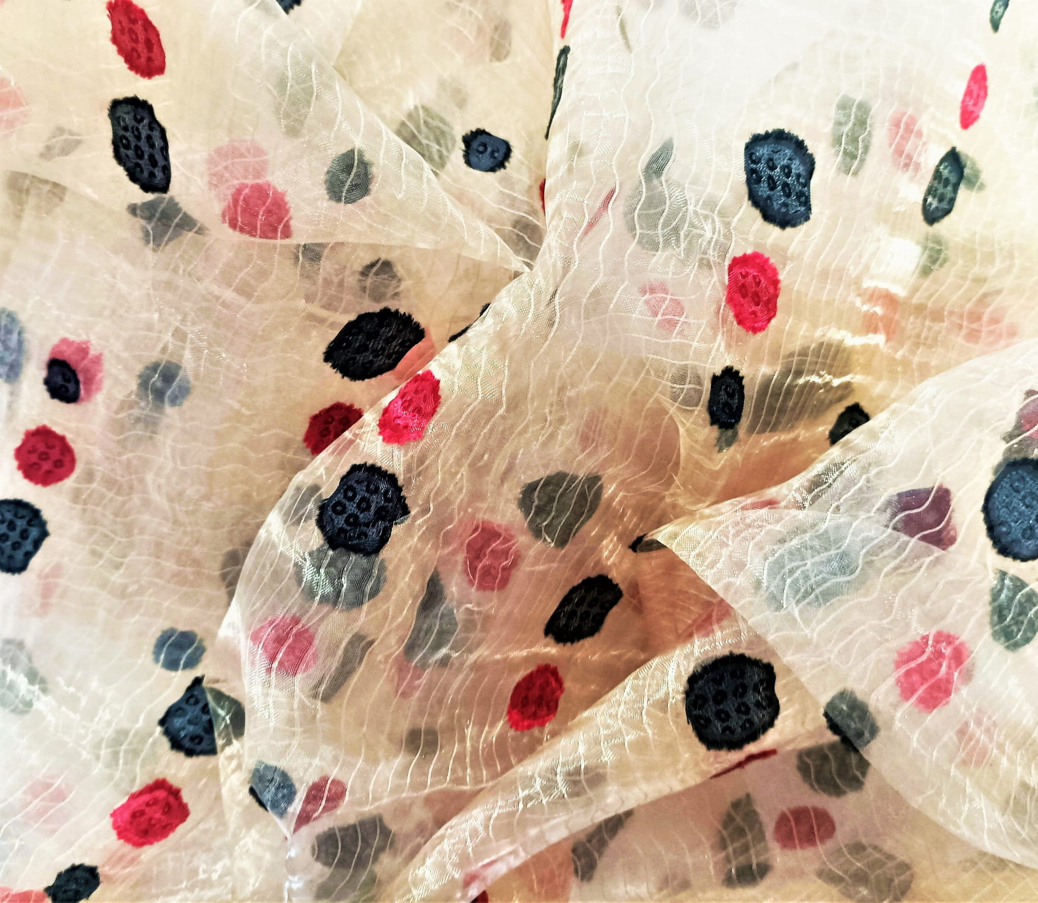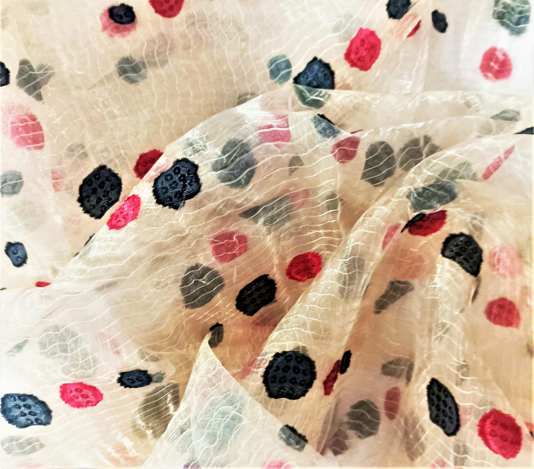 PEŁNA UROKU KRESZOWANA ORGANTYNA PREMIUM W KOLORZE CIEPŁEGO BEŻU Z GEOMETRYCZNYM WZOREM W POSTACI HAFTOWANYCH KROPEK W BARWIE CZERNI I CZERWIENI Z POŁYSKIEM GLAMOUR PREZENTUJE SIĘ DOSKONALE JAKO ORYGINALNA FIRANKA LUB OZDOBNA ZASŁONA. ORYGINALNE ZESTAWIENIE KOLORYSTYCZNE W POŁĄCZENIU Z KRESZOWANĄ STRUKTURĄ ORGANTYNY I EFEKTOWNYM PRINTEM NADAJE WNĘTRZU STYLOWEJ ELEGANCJI I PODKREŚLA NIEBANALNY, PONADCZASOWY KLIMAT ARANŻACJI OKNA.