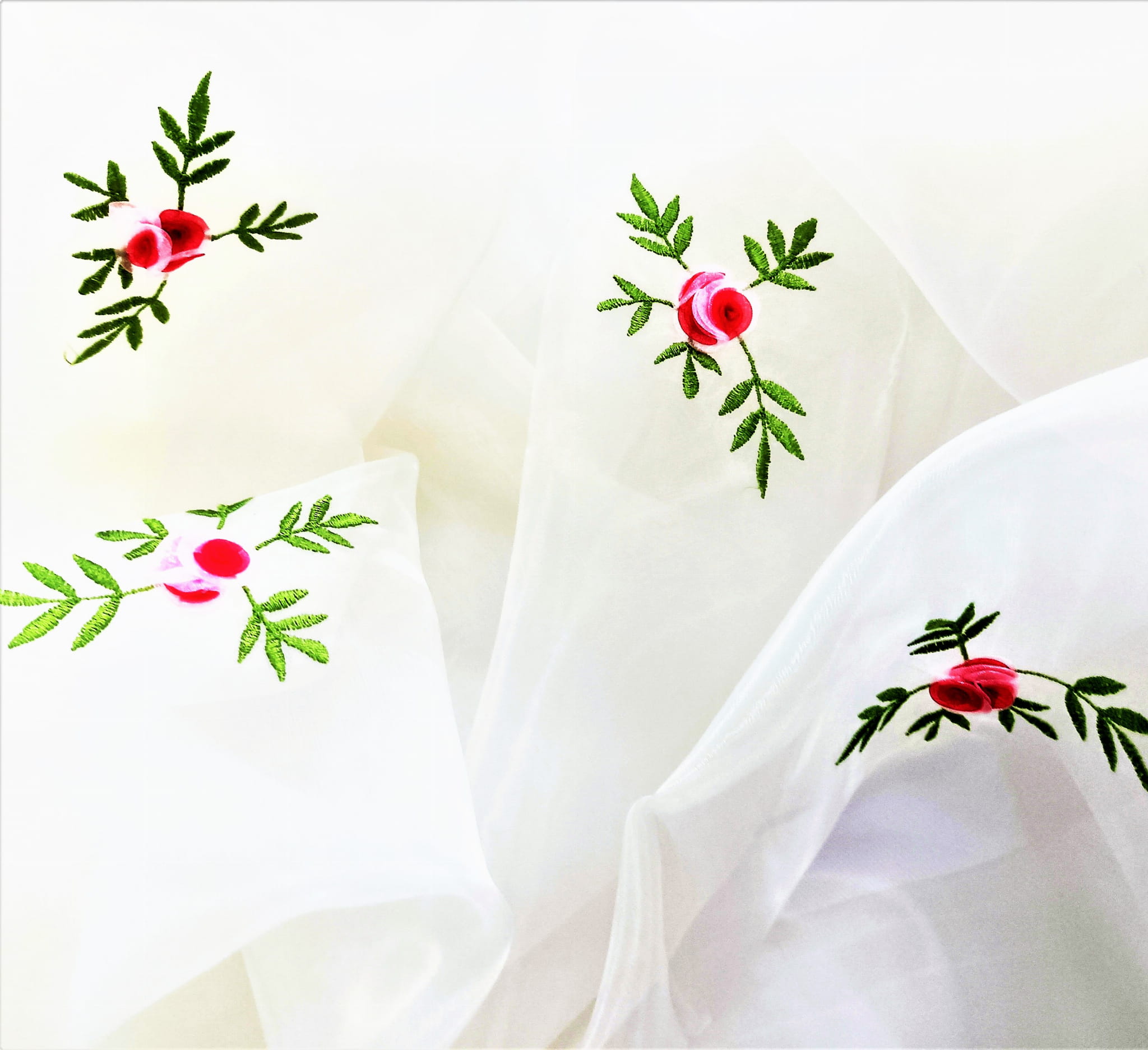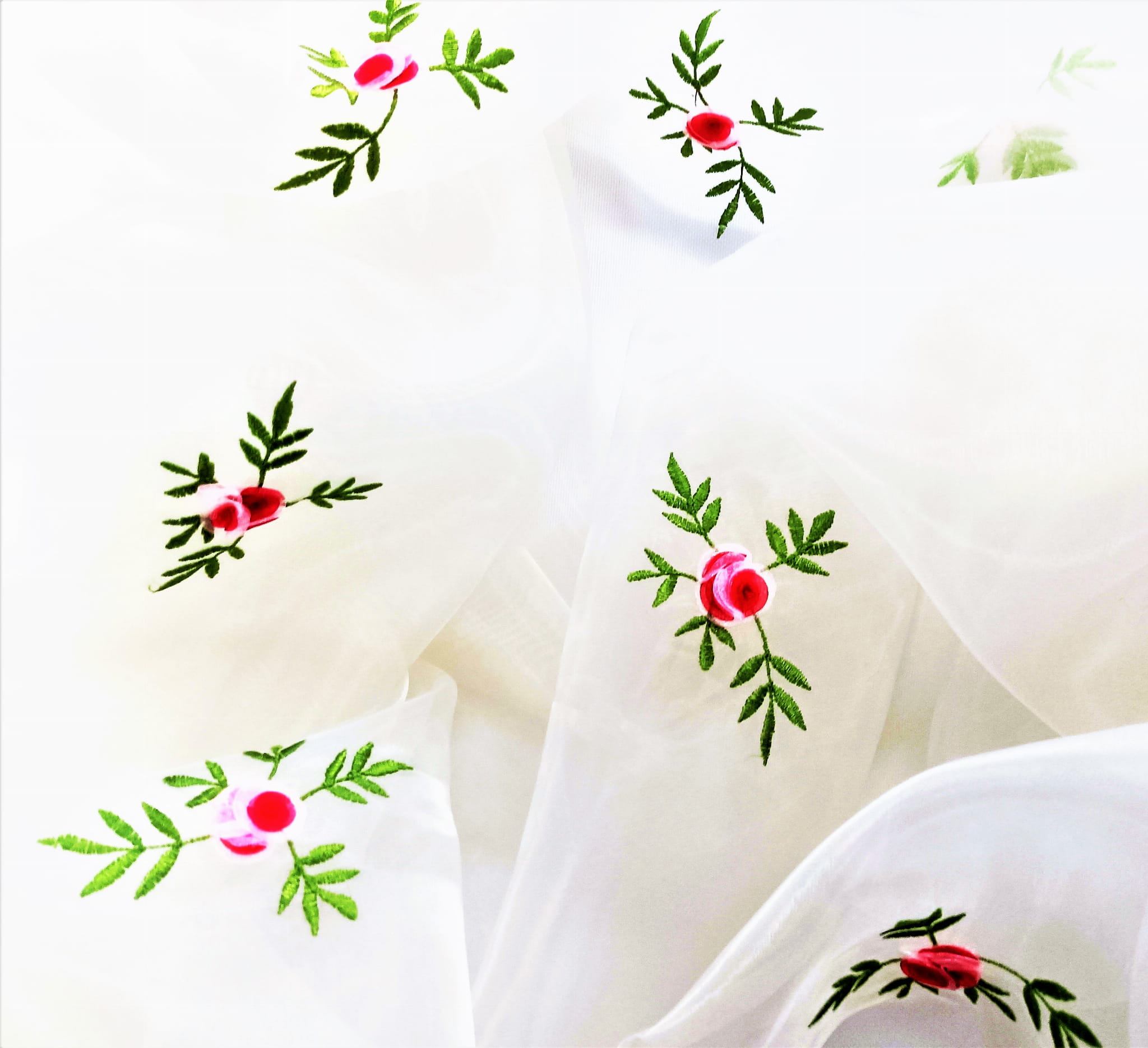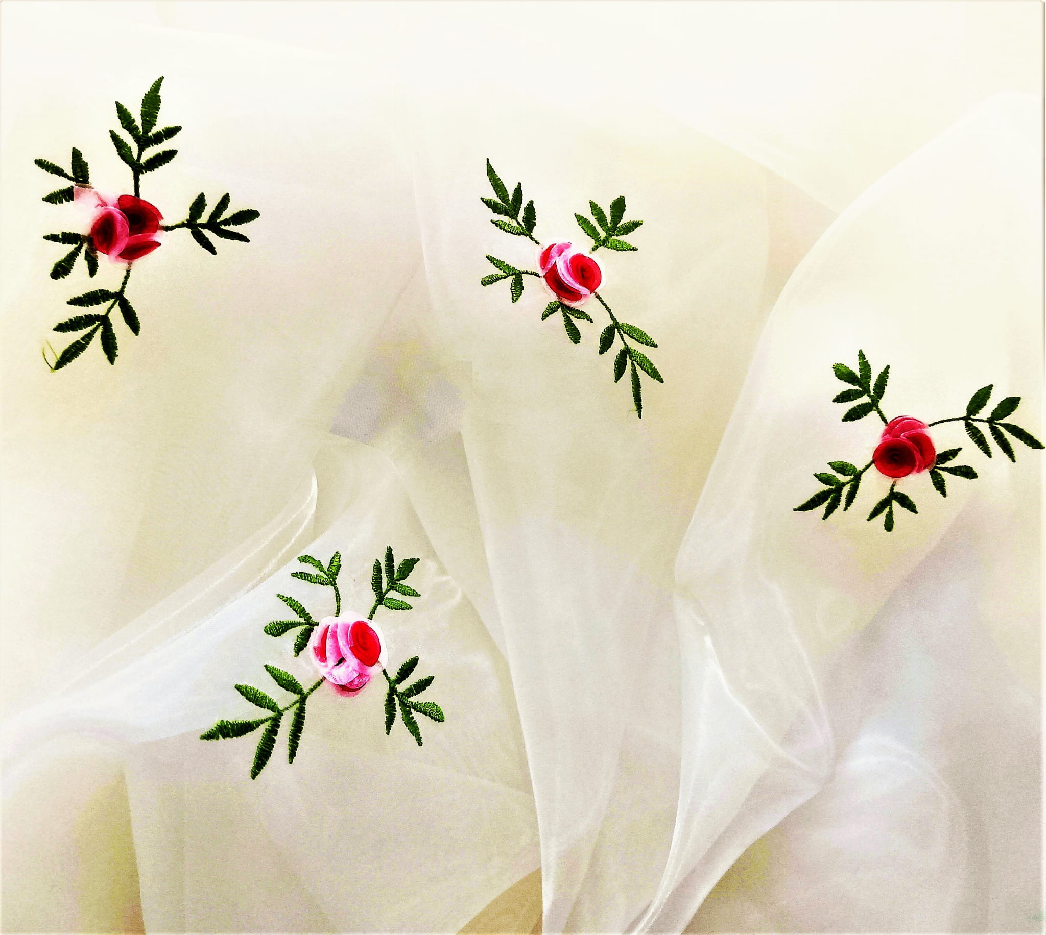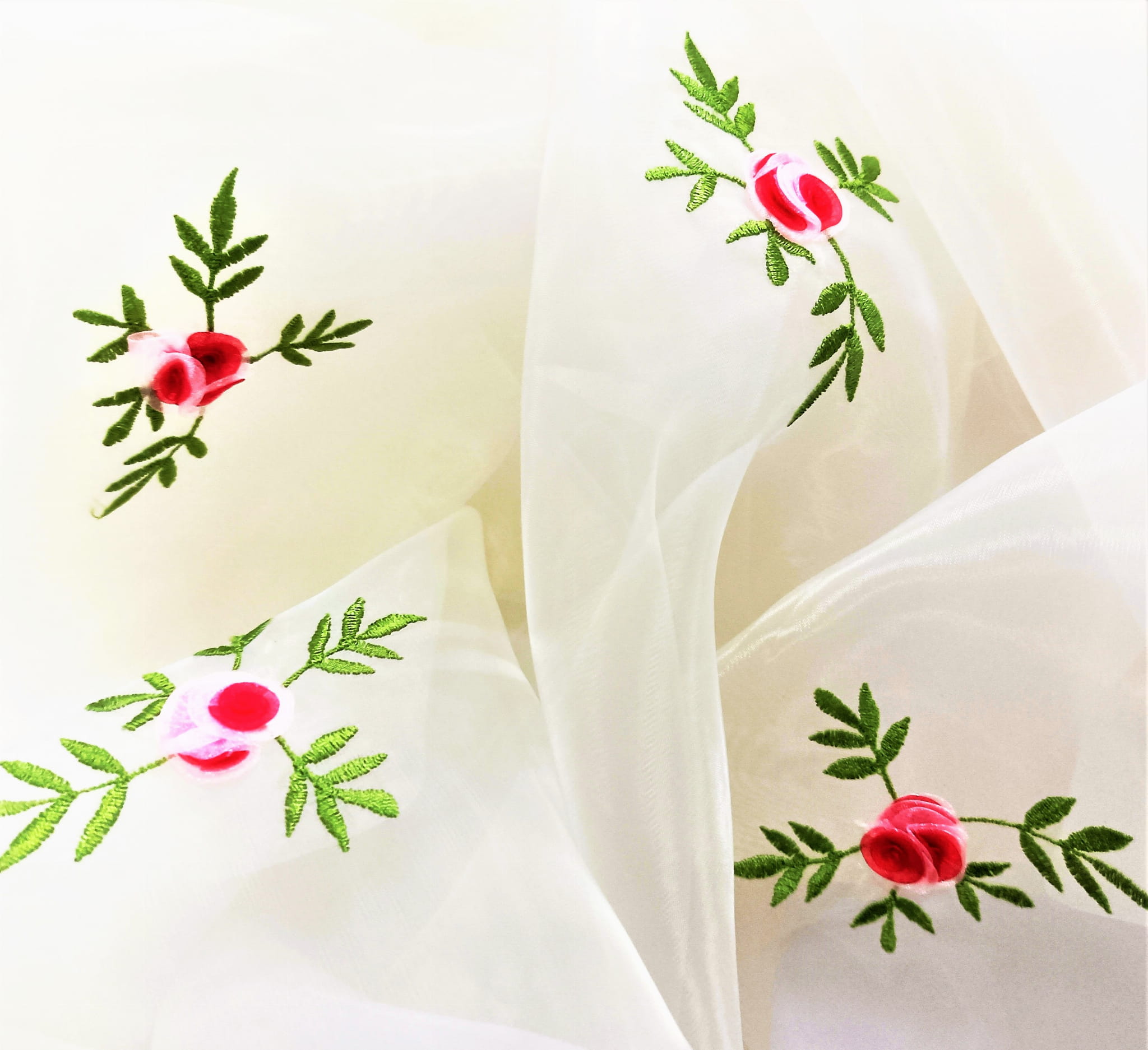 PEŁNA UROKU ORGANTYNA PREMIUM Z HAFTOWANYM WZOREM W POSTACI SUBTELNYCH RÓŻYCZEK W BARWACH CZERWIENI RÓŻU I ZIELENI NA TLE W DELIKATNYM KOLORZE ECRU WYSOKOŚĆ 275 CM PRODUCENT POLONTEX CZĘSTOCHOWA