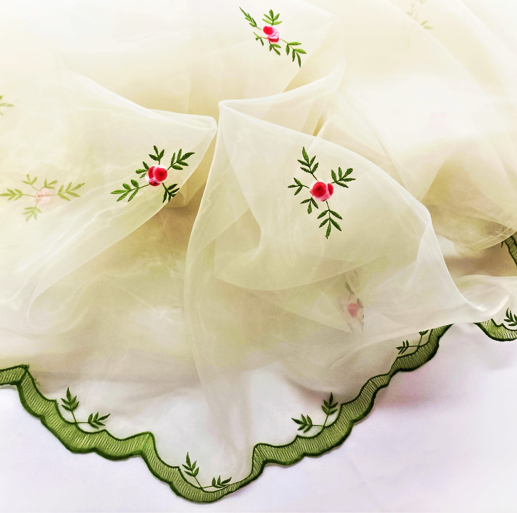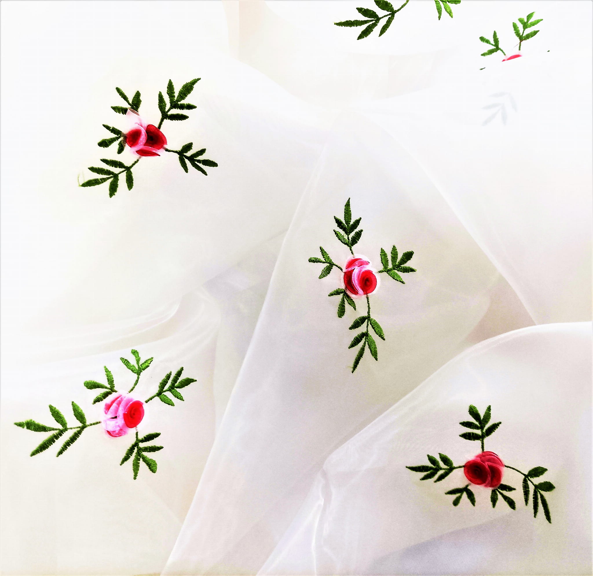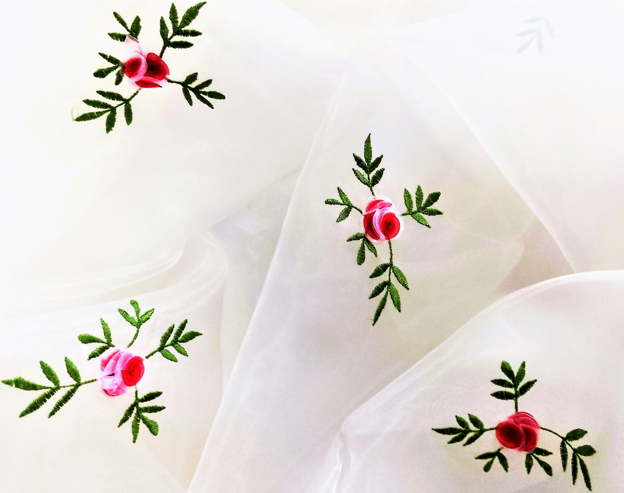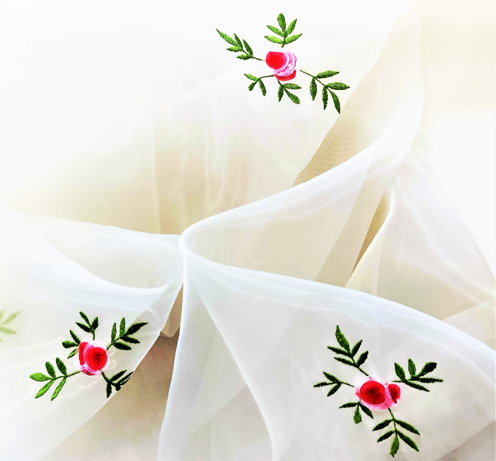 PEŁNA UROKU ORGANTYNA PREMIUM Z HAFTOWANYM WZOREM W POSTACI SUBTELNYCH RÓŻYCZEK W BARWACH CZERWIENI RÓŻU I ZIELENI NA TLE W DELIKATNYM KOLORZE ECRU WYSOKOŚĆ 275 CM PRODUCENT POLONTEX CZĘSTOCHOWA