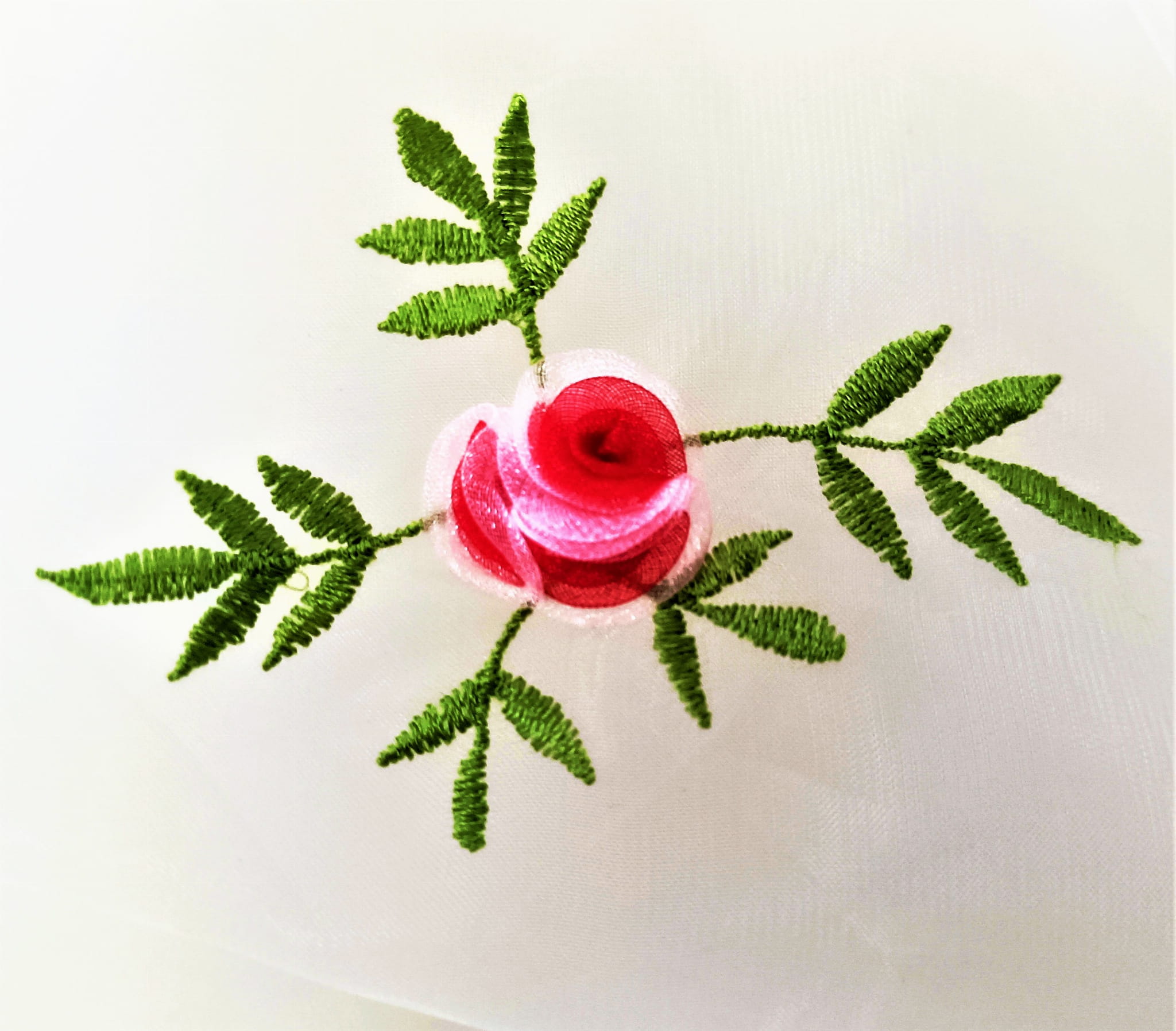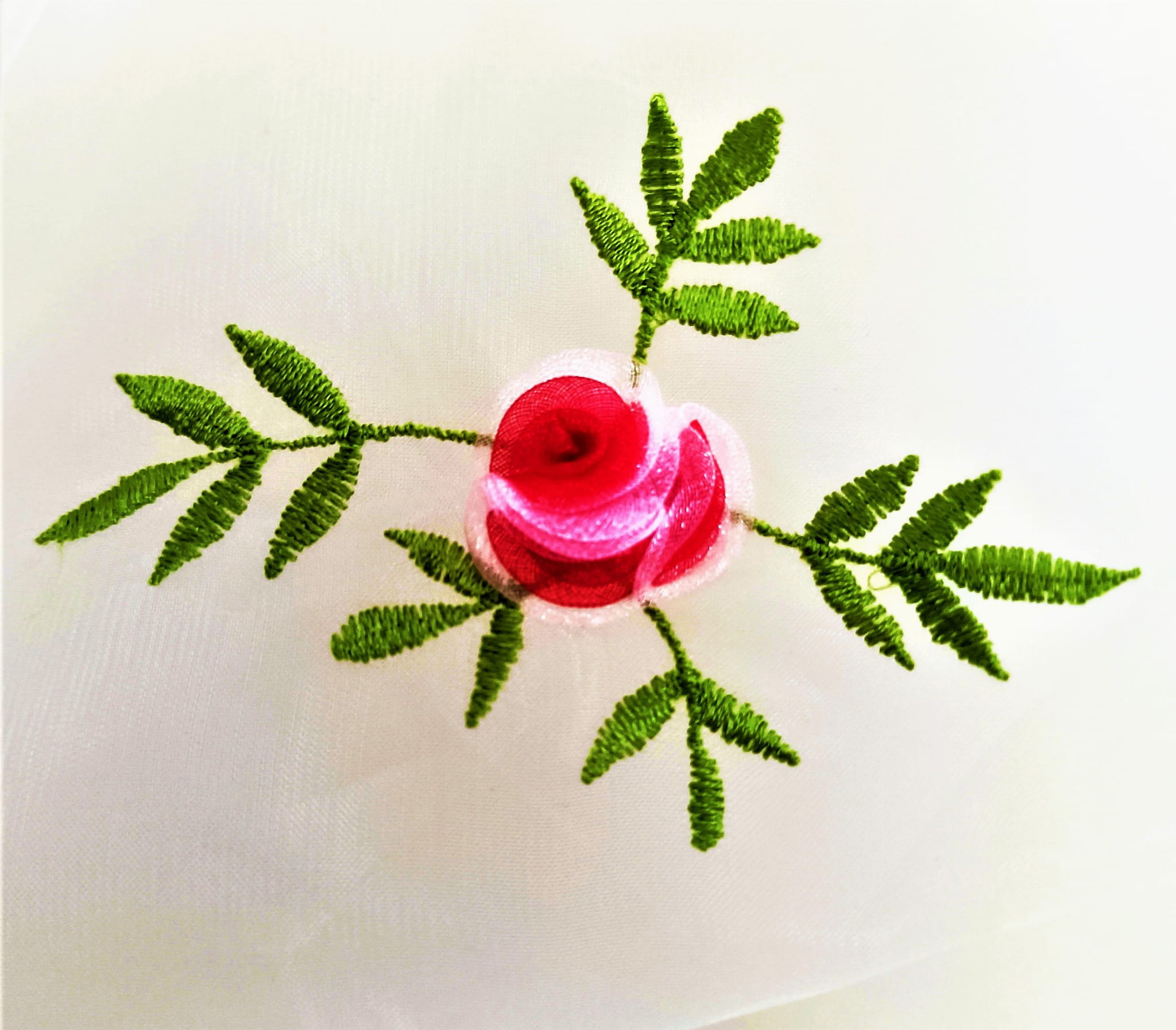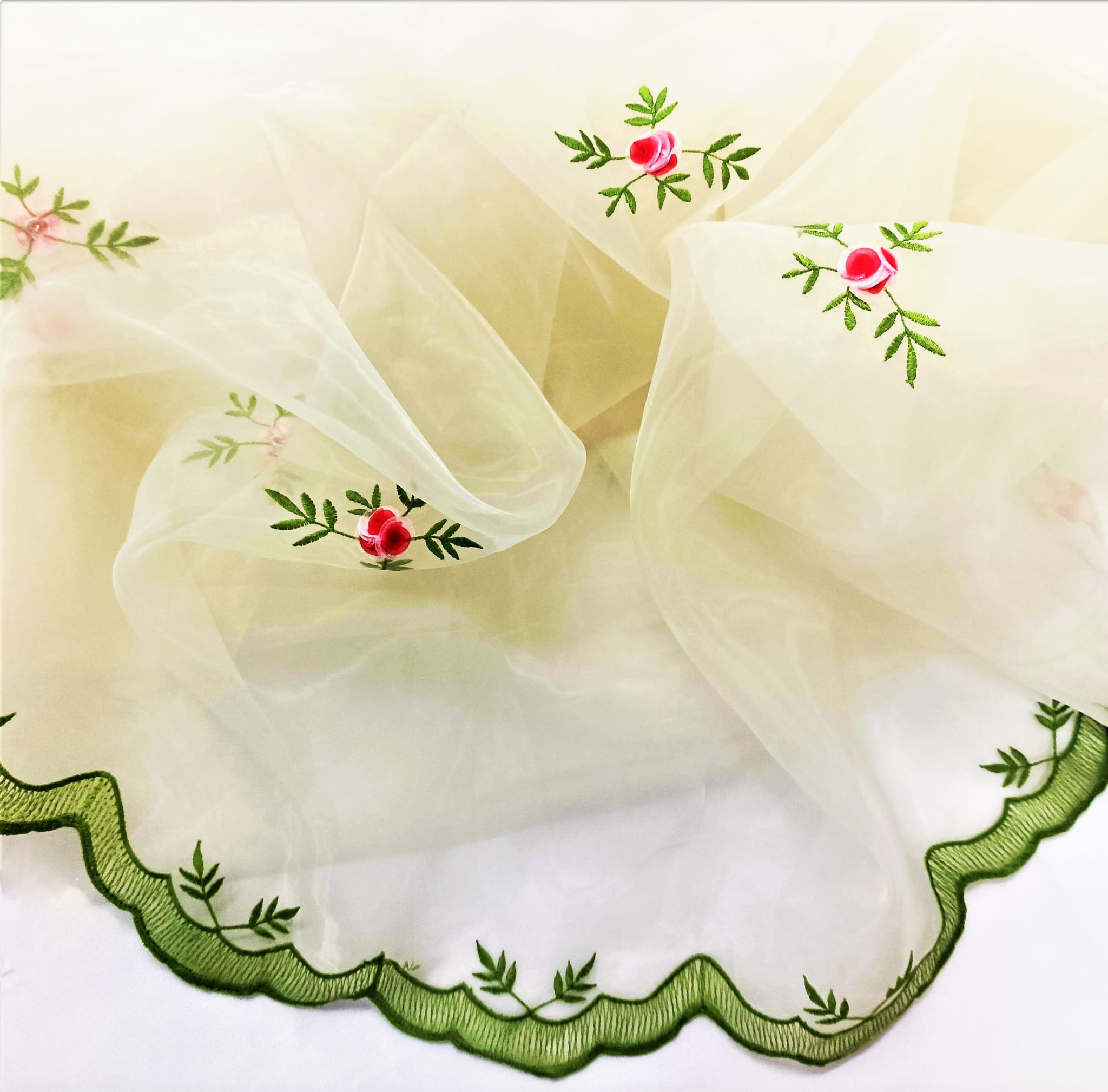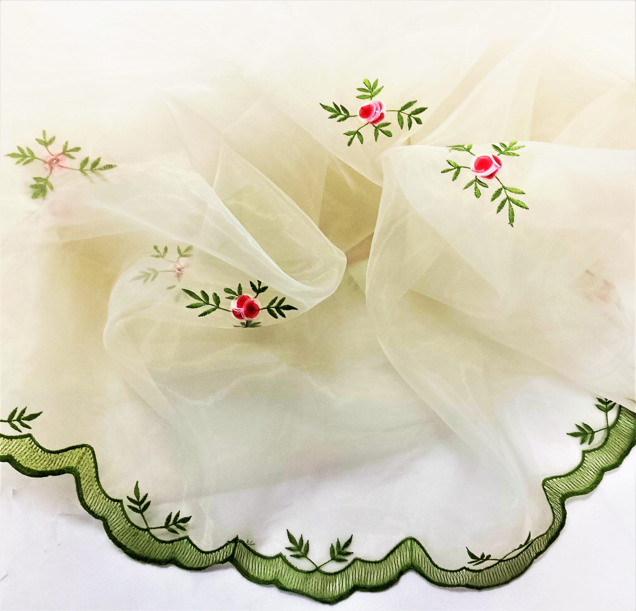 PEŁNA UROKU ORGANTYNA PREMIUM Z HAFTOWANYM WZOREM W POSTACI SUBTELNYCH RÓŻYCZEK W BARWACH CZERWIENI RÓŻU I ZIELENI NA TLE W DELIKATNYM KOLORZE ECRU WYSOKOŚĆ 275 CM PRODUCENT POLONTEX CZĘSTOCHOWA