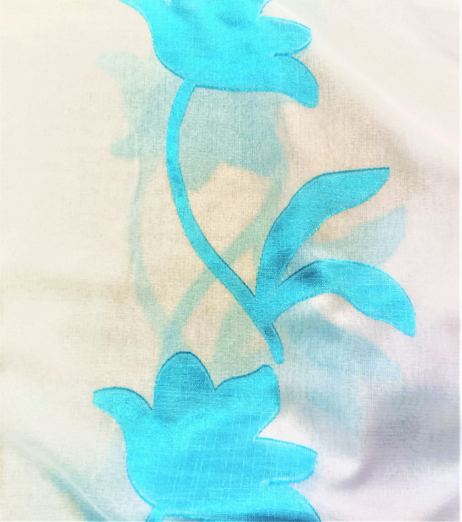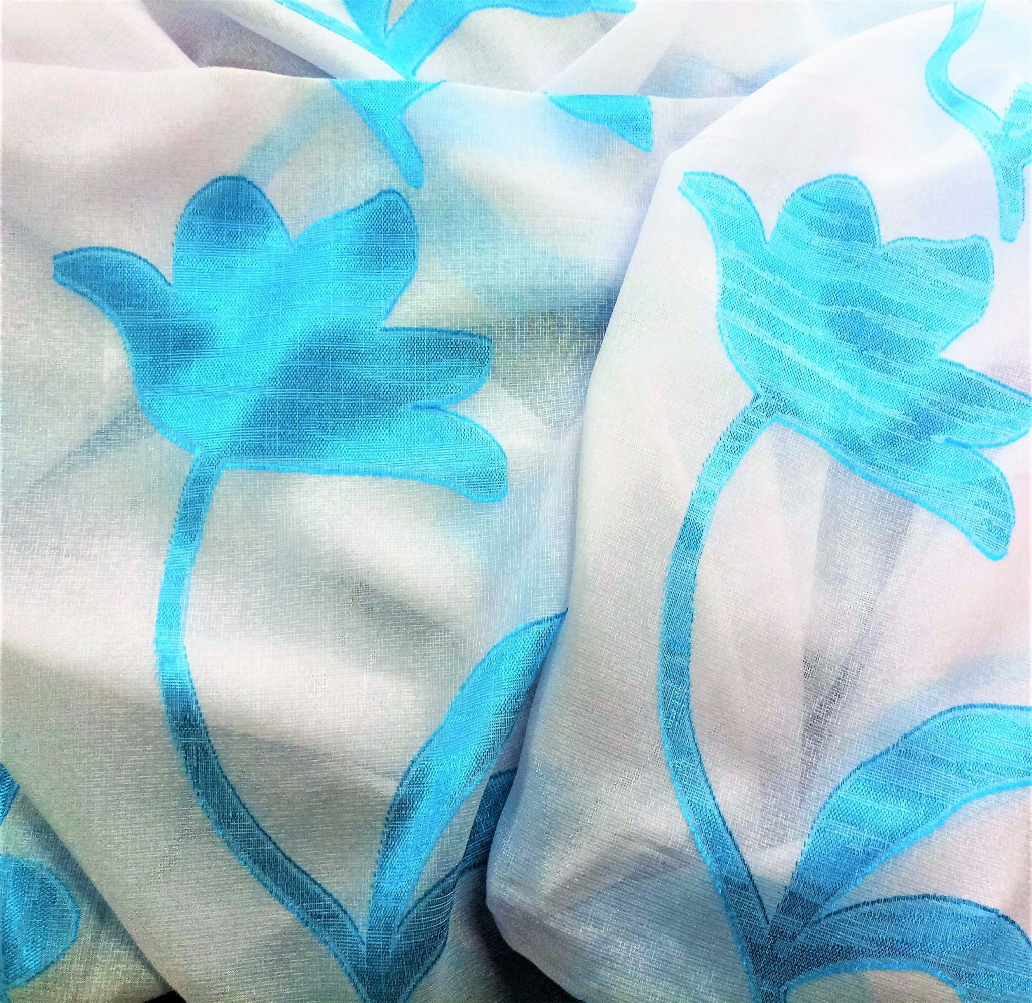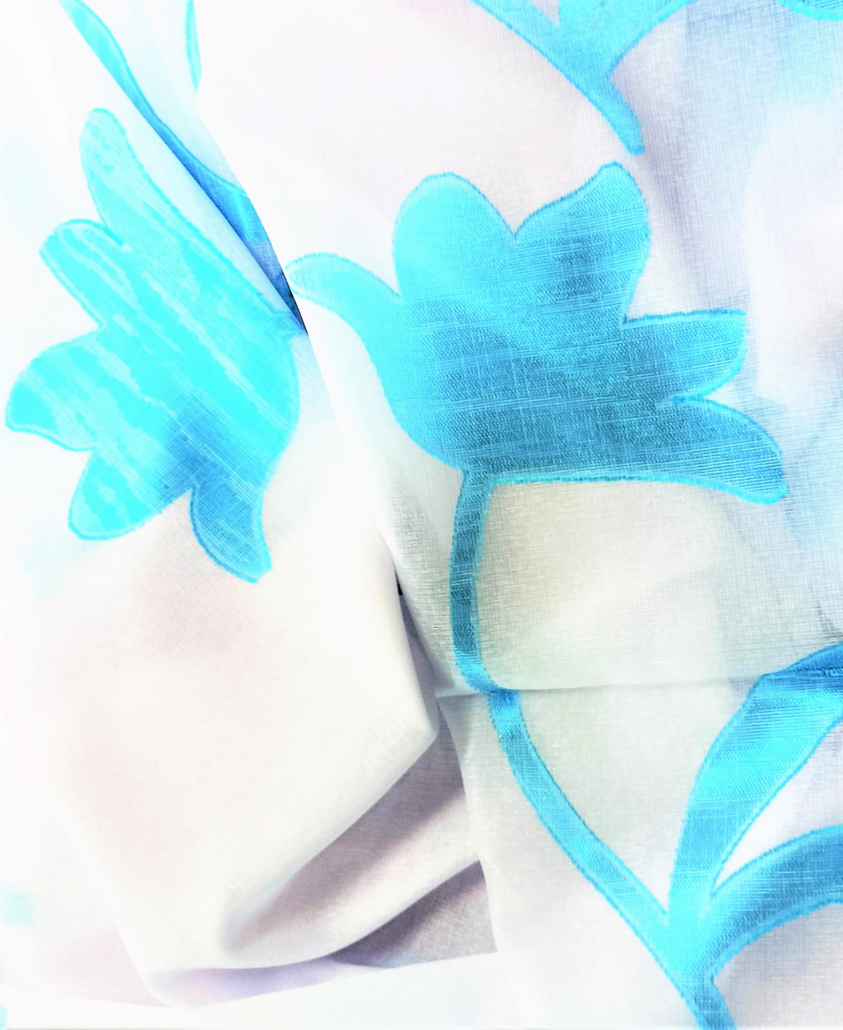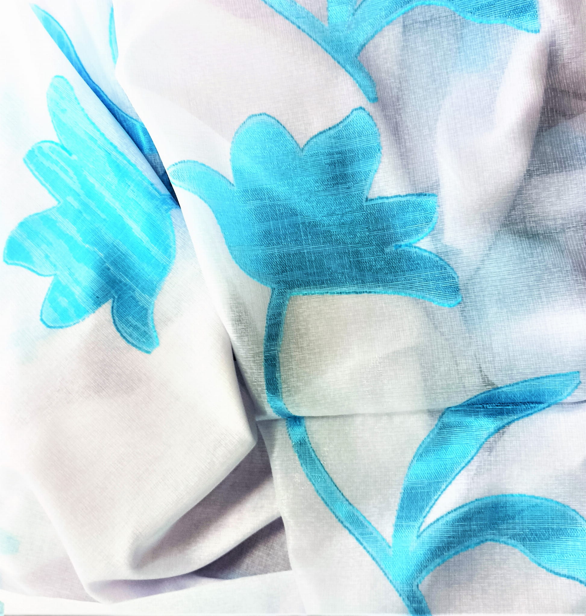 PIĘKNA I NIEZWYKLE WYJĄTKOWA FIRANA WOAL FRANCUSKI TYPU SABLE - Z JĘZYKA FRANCUSKIEGO "PIASEK" - W BIAŁYM KOLORZE Z EFEKTOWNYM WZOREM W POSTACI DUŻYCH, PIONOWO UŁOŻONYCH KWIATÓW W BŁĘKITNEJ BARWIE POŁYSK GLAMOUR PREZENTUJE SIĘ BARDZO ELEGANCKO I DOSKONALE SIĘ UKŁADA. POSIADA SZLACHETNĄ I NIEZWYKLE UNIKALNĄ STRUKTURĘ W POSTACI WIELU GĘSTO UŁOŻONYCH NITEK, PRZYPOMINAJACYCH ZIARENKA PIASKU. IDEALNIE PREZENTUJE SIĘ W KAŻDEJ ARANŻACJI, ZARÓWNO JAKO SAMODZIELNA FIRANA, JAK I DEKORACYJNA, PEŁNA KLASY ZASŁONA. SPEKTAKULARNY DESIGN W BŁĘKITNEJ BARWIE SUBTELNIE ROZŚWIETLA WNĘTRZE, NADAJĄC KLASY I ORYGINALNEGO, FRANCUSKIEGO CHARAKTERU.