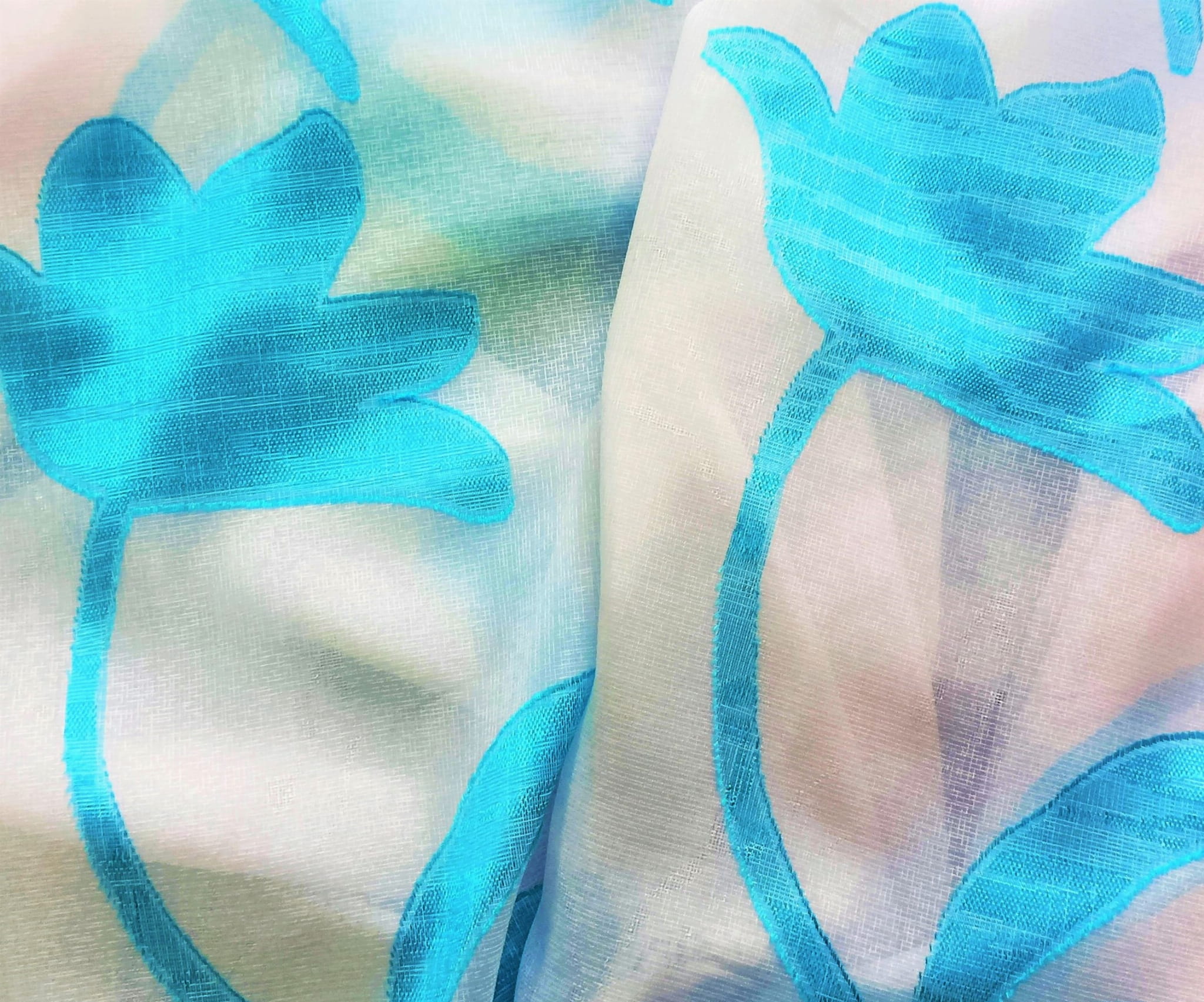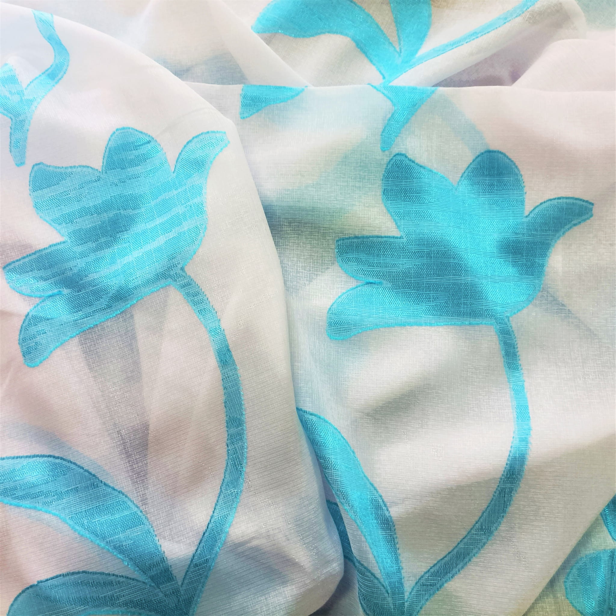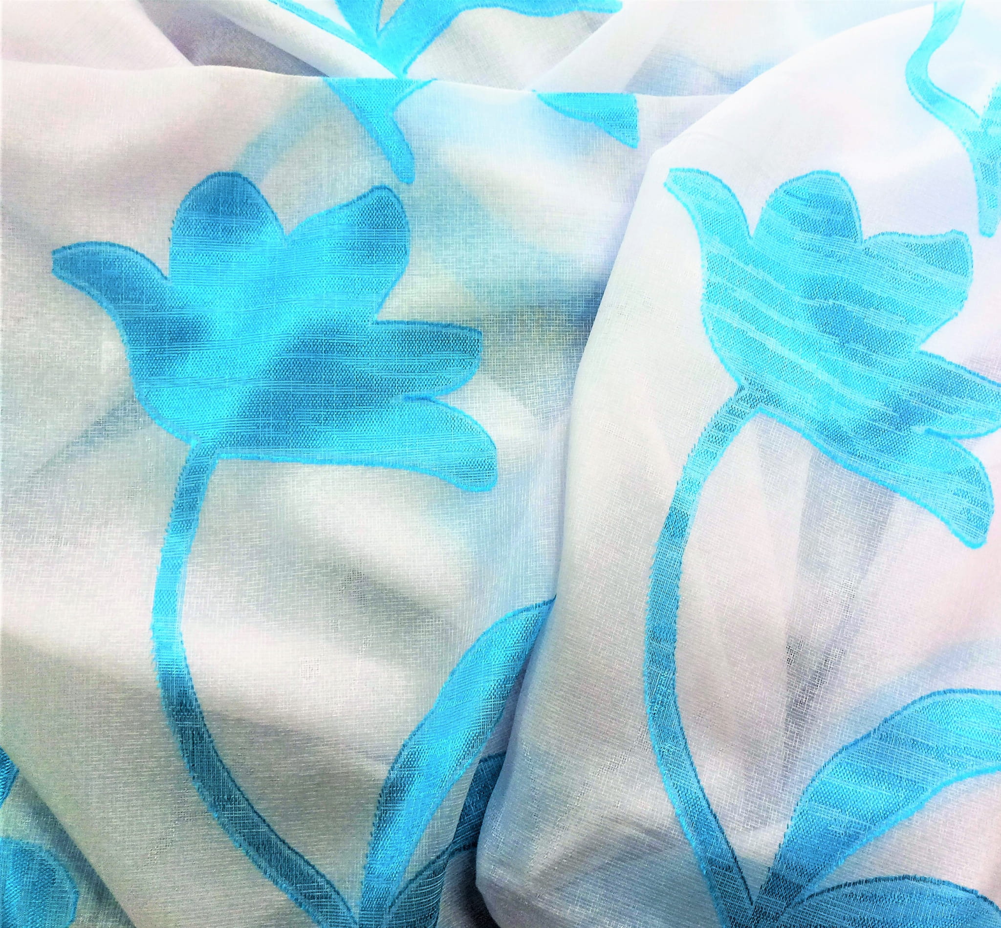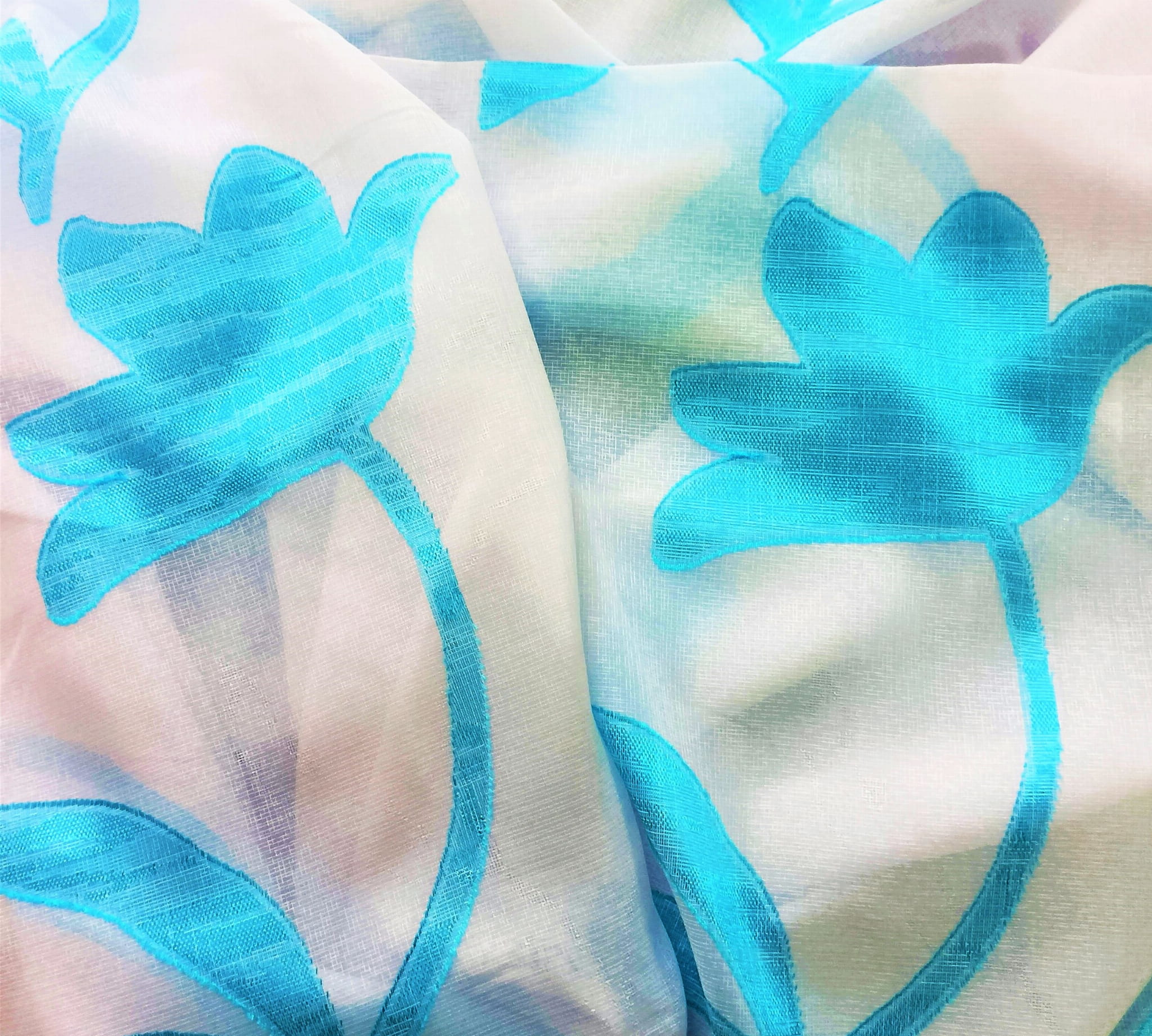 PIĘKNA I NIEZWYKLE WYJĄTKOWA FIRANA WOAL FRANCUSKI TYPU SABLE - Z JĘZYKA FRANCUSKIEGO "PIASEK" - W BIAŁYM KOLORZE Z EFEKTOWNYM WZOREM W POSTACI DUŻYCH, PIONOWO UŁOŻONYCH KWIATÓW W BŁĘKITNEJ BARWIE POŁYSK GLAMOUR PREZENTUJE SIĘ BARDZO ELEGANCKO I DOSKONALE SIĘ UKŁADA. POSIADA SZLACHETNĄ I NIEZWYKLE UNIKALNĄ STRUKTURĘ W POSTACI WIELU GĘSTO UŁOŻONYCH NITEK, PRZYPOMINAJACYCH ZIARENKA PIASKU. IDEALNIE PREZENTUJE SIĘ W KAŻDEJ ARANŻACJI, ZARÓWNO JAKO SAMODZIELNA FIRANA, JAK I DEKORACYJNA, PEŁNA KLASY ZASŁONA. SPEKTAKULARNY DESIGN W BŁĘKITNEJ BARWIE SUBTELNIE ROZŚWIETLA WNĘTRZE, NADAJĄC KLASY I ORYGINALNEGO, FRANCUSKIEGO CHARAKTERU.