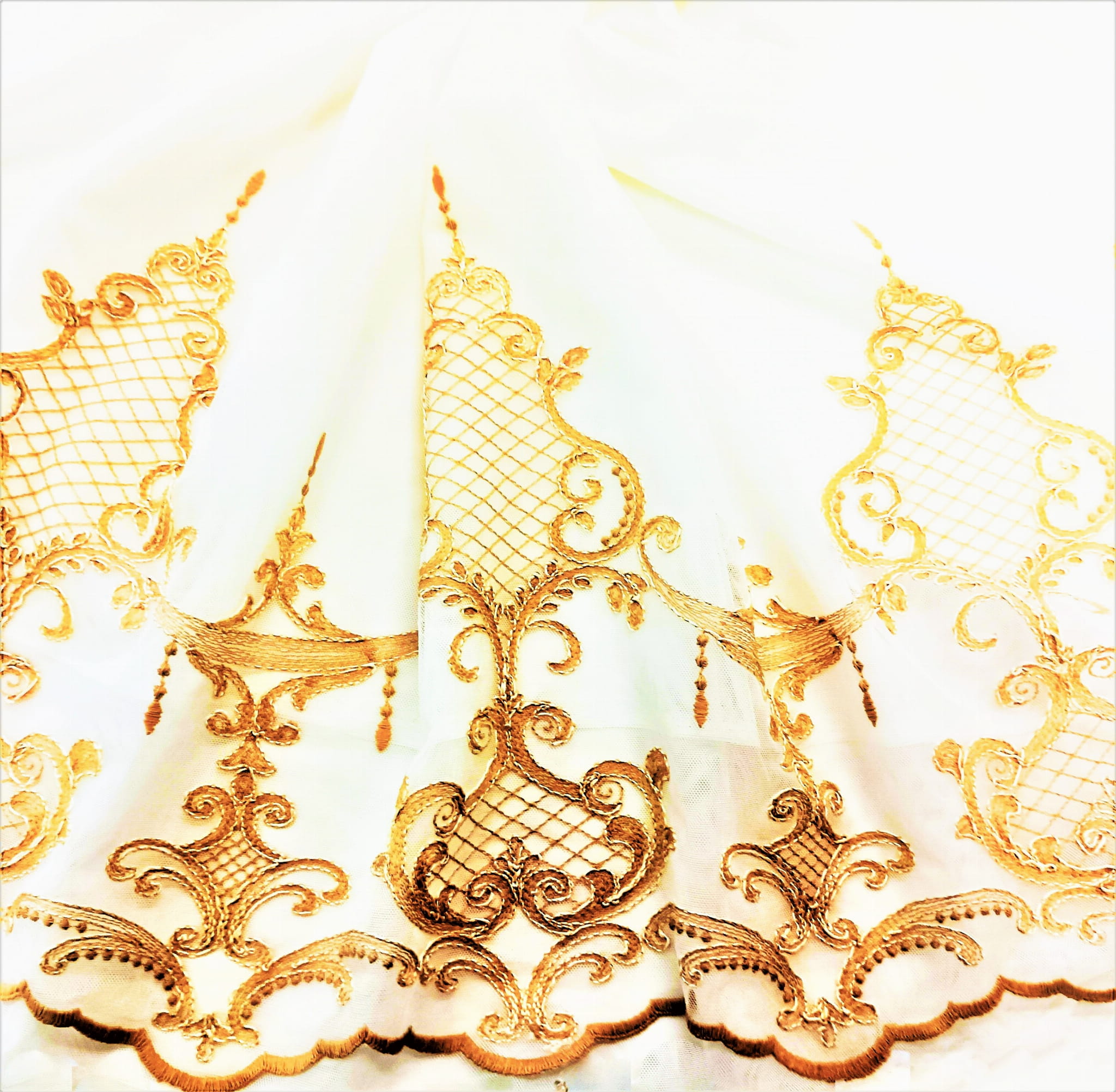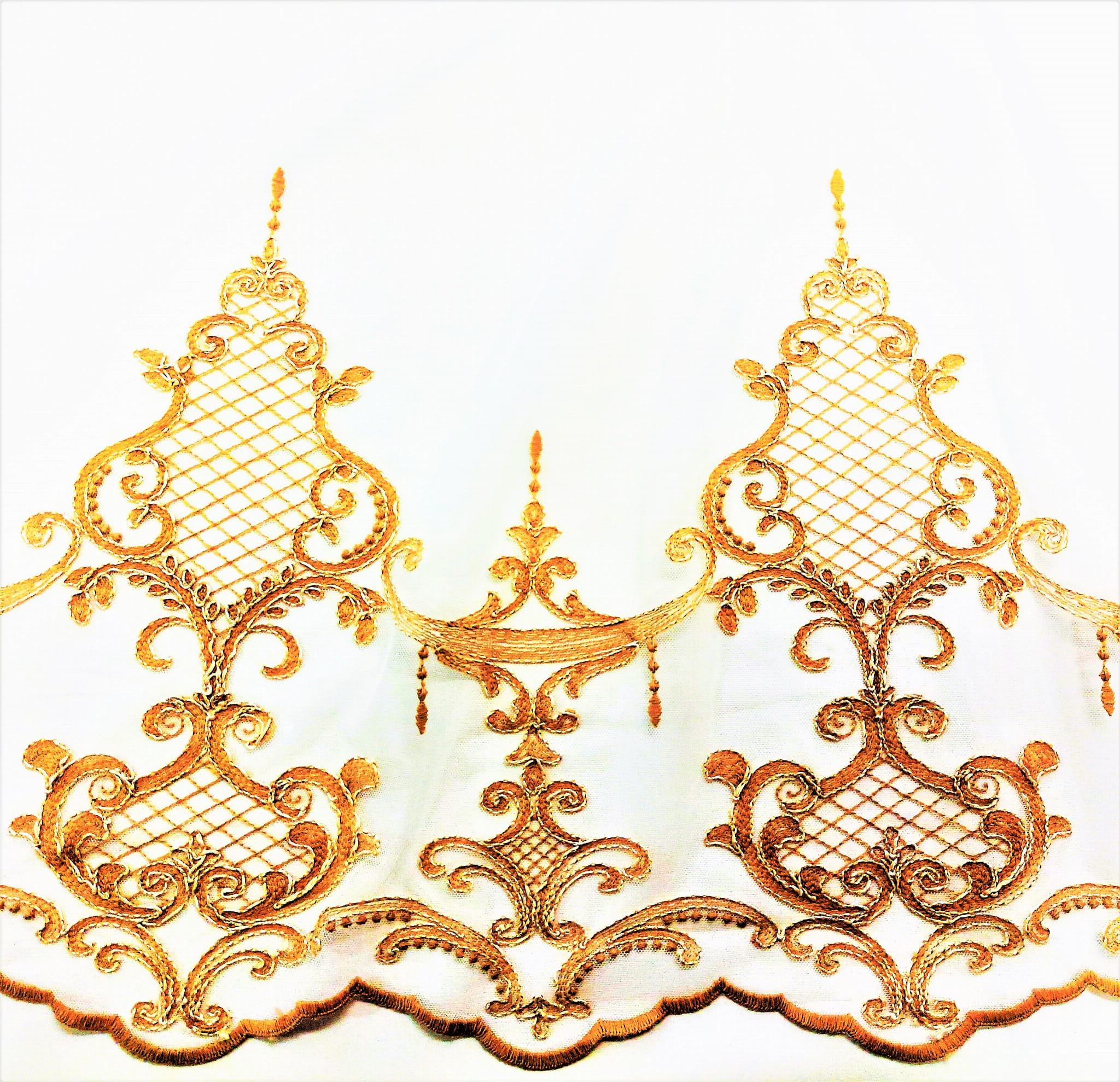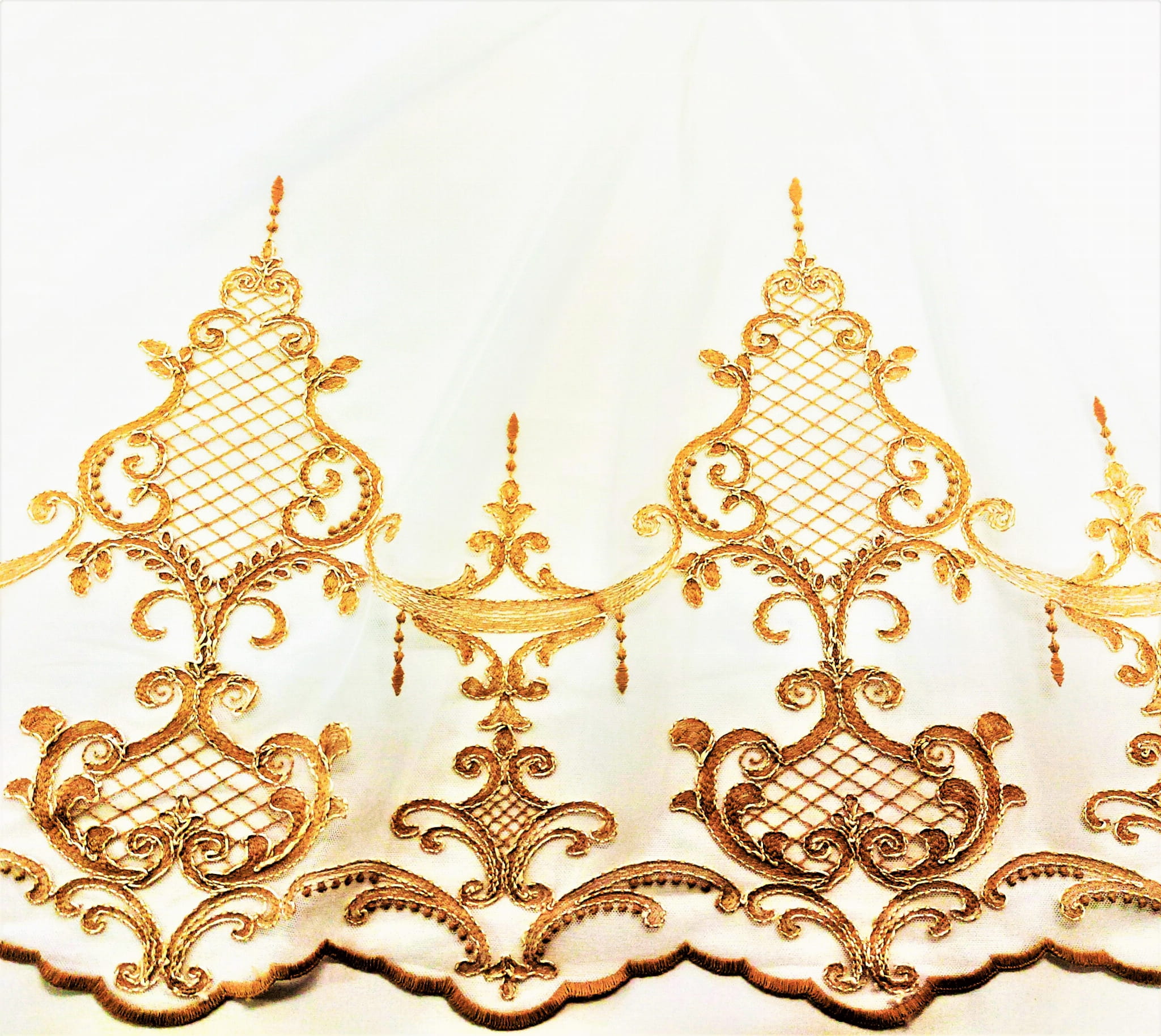 DÓŁ FIRANKI ZOSTAŁ WYKOŃCZONY KUNSZTOWNYM HAFTEM ZE STYLOWYMI ORNAMENTAMI O SZEROKOŚCI 30 CM ORAZ 44 CM.