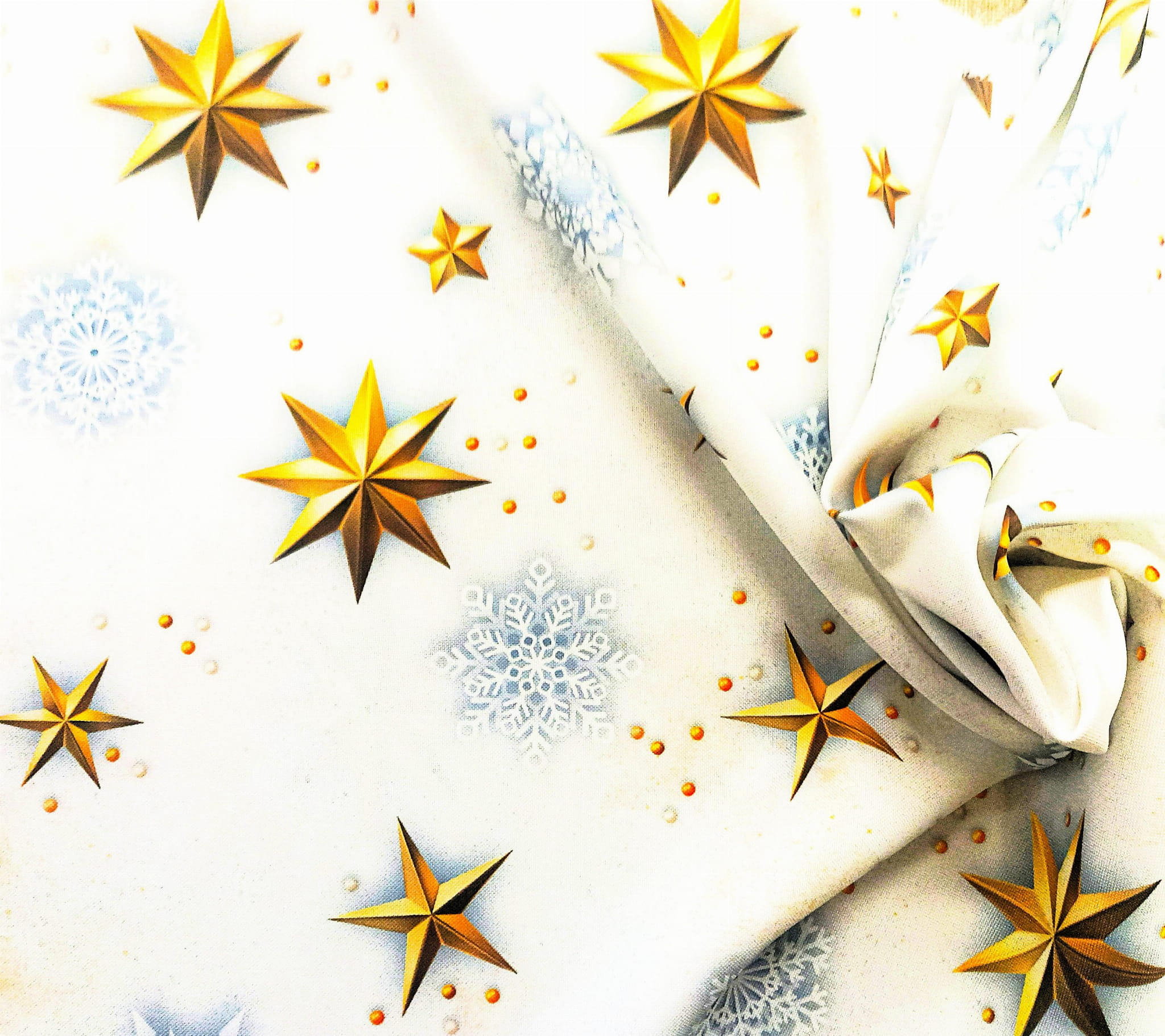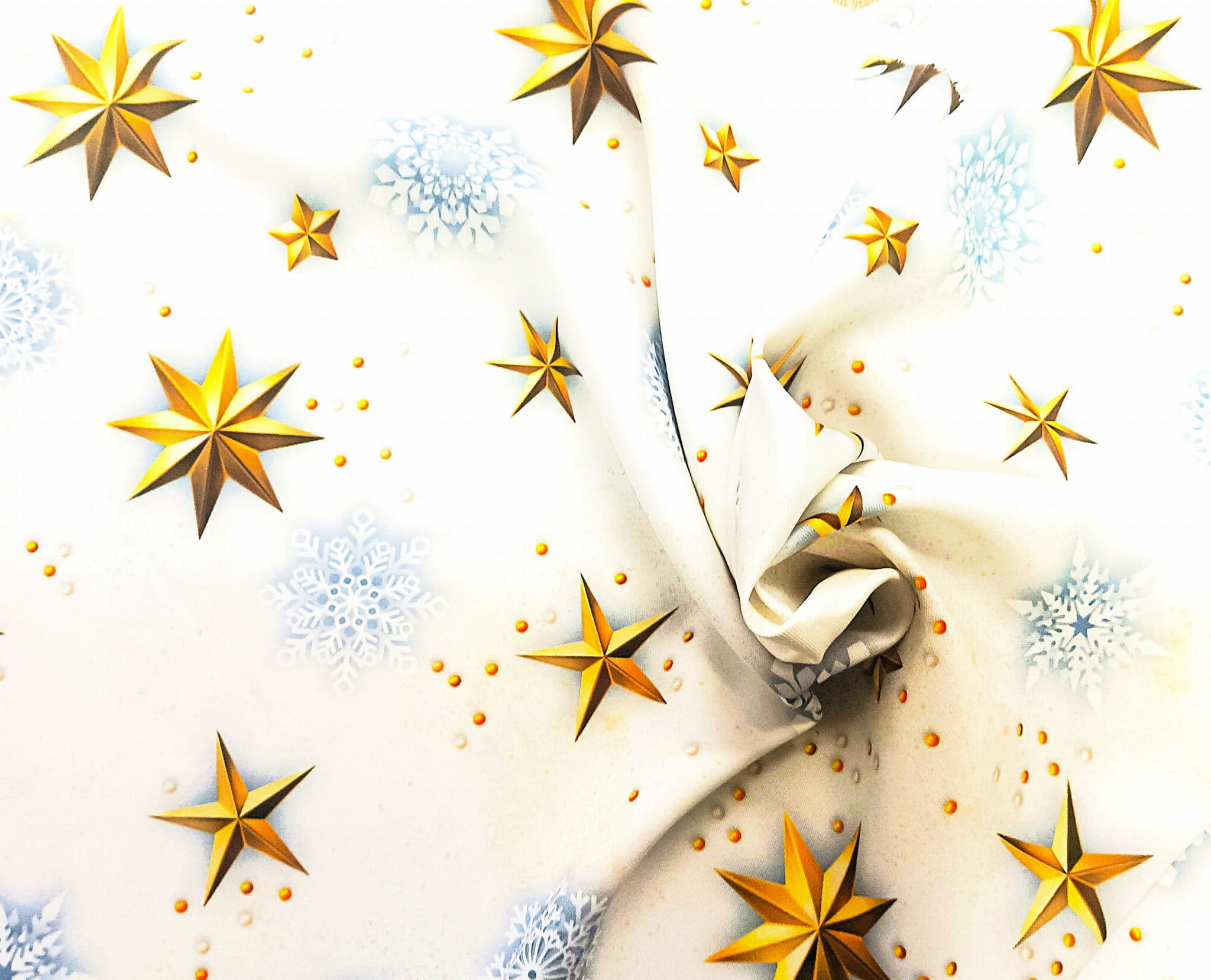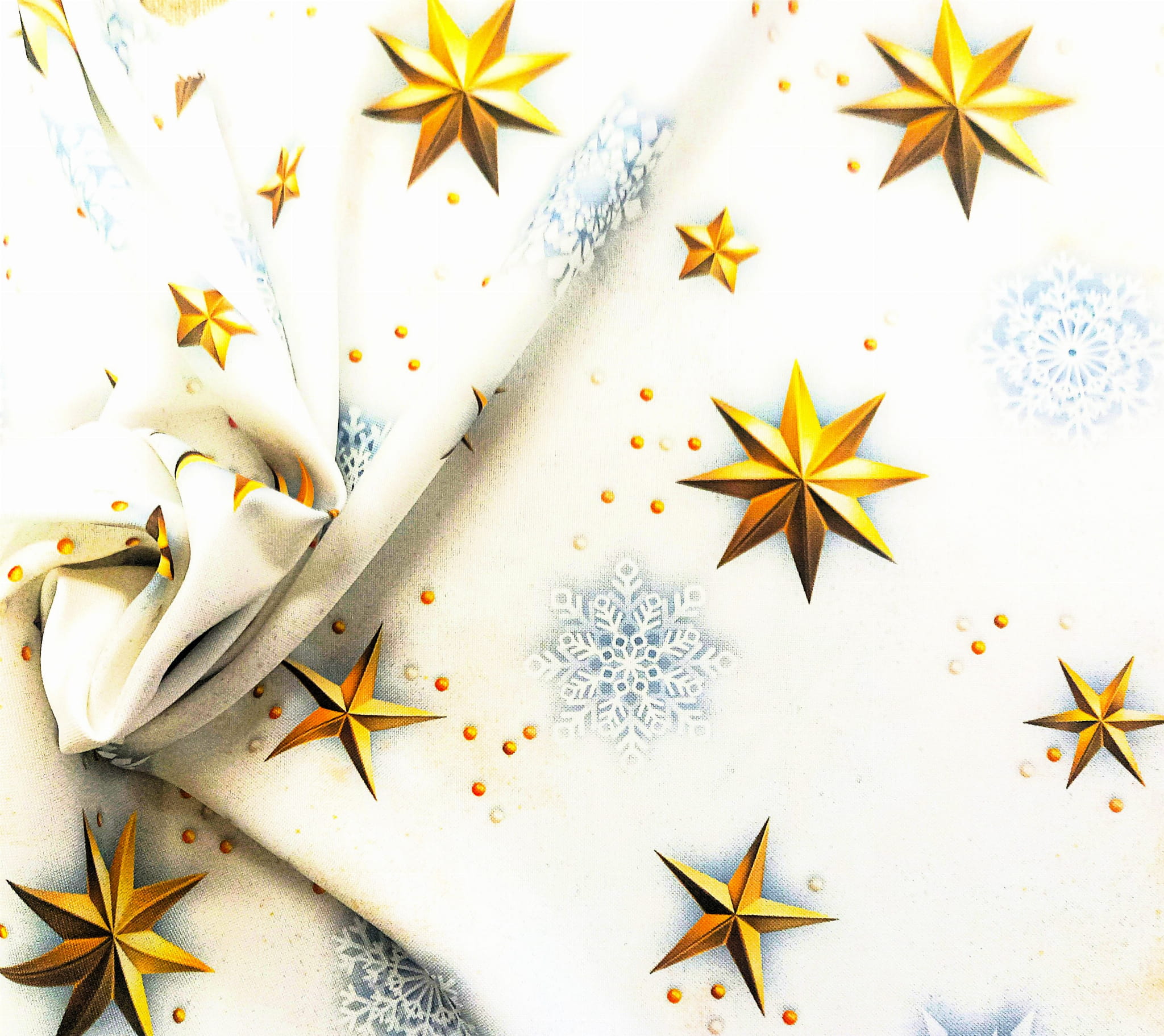 PIĘKNA TKANINA OBRUSOWO - ZASŁONOWA TYPU OXFORD WZÓR ŚWIĄTECZNY "ZŁOTE GWIAZDKI NA BIAŁYM TLE" IDEALNIE SPEŁNIA ROLĘ DEKORACYJNEJ ZASŁONY LUB EFEKTOWNEGO OBRUSU, NADAJĄC WNĘTRZU SPEKTAKULARNEGO CHARAKTERU. MOTYW ŚWIĄTECZNY W POSTACI WYRAZISTEGO PRINTU WPROWADZA WSPANIAŁY KLIMAT ORAZ PEŁEN NIEZWYKŁEGO CIEPŁA, RADOSNY NASTRÓJ. TKANINA PREZENTUJE SIĘ BARDZO ELEGANCKO, DOSKONALE SIĘ UKŁADA I PODKREŚLA ORYGINALNY STYL ARANŻACJI.