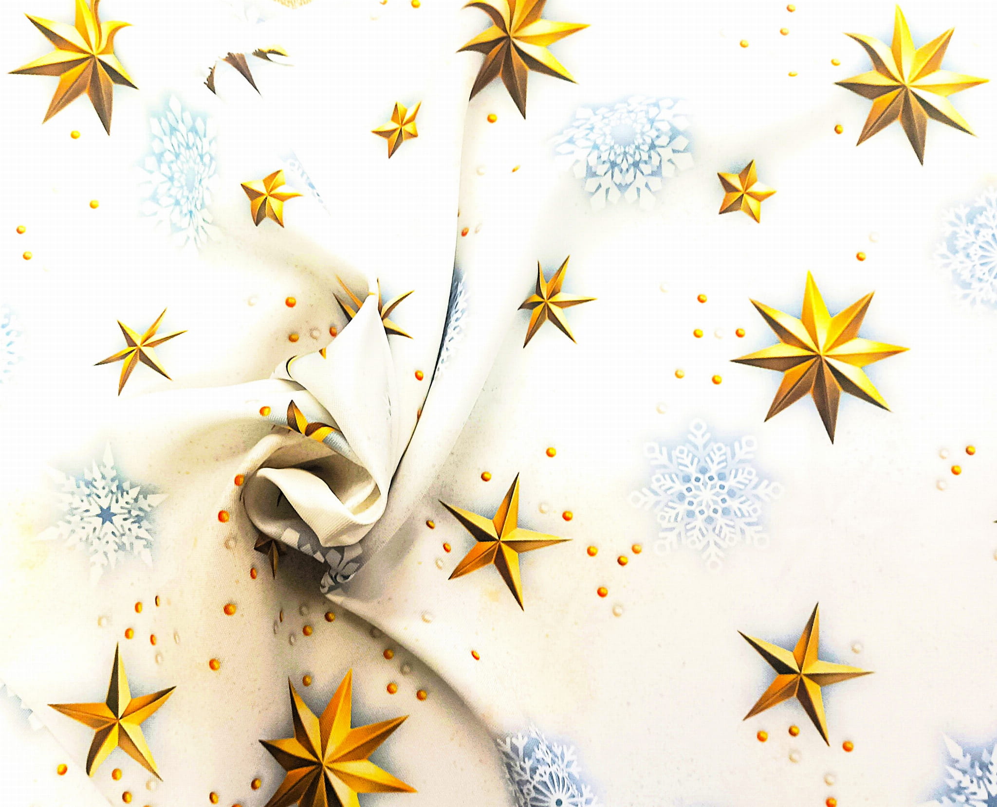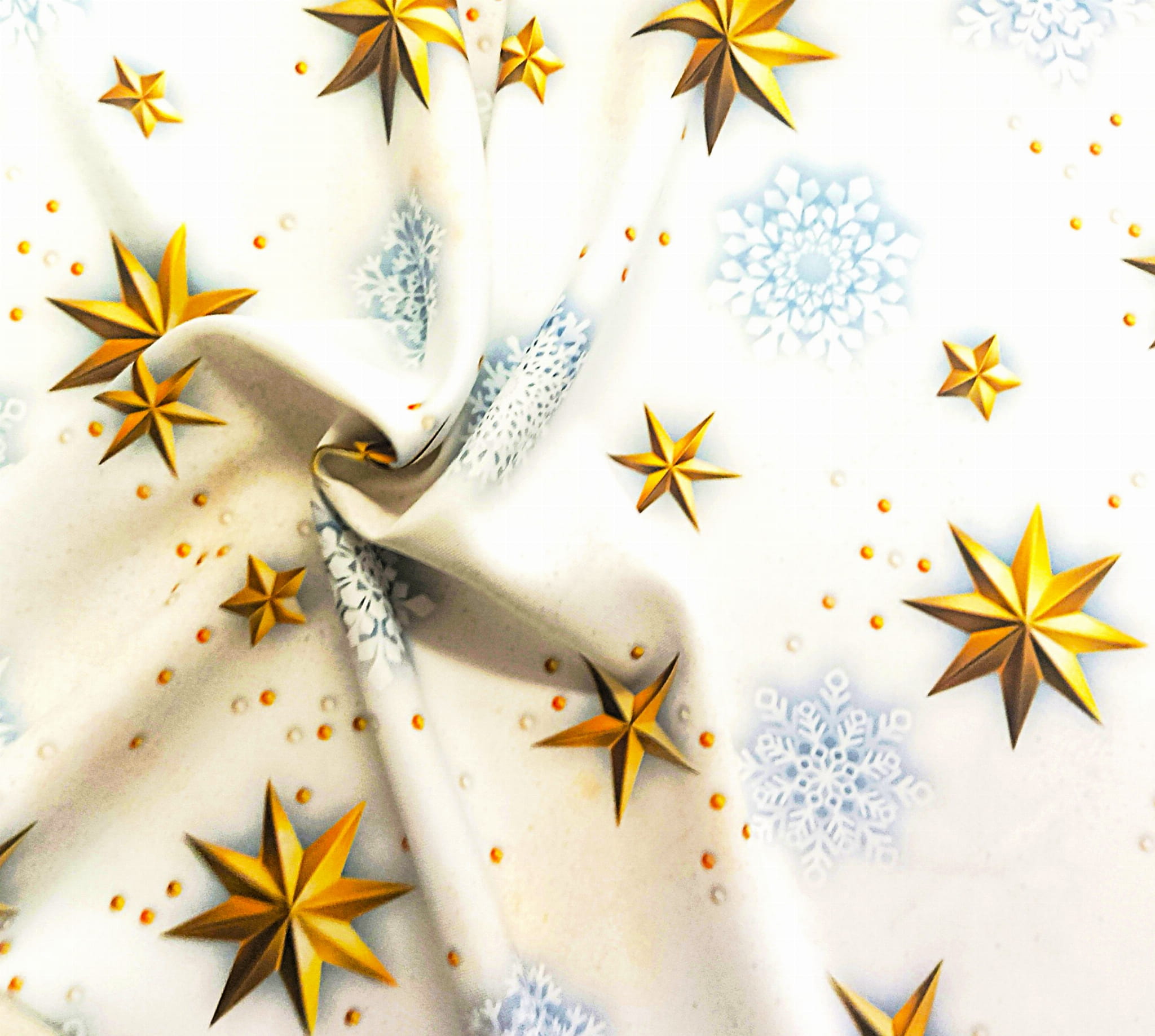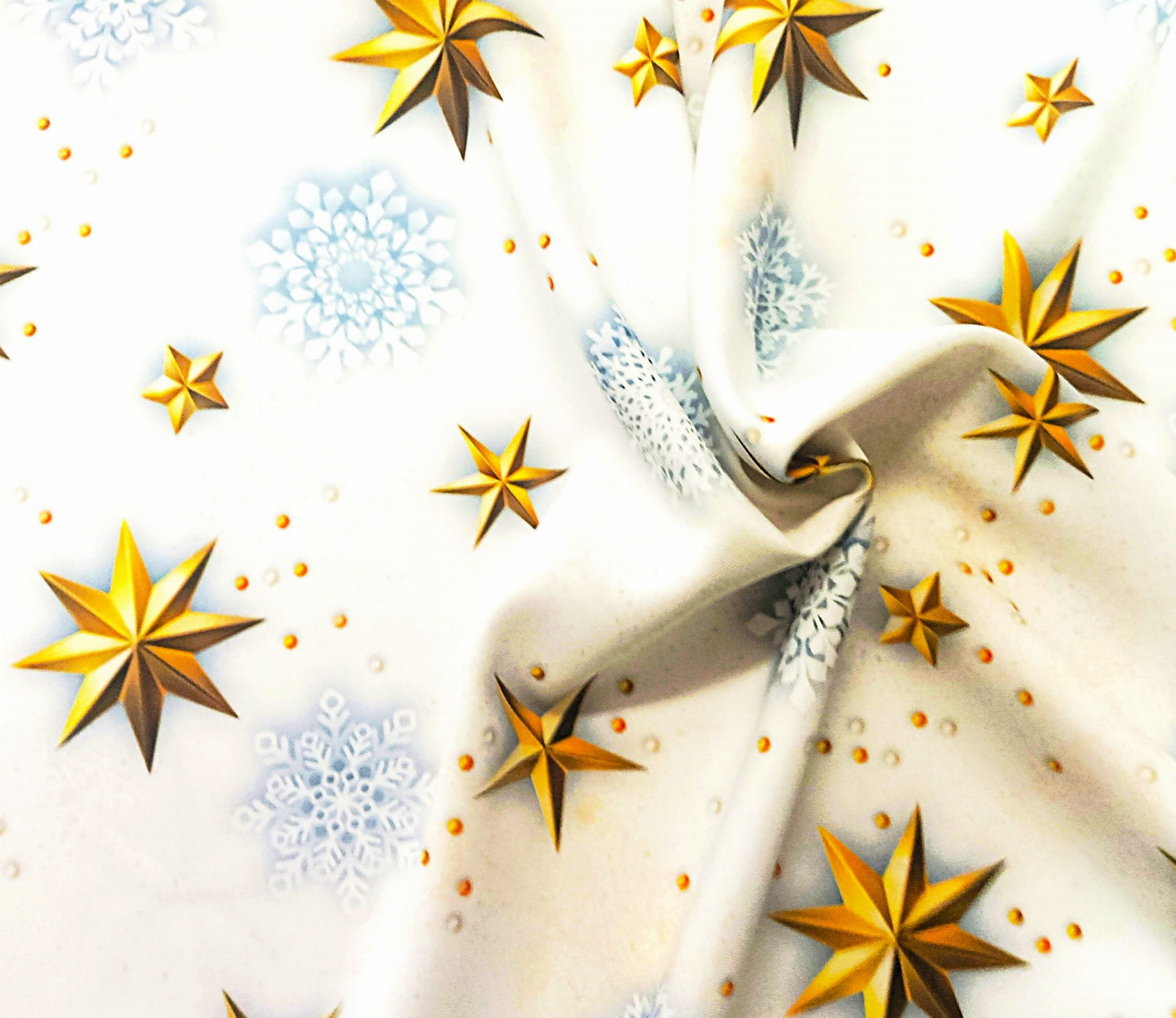 PIĘKNA TKANINA OBRUSOWO - ZASŁONOWA TYPU OXFORD WZÓR ŚWIĄTECZNY "ZŁOTE GWIAZDKI NA BIAŁYM TLE" IDEALNIE SPEŁNIA ROLĘ DEKORACYJNEJ ZASŁONY LUB EFEKTOWNEGO OBRUSU, NADAJĄC WNĘTRZU SPEKTAKULARNEGO CHARAKTERU. MOTYW ŚWIĄTECZNY W POSTACI WYRAZISTEGO PRINTU WPROWADZA WSPANIAŁY KLIMAT ORAZ PEŁEN NIEZWYKŁEGO CIEPŁA, RADOSNY NASTRÓJ. TKANINA PREZENTUJE SIĘ BARDZO ELEGANCKO, DOSKONALE SIĘ UKŁADA I PODKREŚLA ORYGINALNY STYL ARANŻACJI.