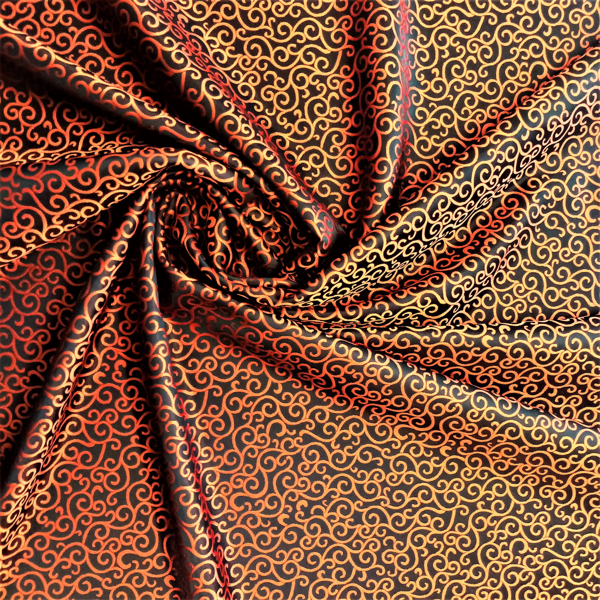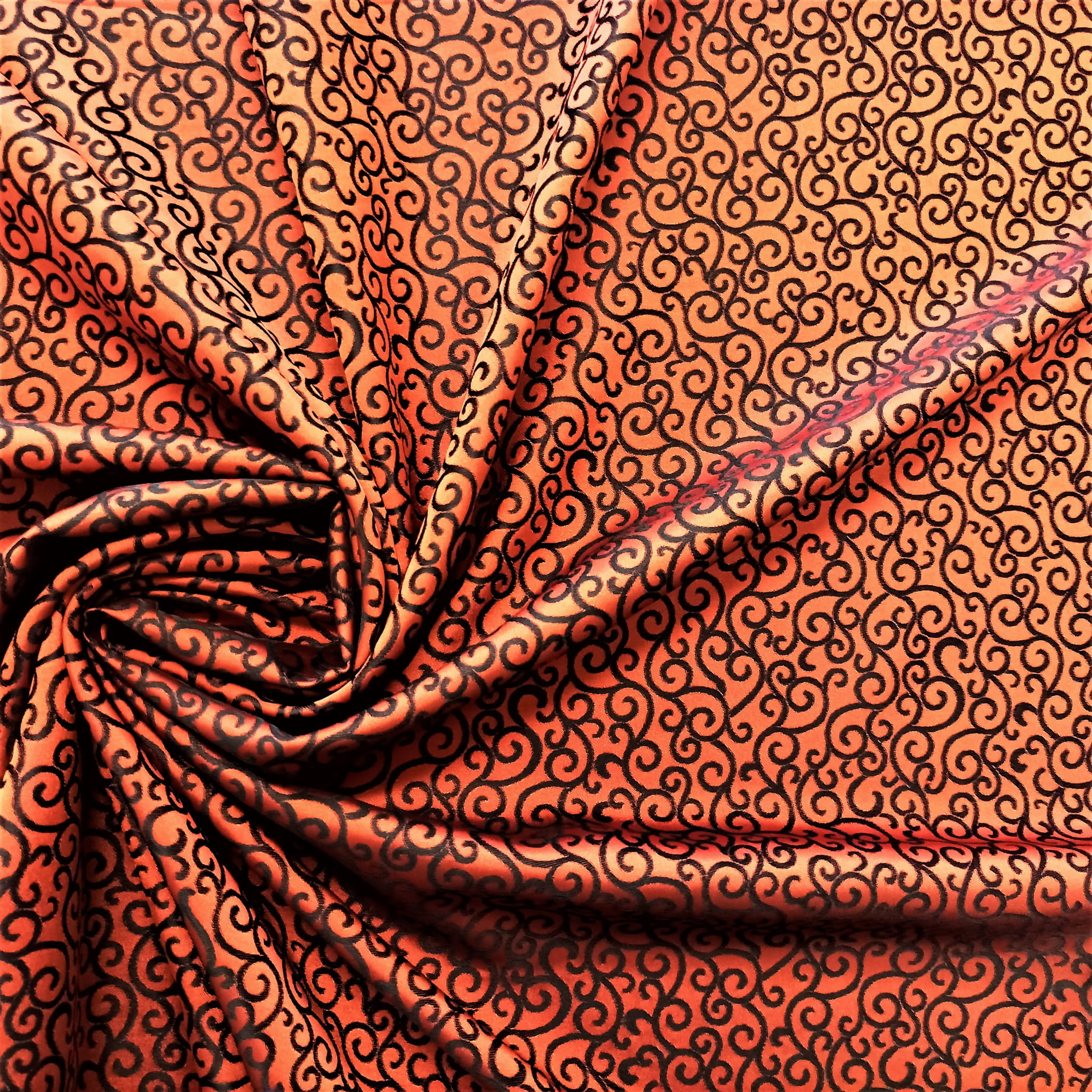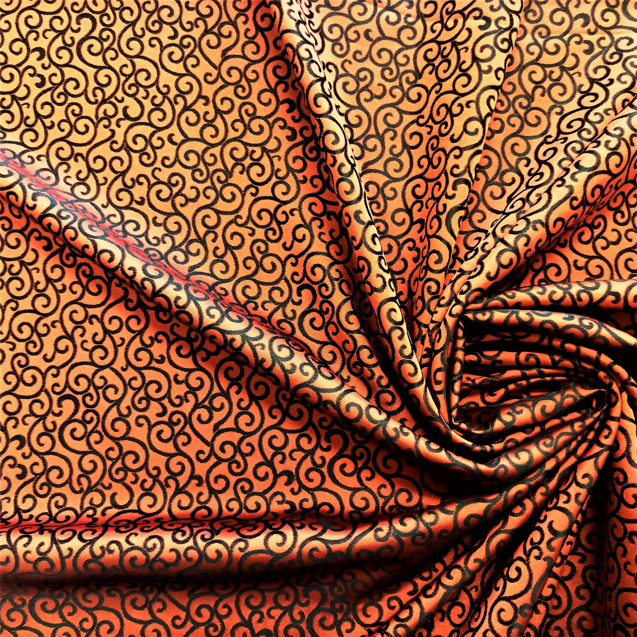 TKANINA JEST DWUSTRONNA - JEDNA STRONA TO PRINT O NASYCONEJ BARWIE POMARAŃCZOWEJ NA CZARNYM TLE, NATOMIAST DRUGA STRONA TO ZDECYDOWANA ODWROTNOŚĆ CZYLI CZARNY PRINT NA INTENSYWNIE POMARAŃCZOWEJ POWIERZCHNI.