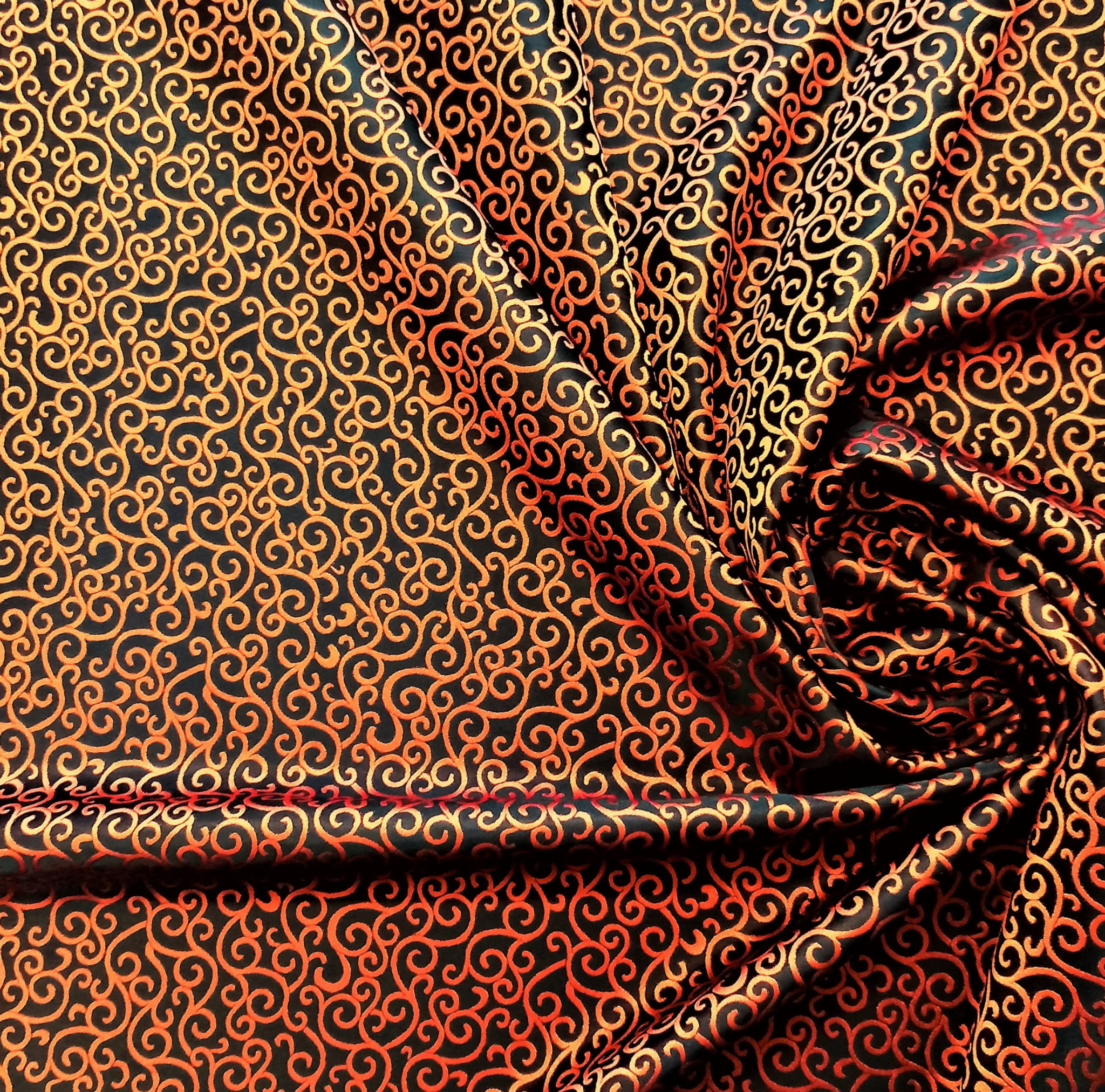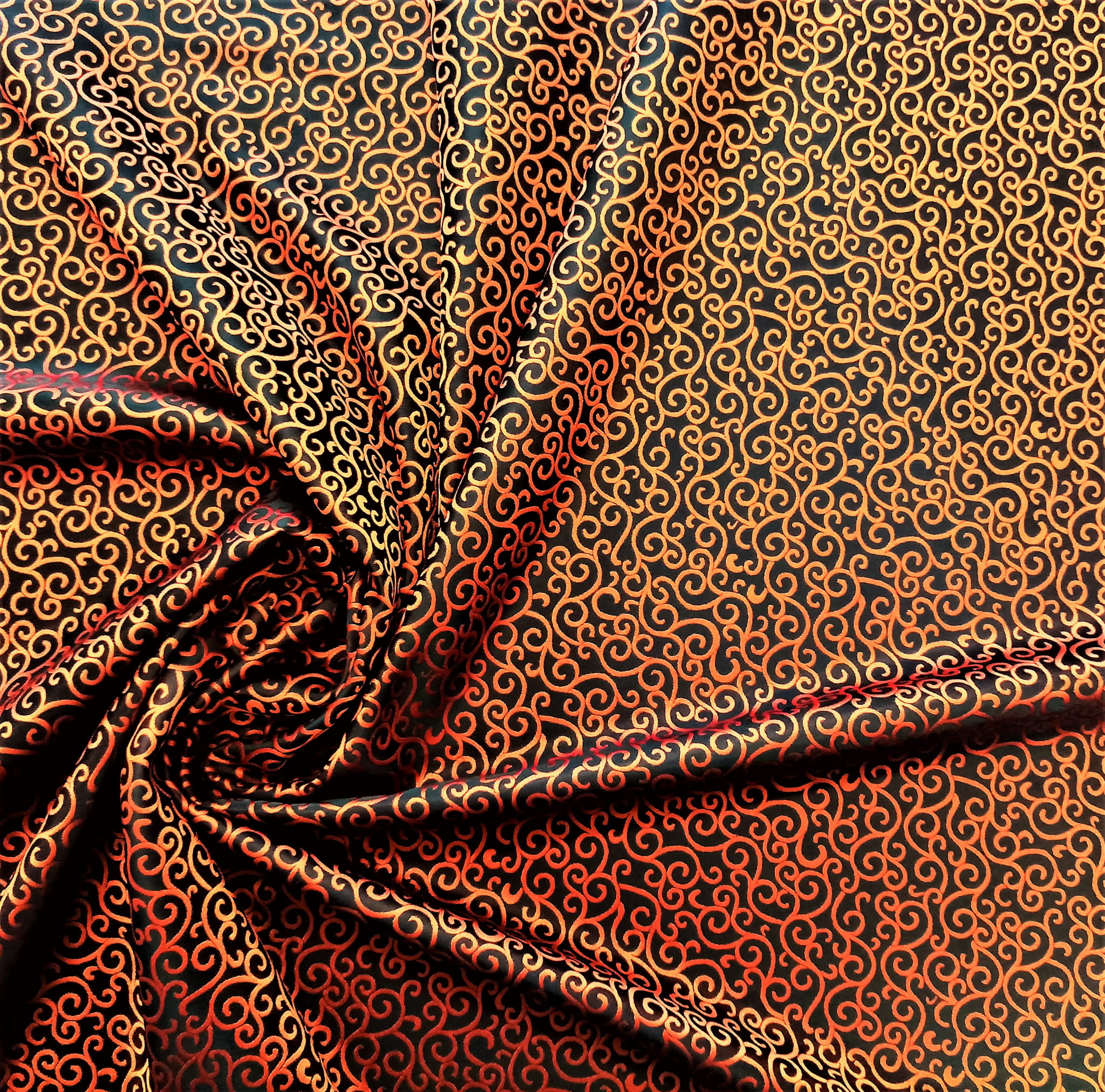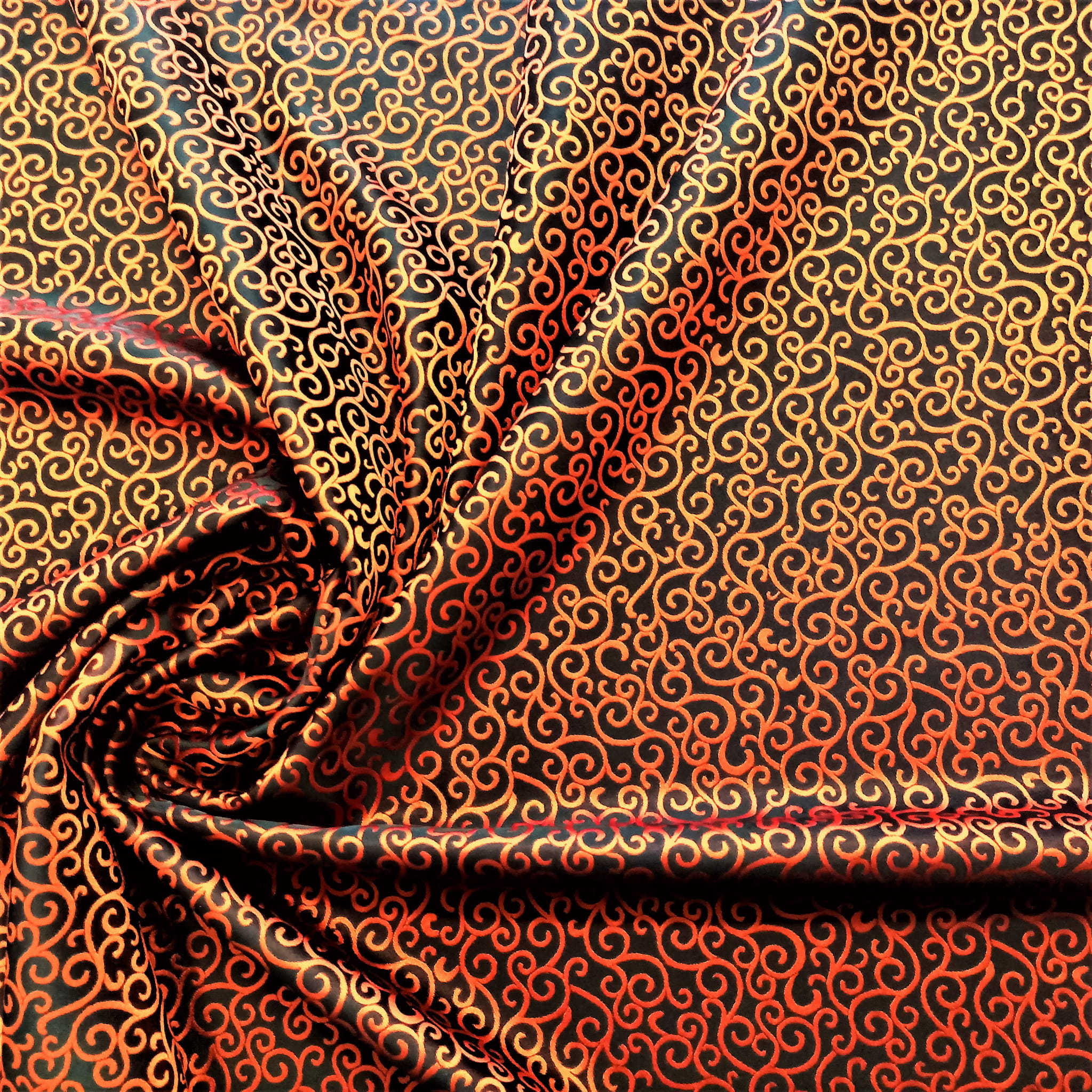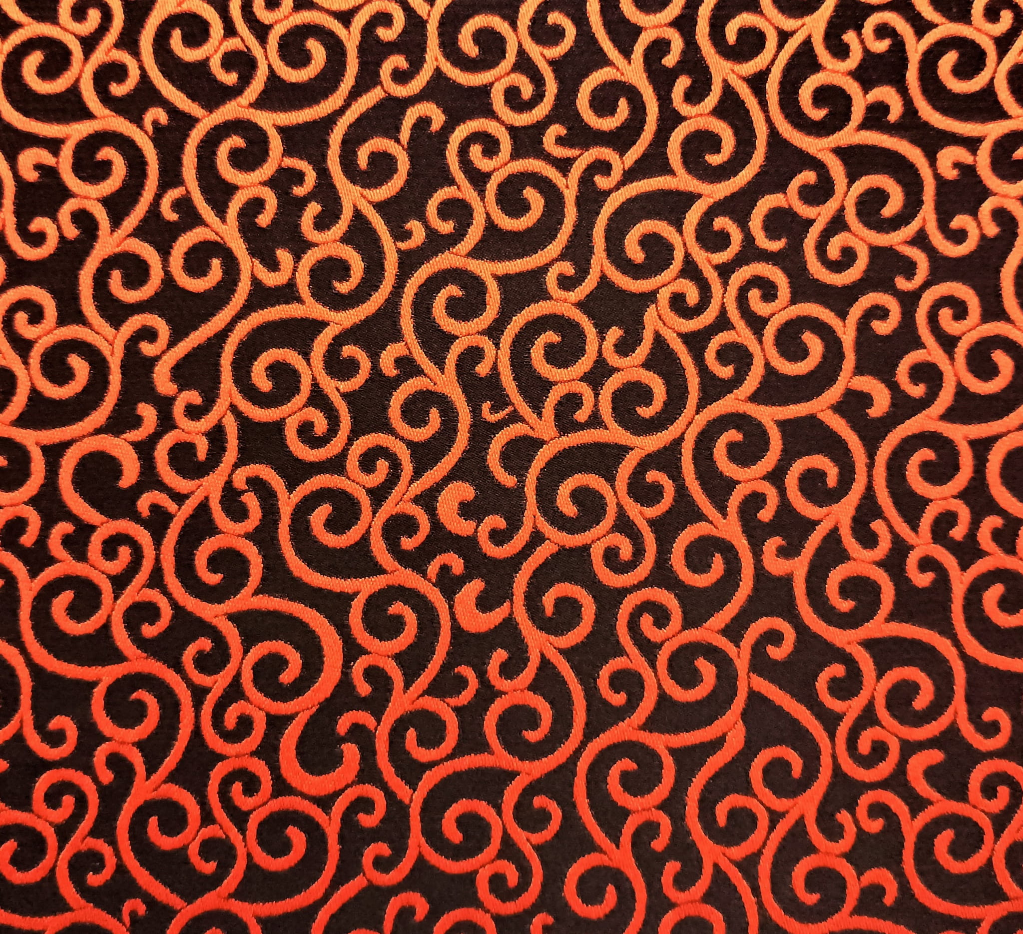 TKANINA JEST DWUSTRONNA - JEDNA STRONA TO PRINT O NASYCONEJ BARWIE POMARAŃCZOWEJ NA CZARNYM TLE, NATOMIAST DRUGA STRONA TO ZDECYDOWANA ODWROTNOŚĆ CZYLI CZARNY PRINT NA INTENSYWNIE POMARAŃCZOWEJ POWIERZCHNI.