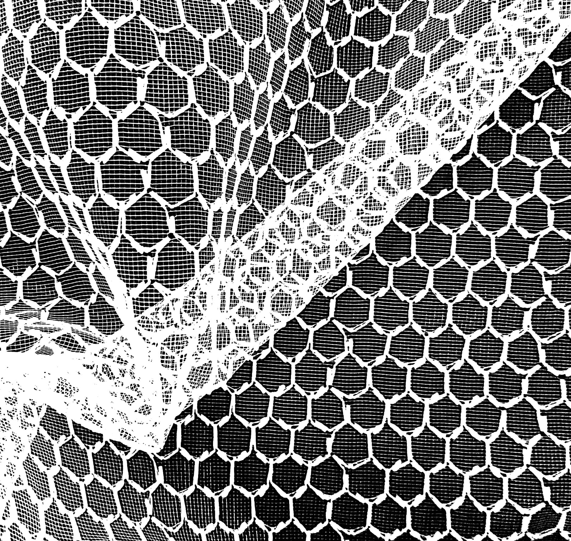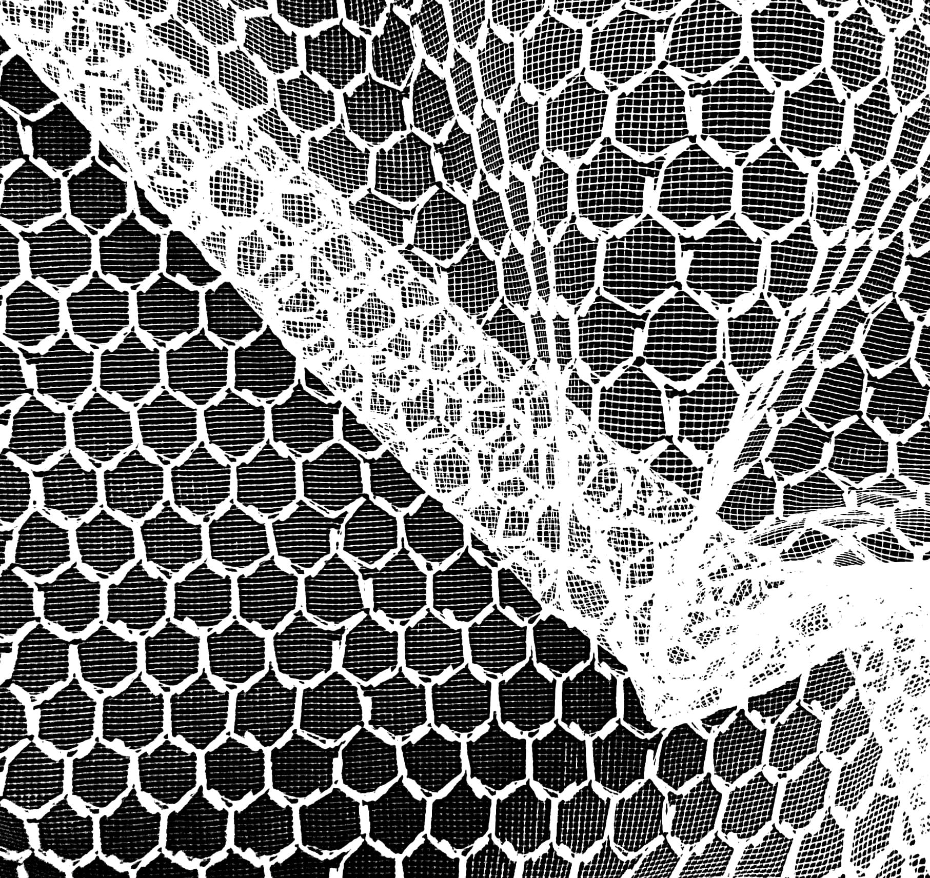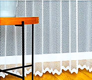 WZÓR W POSTACI OCZEK TYPU PLASTER MIODU ROZPOCZYNA SIĘ NA WYSOKOŚCI 50 CM OD GÓRY FIRANKI I ROZŁOŻONY JEST RÓWNOMIERNIE NA WYSOKOŚCI 230 CM