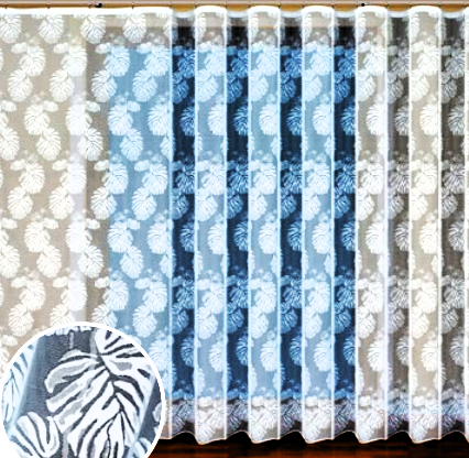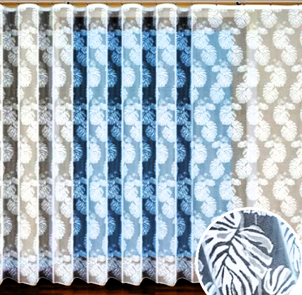 STYLOWA FIRANA ŻAKARD W KOLORZE BIAŁYM Z PIĘKNYM WZOREM FLORYSTYCZNYM DUŻE LIŚCIE MONSTERY WYSOKOŚĆ 160 CM 250 CM PRODUCENT HAFT KALISZ
