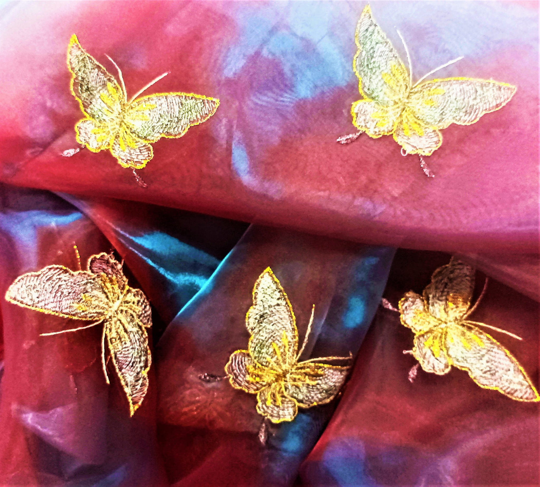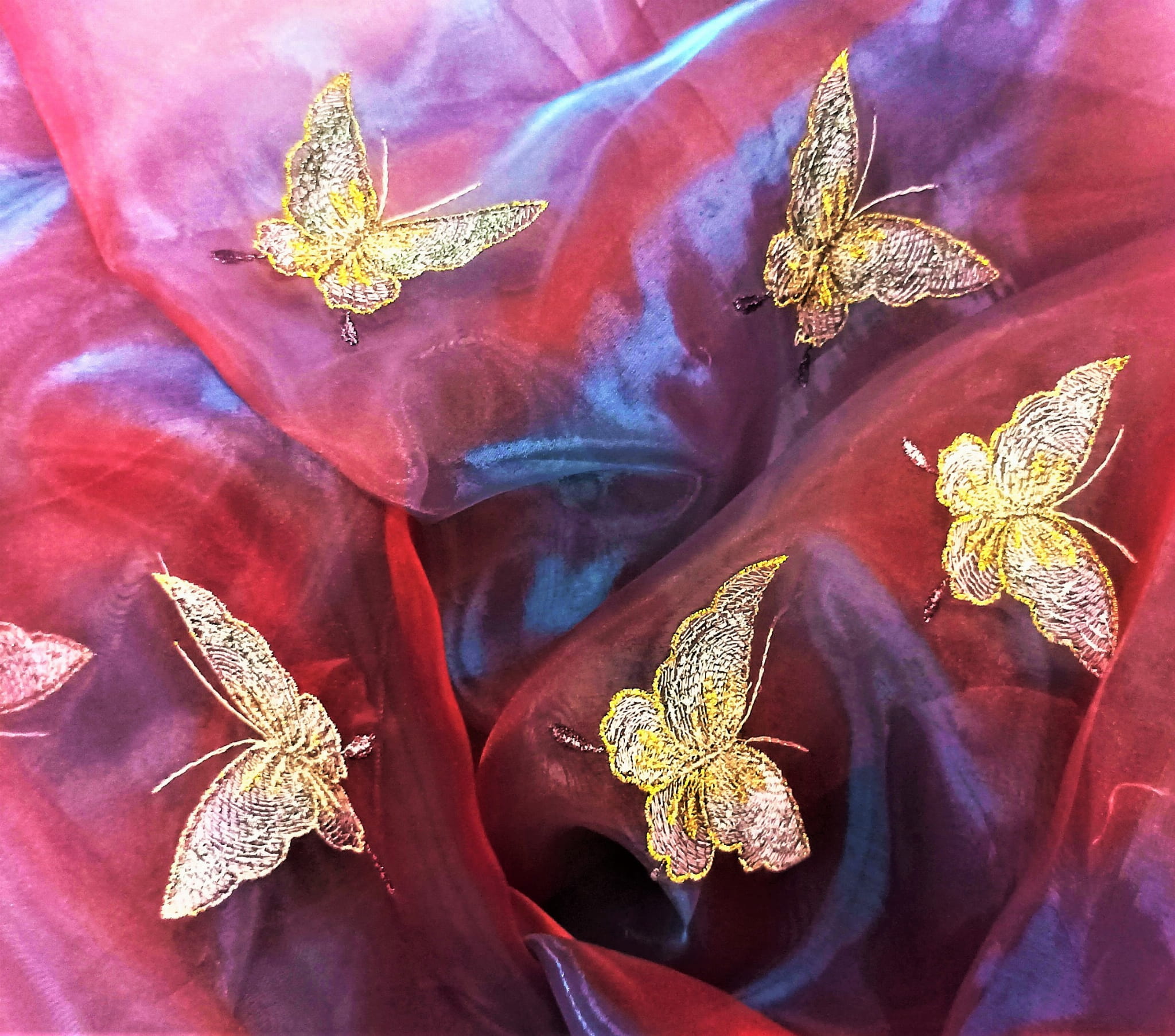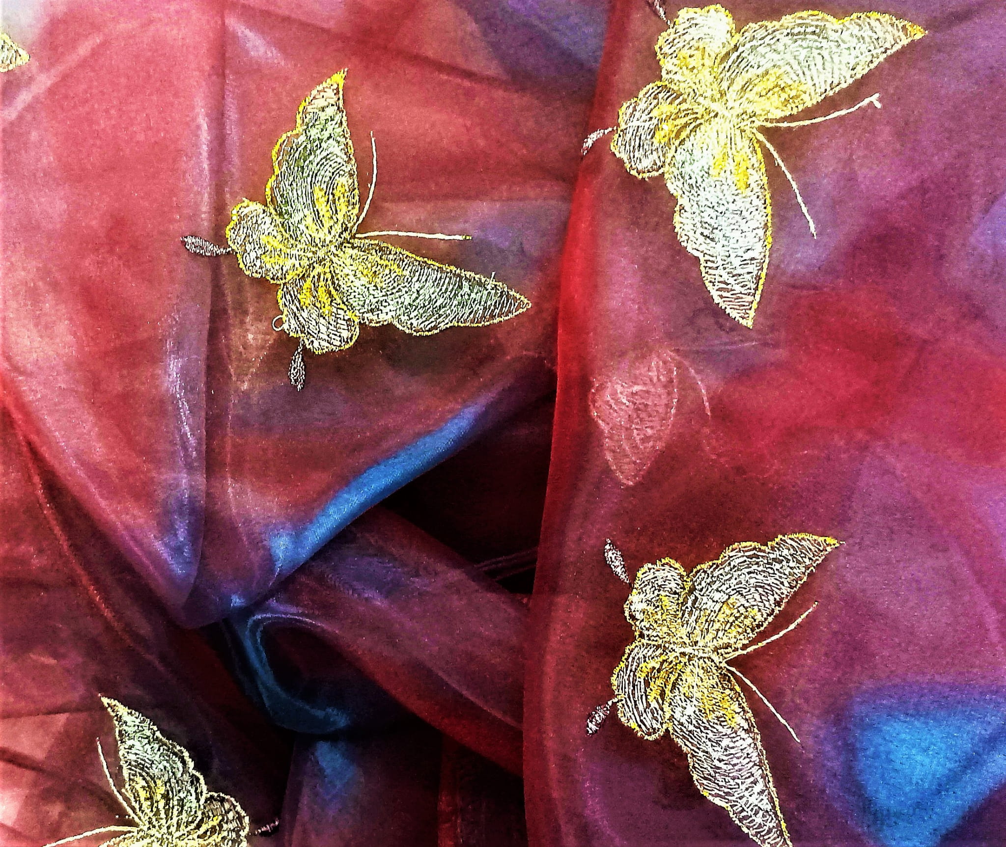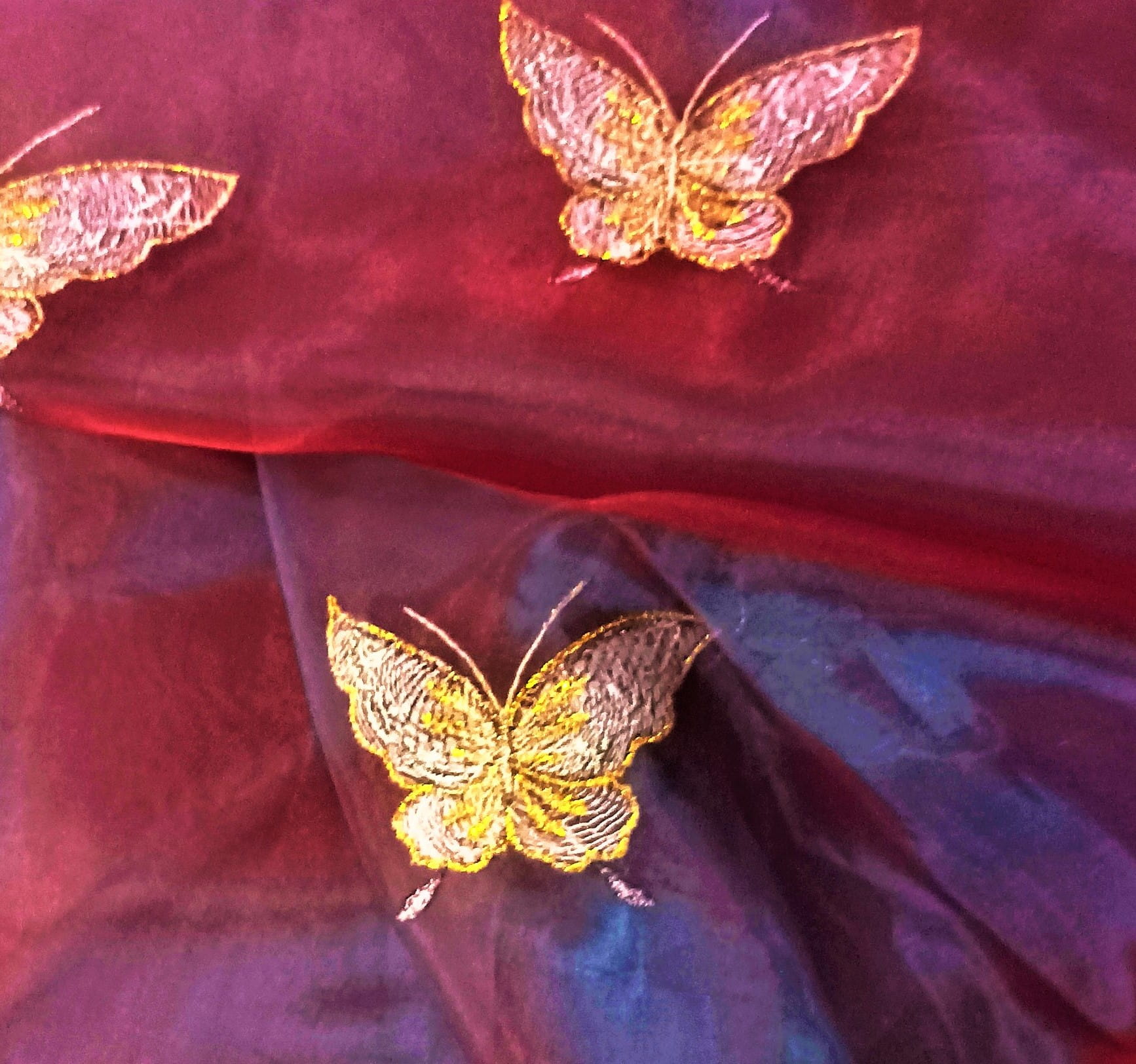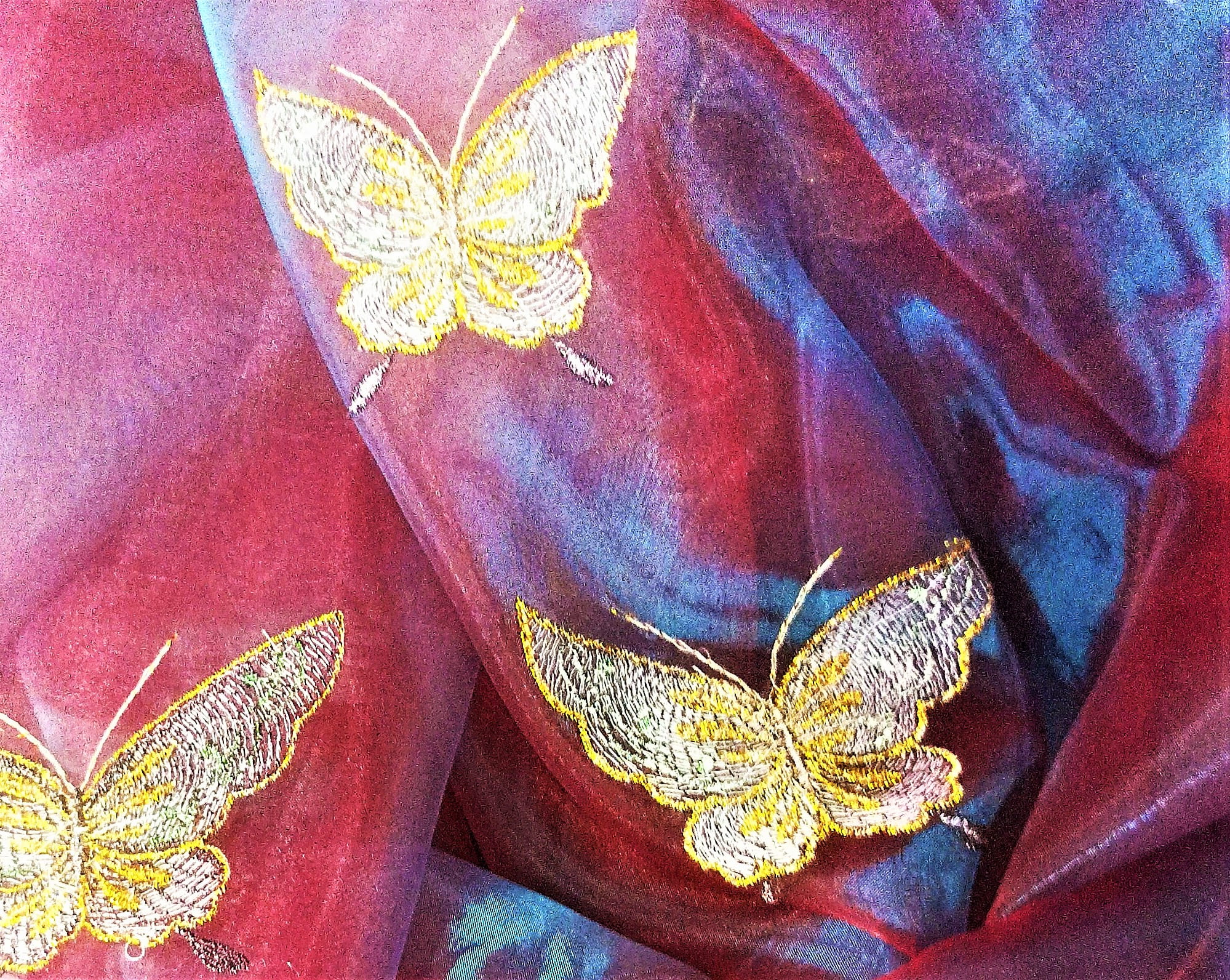 STYLOWA ORGANTYNA PREMIUM W DWUTONOWYCH ODCIENIACH BURGUNDU I FIOLETU POŁYSK GLAMOUR Z PIĘKNYM HAFTEM W POSTACI DUŻYCH MOTYLI W ZŁOTO-SREBRNEJ TONACJI TO NIEZWYKLE ORYGINALNA, PEŁNA BLASKU DEKORACJA OKNA. SUBTELNIE FILTRUJE PROMIENIE SŁONECZNE, JEST LEJĄCA, MIĘKA I BARDZO PLASTYCZNA. DOSKONAŁE POŁĄCZENIE KOLORYSTYCZNE IDEALNIE HARMONIZUJE Z EFEKTOWNIE POŁYSKUJĄCYM, HAFTOWANYM PRINTEM, PREZENTUJĄC SIĘ SPEKTAKULARNIE JAKO UNIKALNA FIRANKA LUB OZDOBNA ZASŁONA W KLIMACIE BOHO, RETRO, VINTAGE, EKLEKTYCZNYM, ROMANTYCZNYM, ETNO ORAZ GLAMOUR