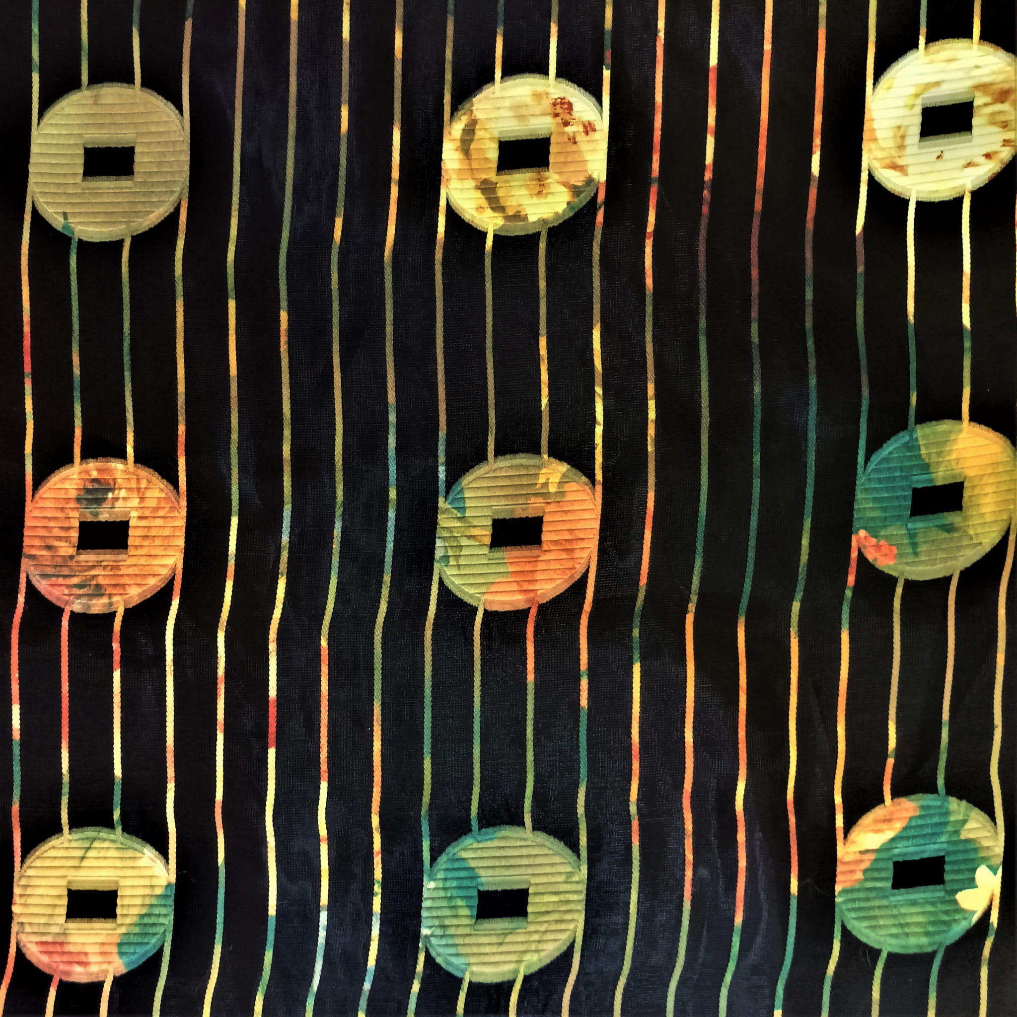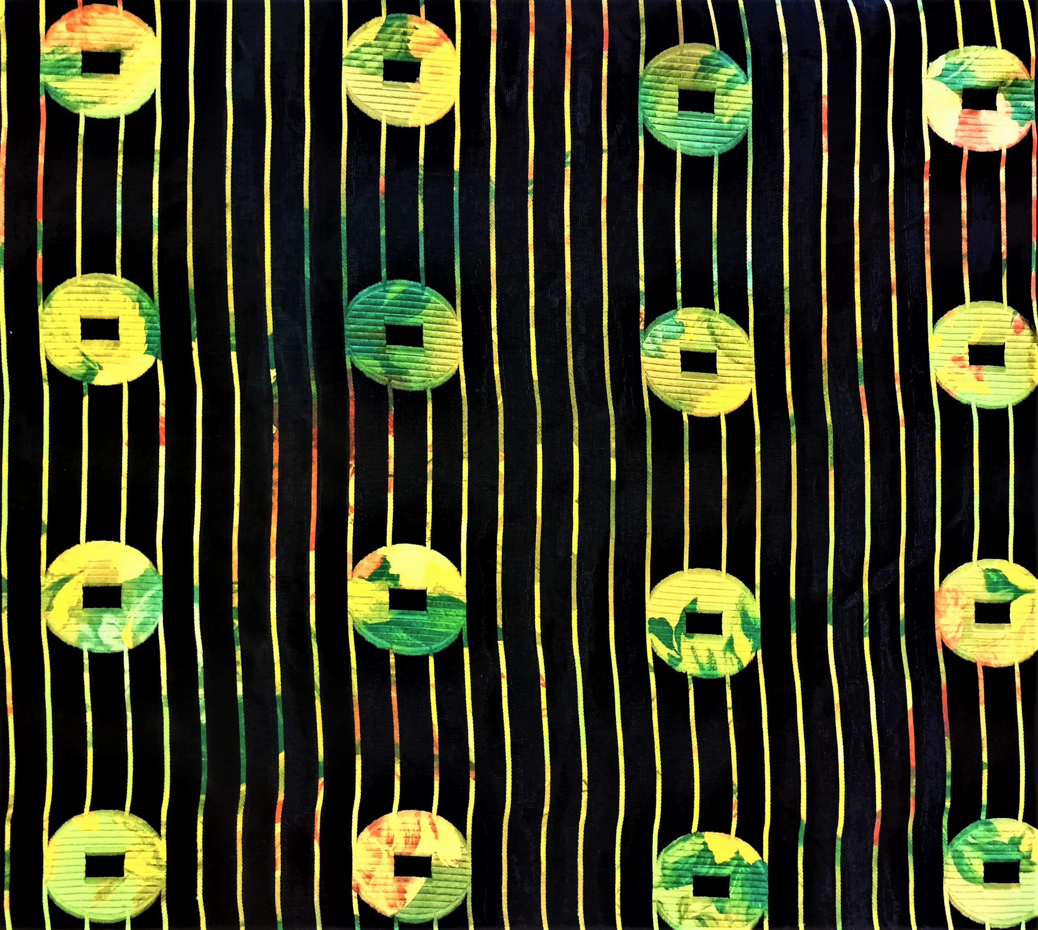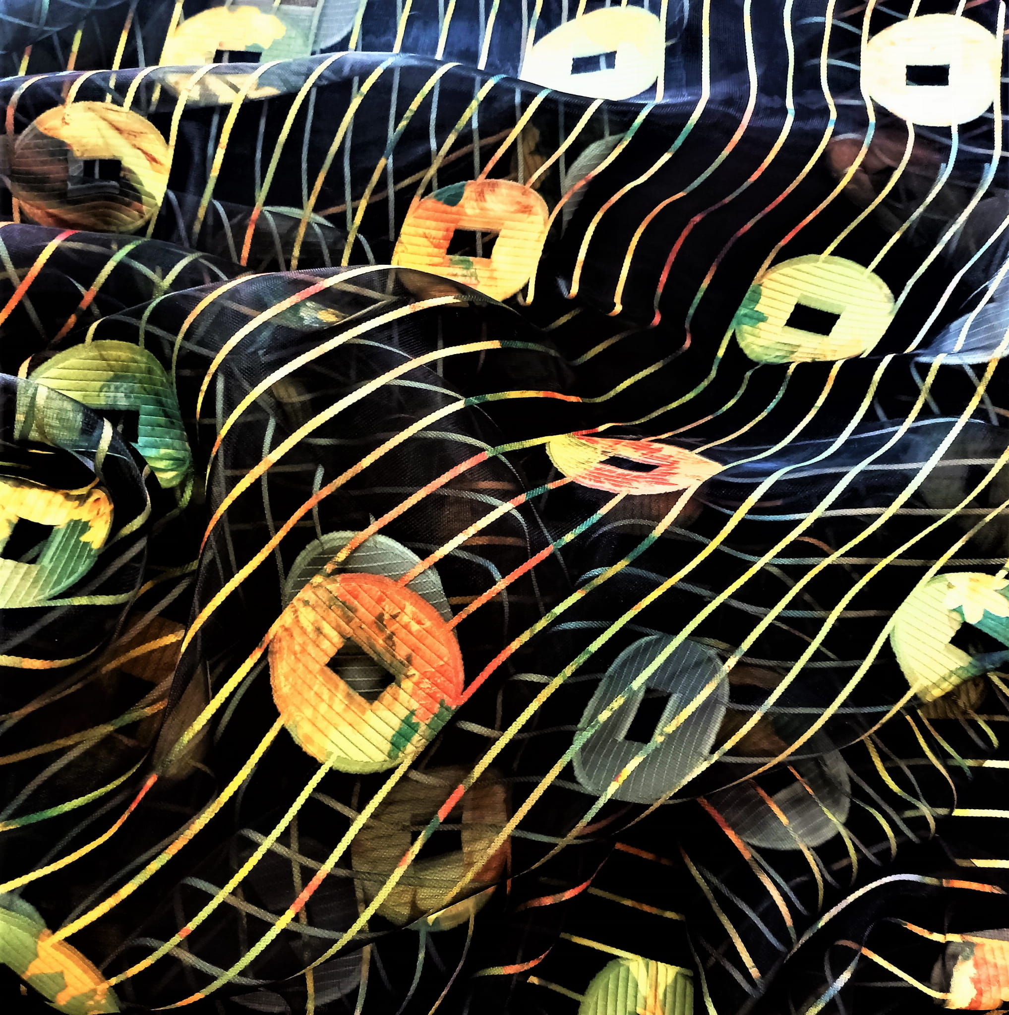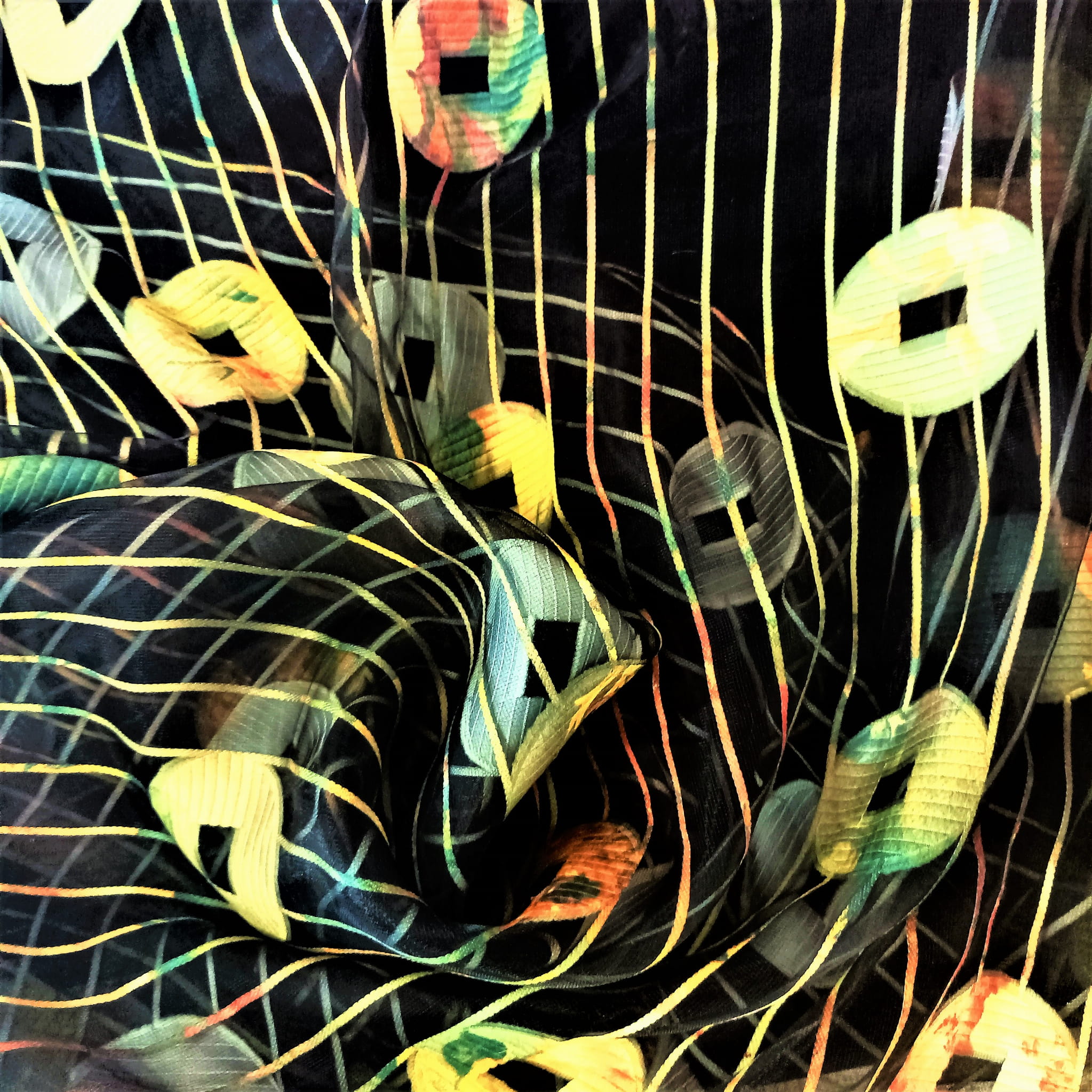 STYLOWA ORGANTYNA Z PIĘKNYM HAFTEM W POSTACI PIONOWO UŁOŻONYCH CIENKICH PASECZKÓW Z ORNAMENTAMI W KSZTAŁCIE FANTAZYJNYCH KÓŁEK W ŁĄCZONEJ BARWIE ŻÓŁTEJ, ZIELONEJ I POMARAŃCZOWEJ NA CZARNYM TLE TO EFEKTOWNA ARANŻACJA W NOWOCZESNYM KLIMACIE. IDEALNIE SPRAWDZI SIĘ JAKO DEKORACYJNA FIRANA LUB ORYGINALNA, PEŁNA FINEZJI ZASŁONA. PERFEKCYJNIE WYKONANY, KUNSZTOWNY ORNAMENT TO GEOMETRYCZNA KOMPOZYCJA, KTÓRA ZACHWYCA ELEGANCKIM, NIEPOWTARZALNYM UROKIEM. DELIKATNA, LEKKA I ZWIEWNA ORGANTYNA PREZENTUJE SIĘ BARDZO NOWOCZEŚNIE I JEST REPREZENTACYJNĄ OZDOBĄ W MODNYM STYLU NOWOJORSKIM, MODERNISTYCZNYM ORAZ ART DECO.