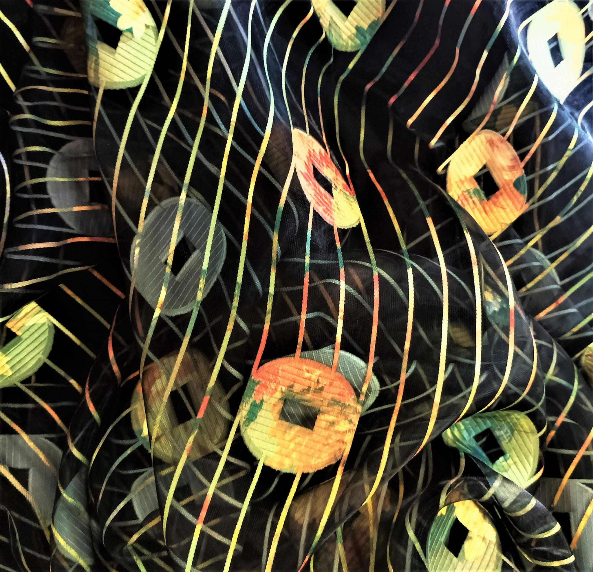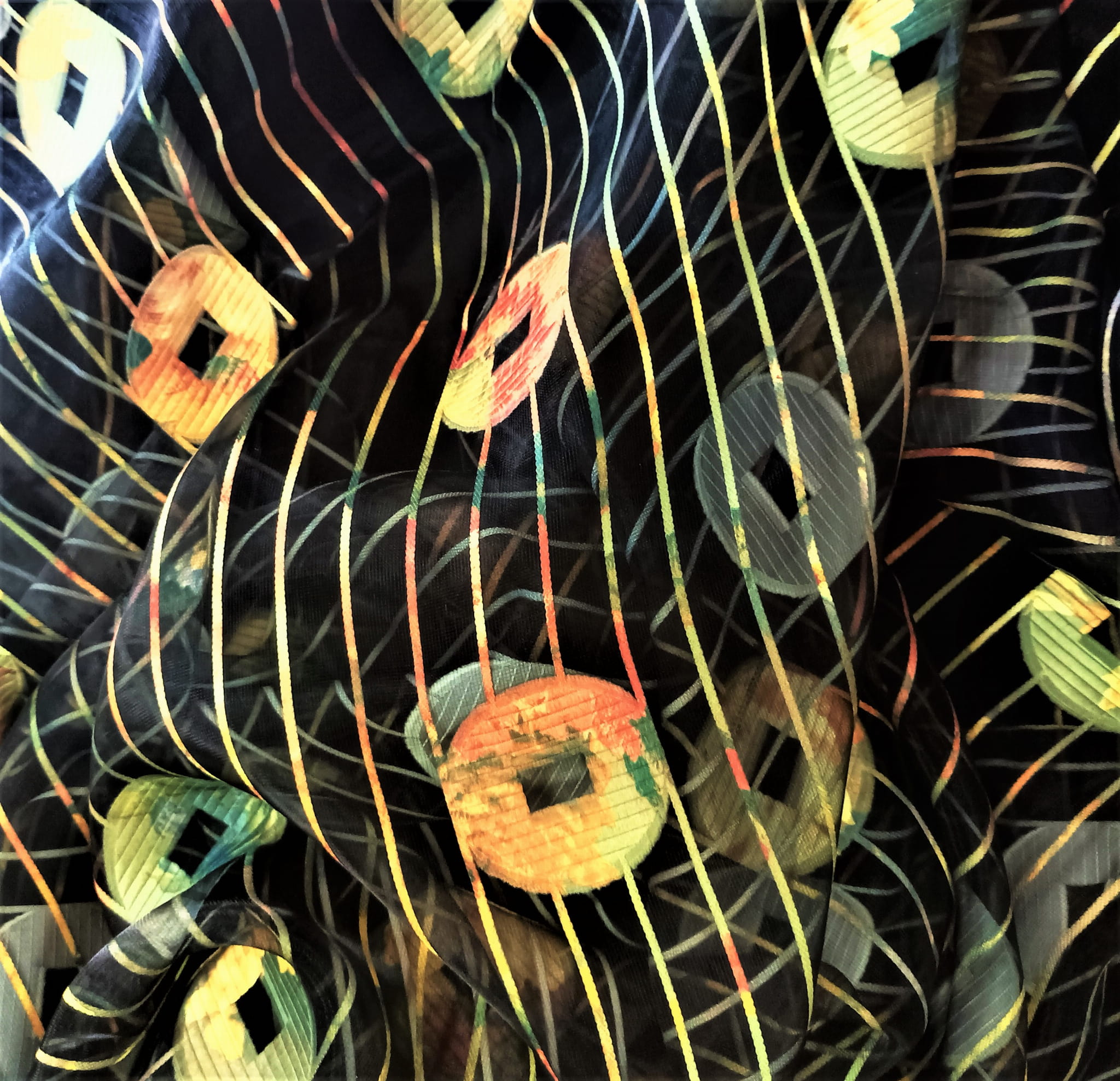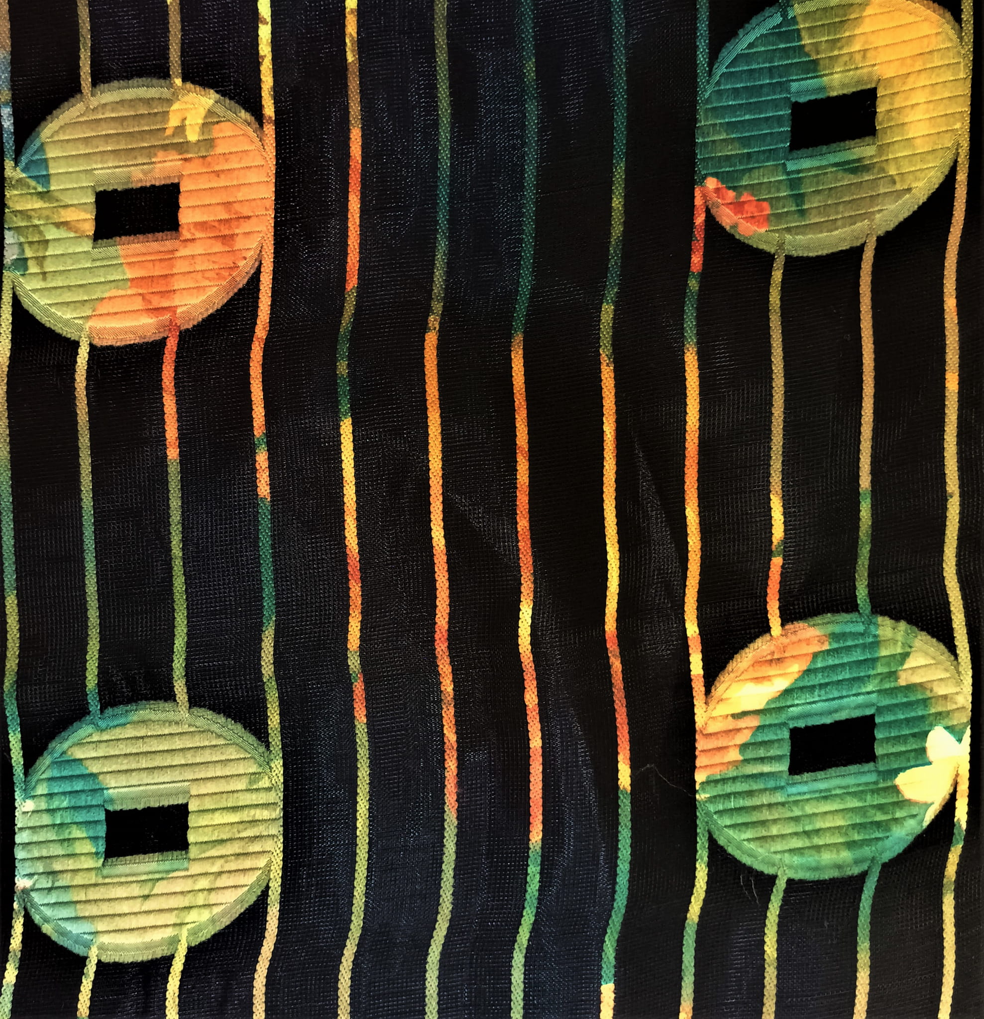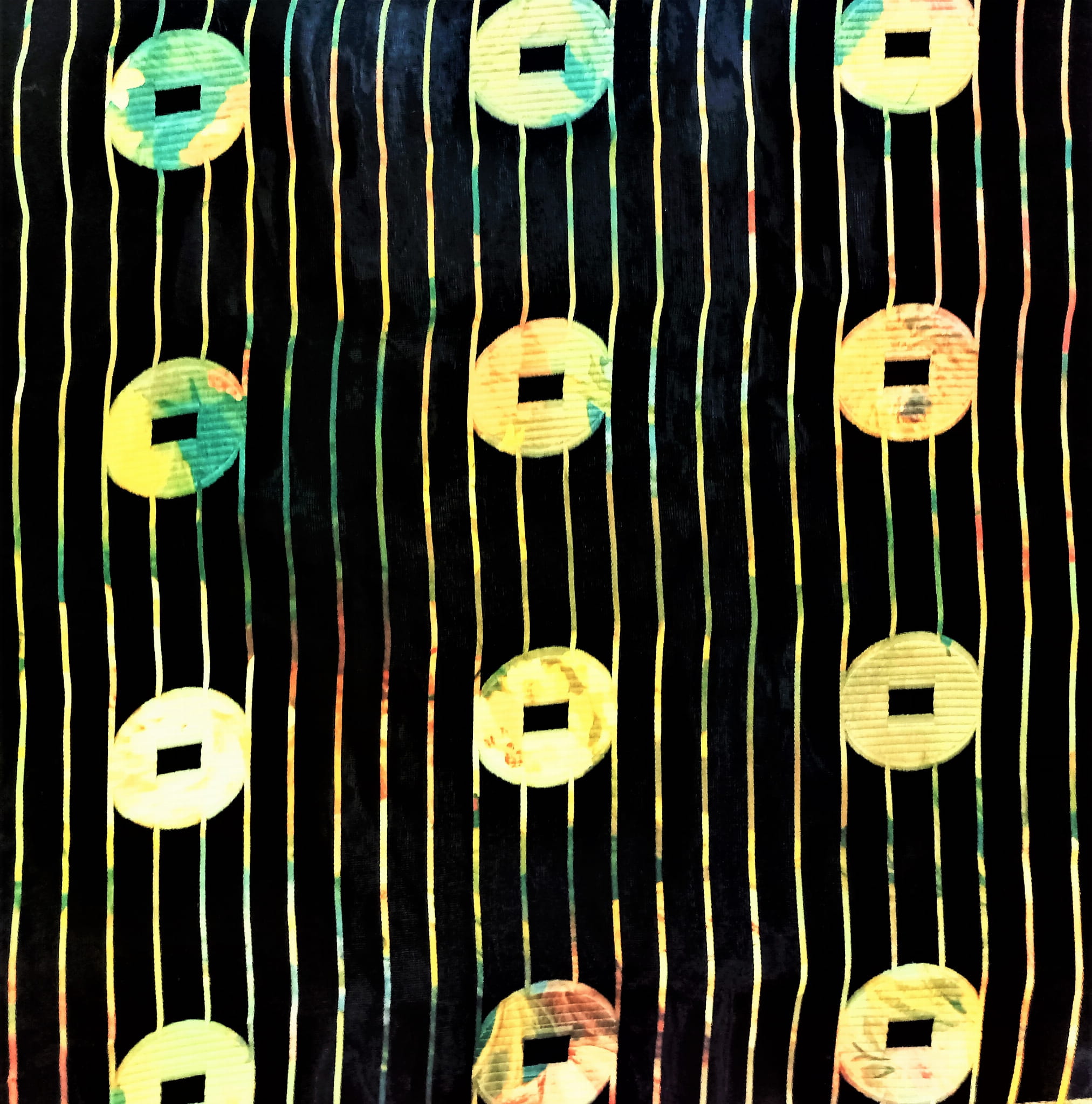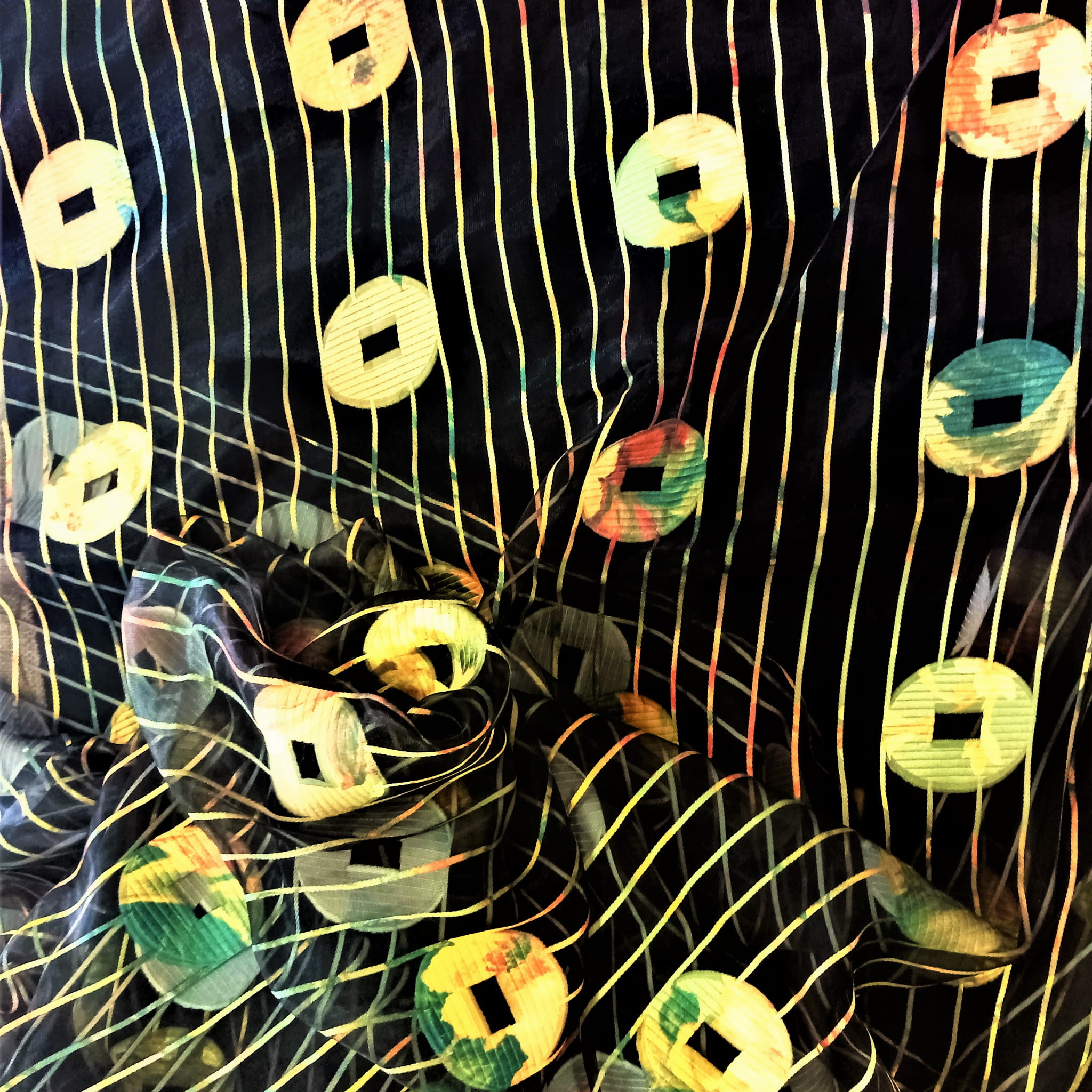STYLOWA ORGANTYNA Z PIĘKNYM HAFTEM W POSTACI PIONOWO UŁOŻONYCH CIENKICH PASECZKÓW Z ORNAMENTAMI W KSZTAŁCIE FANTAZYJNYCH KÓŁEK W ŁĄCZONEJ BARWIE ŻÓŁTEJ, ZIELONEJ I POMARAŃCZOWEJ NA CZARNYM TLE TO EFEKTOWNA ARANŻACJA W NOWOCZESNYM KLIMACIE. IDEALNIE SPRAWDZI SIĘ JAKO DEKORACYJNA FIRANA LUB ORYGINALNA, PEŁNA FINEZJI ZASŁONA. PERFEKCYJNIE WYKONANY, KUNSZTOWNY ORNAMENT TO GEOMETRYCZNA KOMPOZYCJA, KTÓRA ZACHWYCA ELEGANCKIM, NIEPOWTARZALNYM UROKIEM. DELIKATNA, LEKKA I ZWIEWNA ORGANTYNA PREZENTUJE SIĘ BARDZO NOWOCZEŚNIE I JEST REPREZENTACYJNĄ OZDOBĄ W MODNYM STYLU NOWOJORSKIM, MODERNISTYCZNYM ORAZ ART DECO.