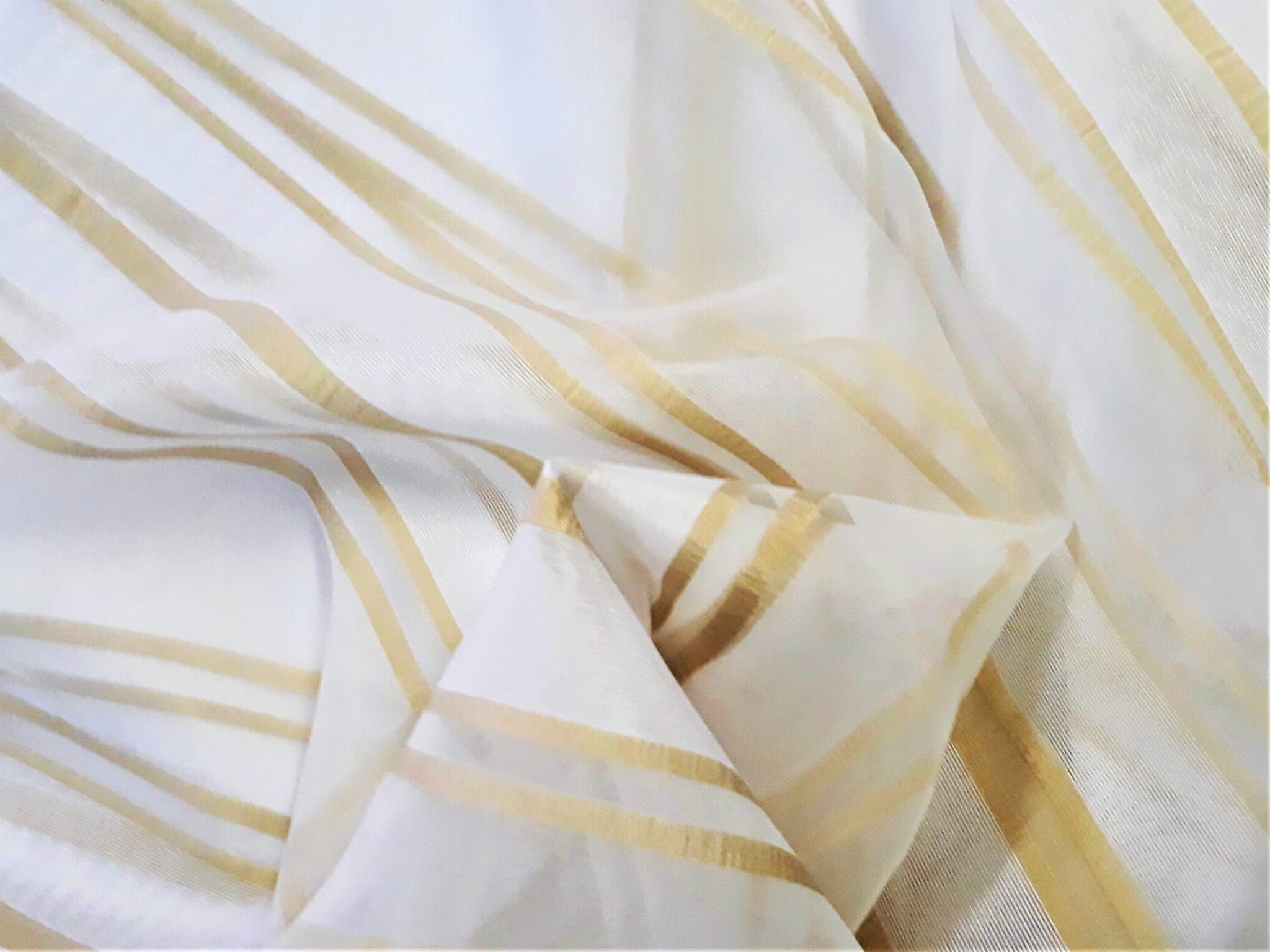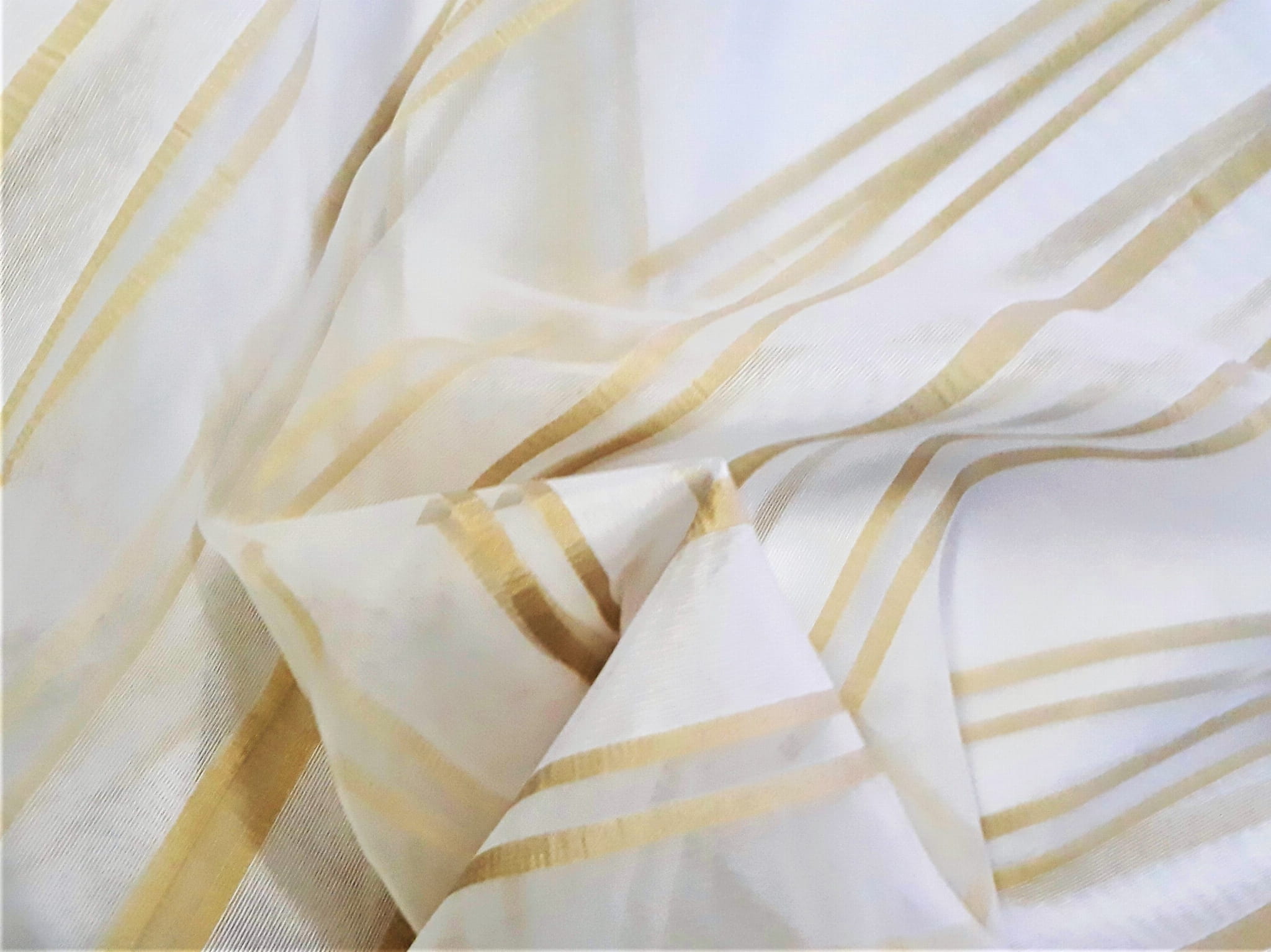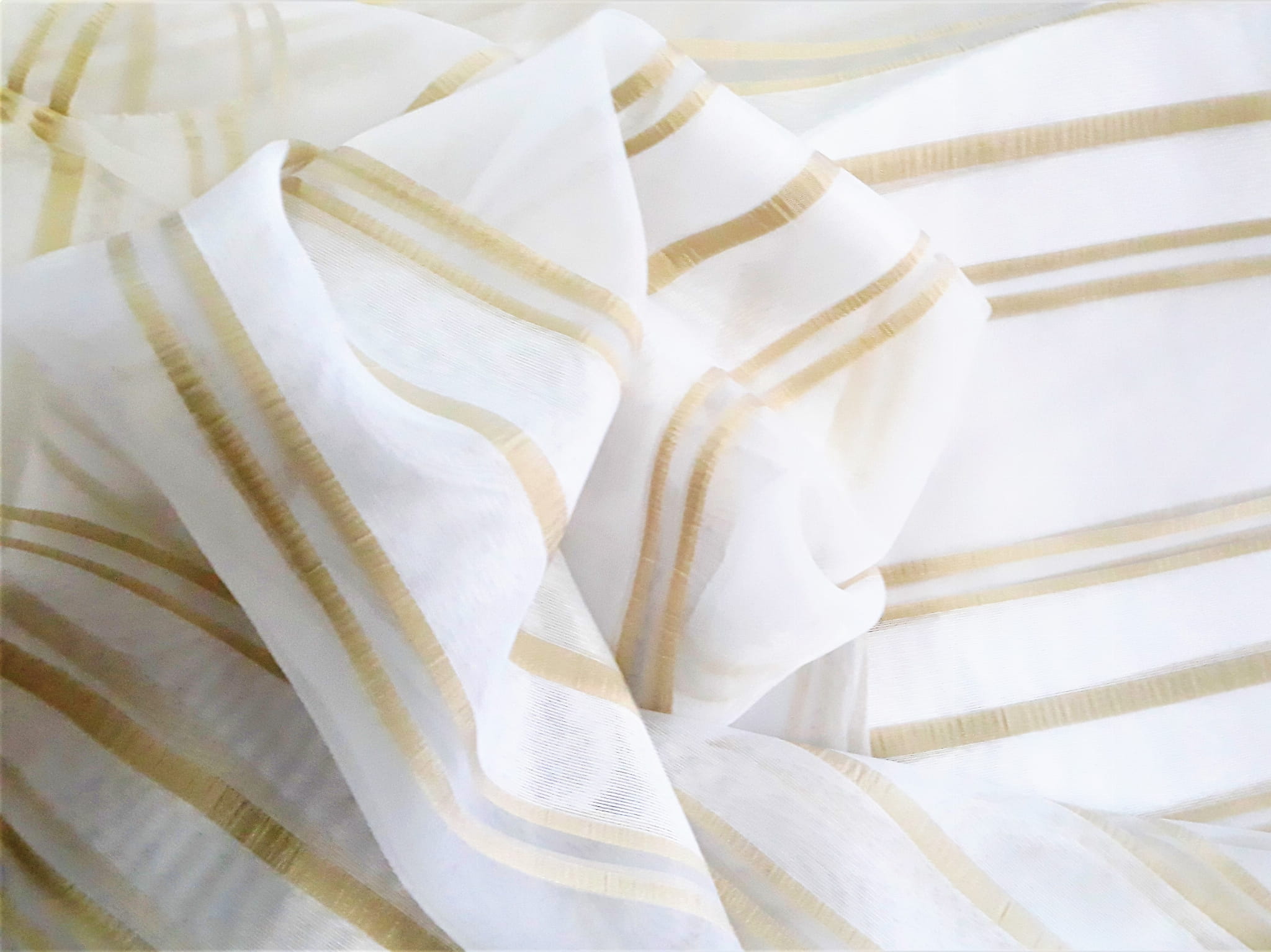 SUBTELNA TKANINA ZASŁONOWA WZÓR PASY POZIOME W DELIKATNYCH BARWACH ZŁOTEGO BEŻU I BIELI Z ELEMENTAMI PRZEZROCZYSTEJ FAKTURY SZEROKOŚĆ 190 CM PRODUCENT CHEMEKS PORAJ
