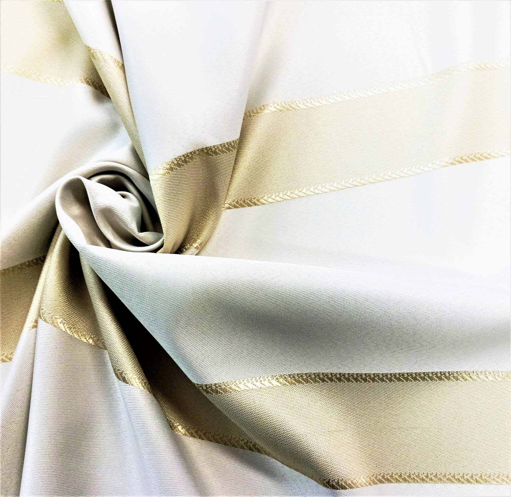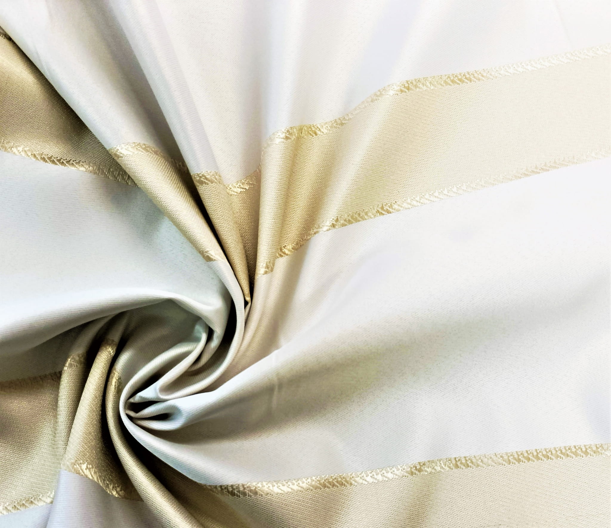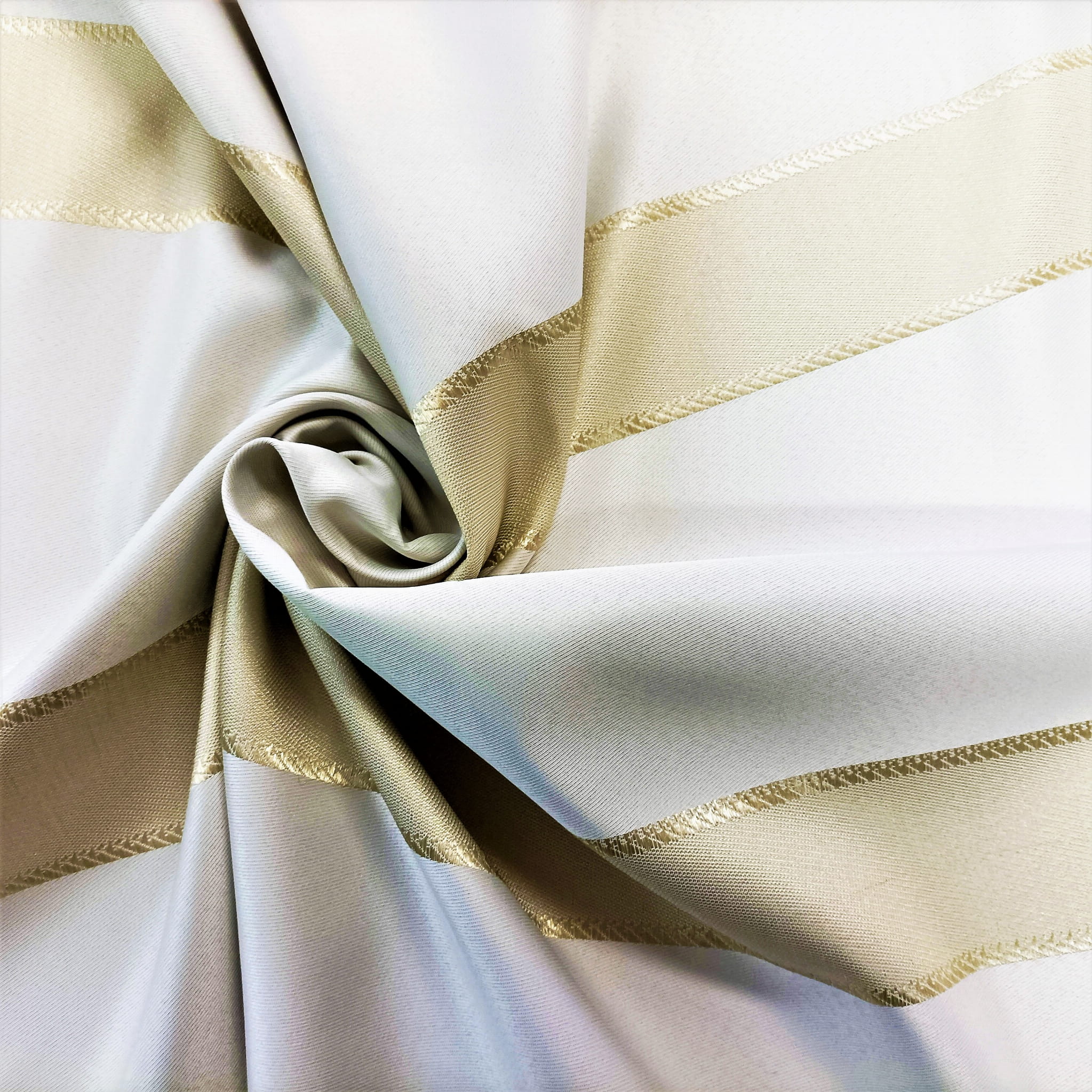 SZYKOWNA PLAMOODPORNA TKANINA ZASŁONOWA Z WZOREM W POSTACI SZEROKICH POZIOMO UŁOŻONYCH PASÓW W PIĘKNYCH BARWACH NATURALNEGO BEŻU NA KREMOWYM TLE Z WYKOŃCZENIAMI W ODCIENIU ZŁOTYM POŁYSK GLAMOUR SZEROKOŚĆ 170 CM PRODUCENT HAFT KALISZ