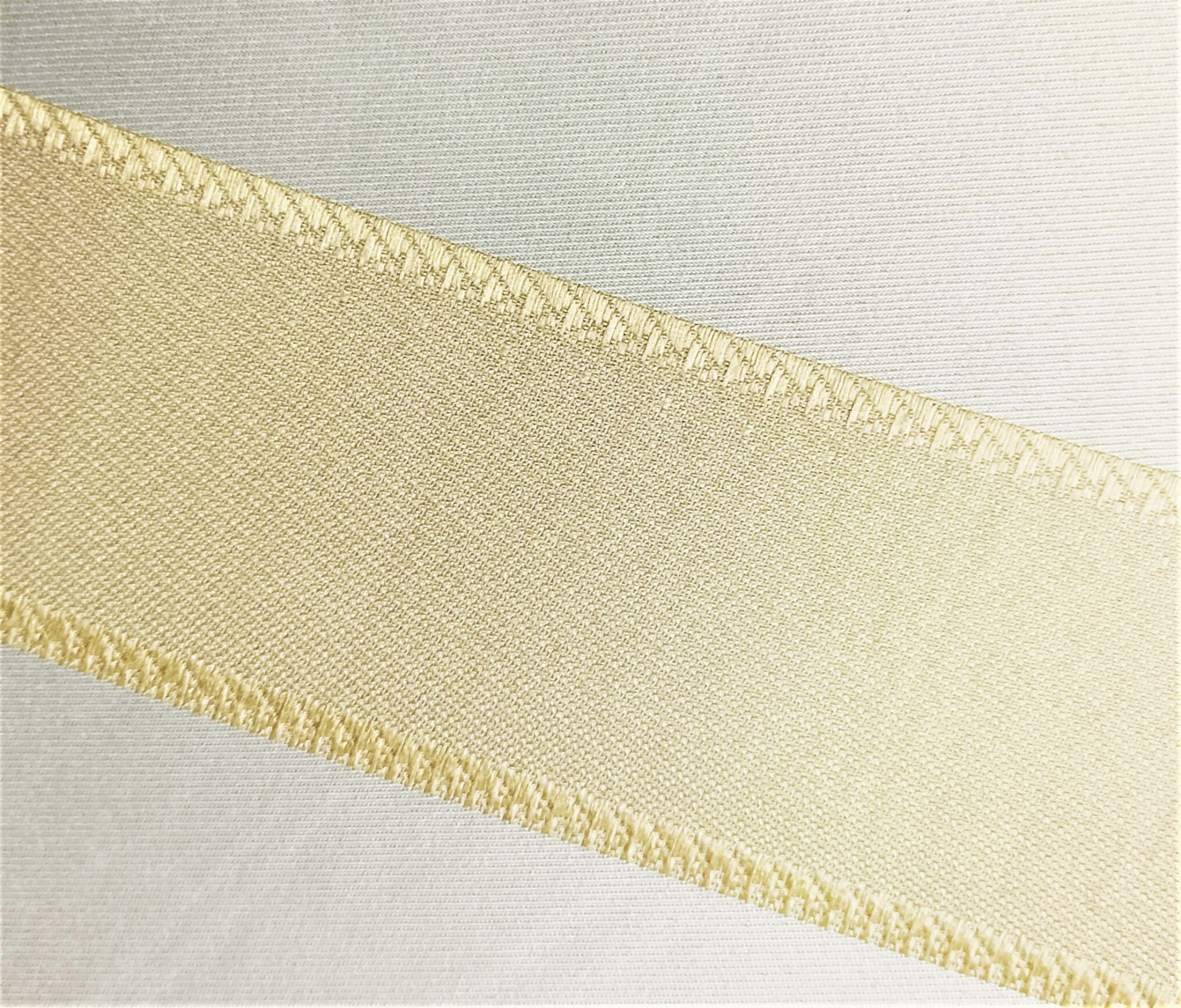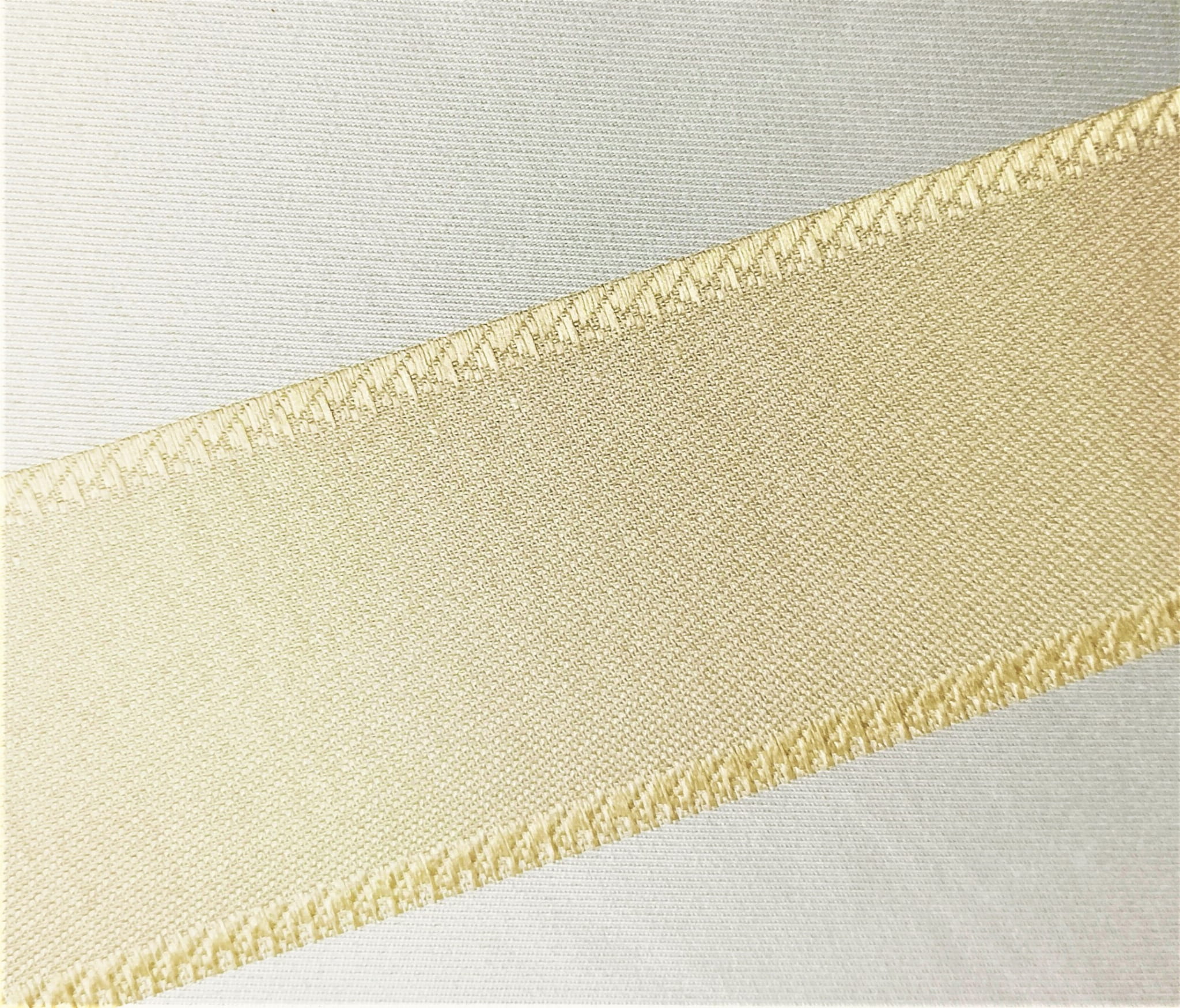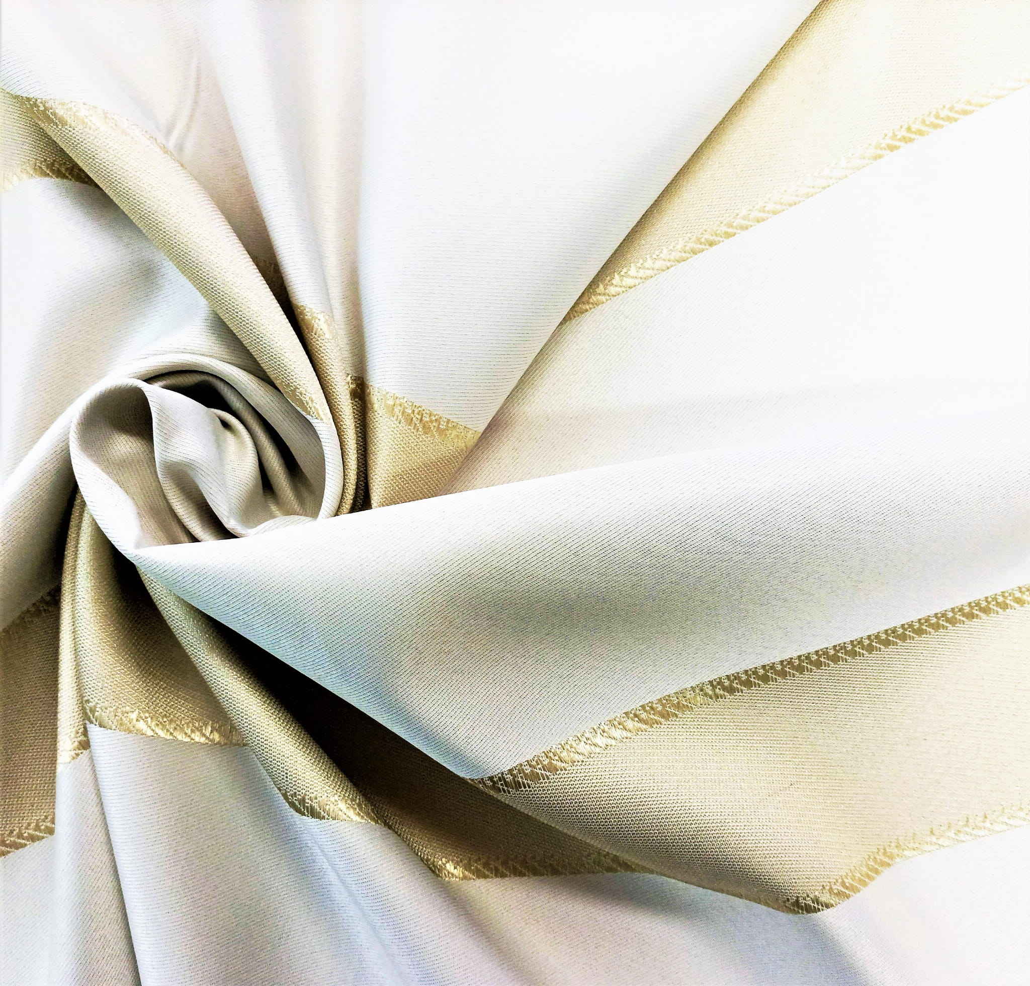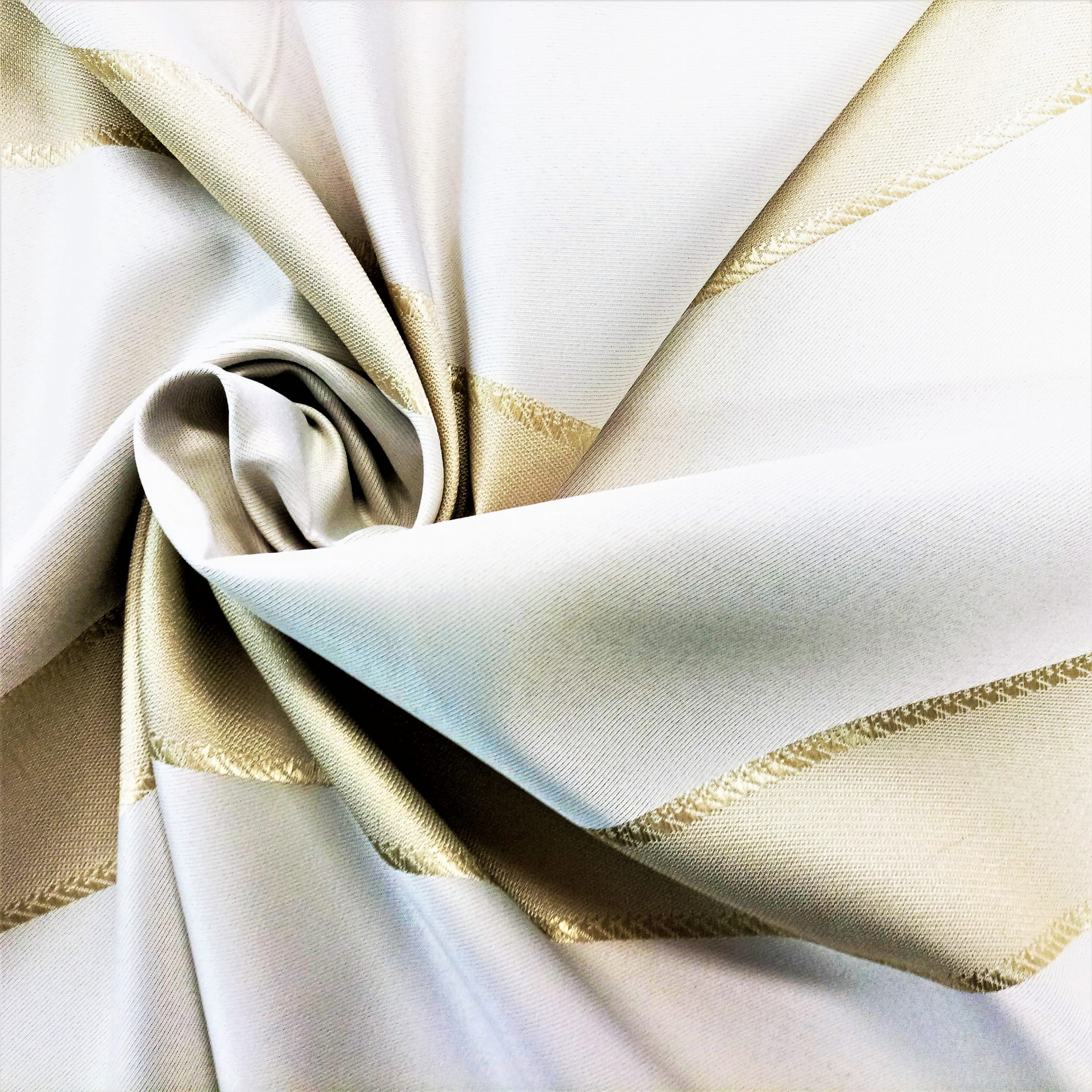 SZYKOWNA PLAMOODPORNA TKANINA ZASŁONOWA Z WZOREM W POSTACI SZEROKICH POZIOMO UŁOŻONYCH PASÓW W PIĘKNYCH BARWACH NATURALNEGO BEŻU NA KREMOWYM TLE Z WYKOŃCZENIAMI W ODCIENIU ZŁOTYM POŁYSK GLAMOUR SZEROKOŚĆ 170 CM PRODUCENT HAFT KALISZ