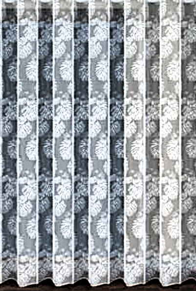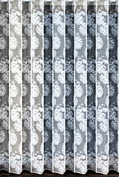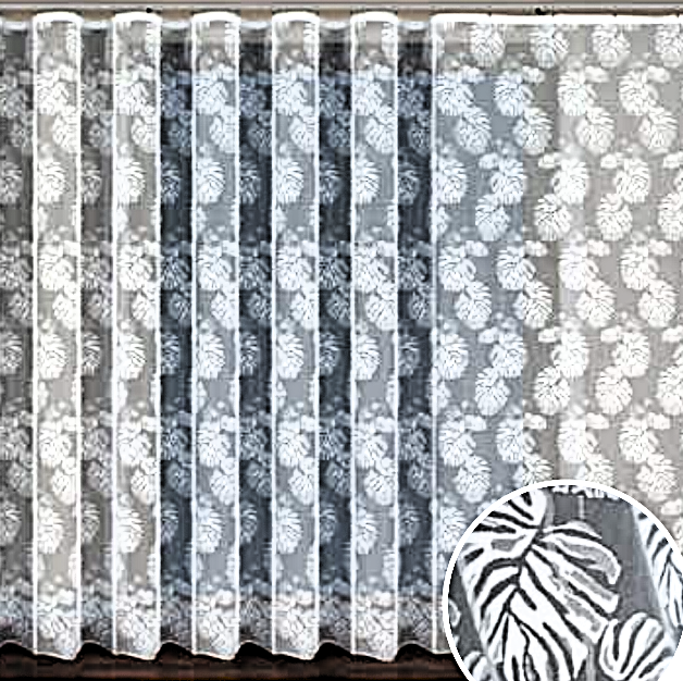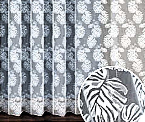 WYTWORNA FIRANA ŻAKARDOWA W KOLORZE BIAŁYM Z EFEKTOWNYM WZOREM FLORYSTYCZNYM DUŻE LIŚCIE MONSTERY WYSOKOŚĆ 180 CM 250 CM PRODUCENT HAFT KALISZ