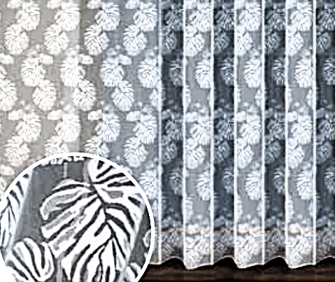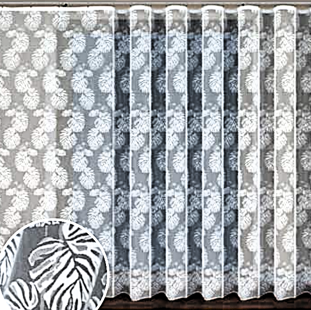 WYTWORNA FIRANA ŻAKARDOWA W KOLORZE BIAŁYM Z EFEKTOWNYM WZOREM FLORYSTYCZNYM W POSTACI DUŻYCH LIŚCI MONSTERY TO ELEGANCKIE ROZWIĄZANIE W STYLOWEJ ARANŻACJI OKNA CZYLI NOWOCZESNE WYDANIE PONADCZASOWEJ KLASYKI. ORYGINALNY, NIEZWYKLE MODNY WZÓR JEST WYRAZISTY W BARDZO SUBTELNY SPOSÓB, DZIĘKI CZEMU NIE PRZYTŁACZA WYSTROJU WNĘTRZA I EFEKTOWNIE PODKREŚLA JEGO ORYGINALNY CHARAKTER. NIEZWYKLE CIEKAWY ORNAMENT NADAJE LEKKOŚCI I SUBTELNOŚCI DEKORACJI OKIENNEJ ORAZ DODATKOWO PIĘKNIE PRZEPUSZCZA PROMIENIE SŁONECZNE ROZŚWIETLAJĄC I OCIEPLAJĄC POMIESZCZENIE. FIRANKA DOSKONALE SPRAWDZI SIĘ WE WNĘTRZACH URZĄDZONYCH W STYLU KLASYCZNYM, ROMANTYCZNYM, MINIMALISTYCZNYM, VINTAGE, GLAMOUR, RUSTYKALNYM ORAZ BOHO.
